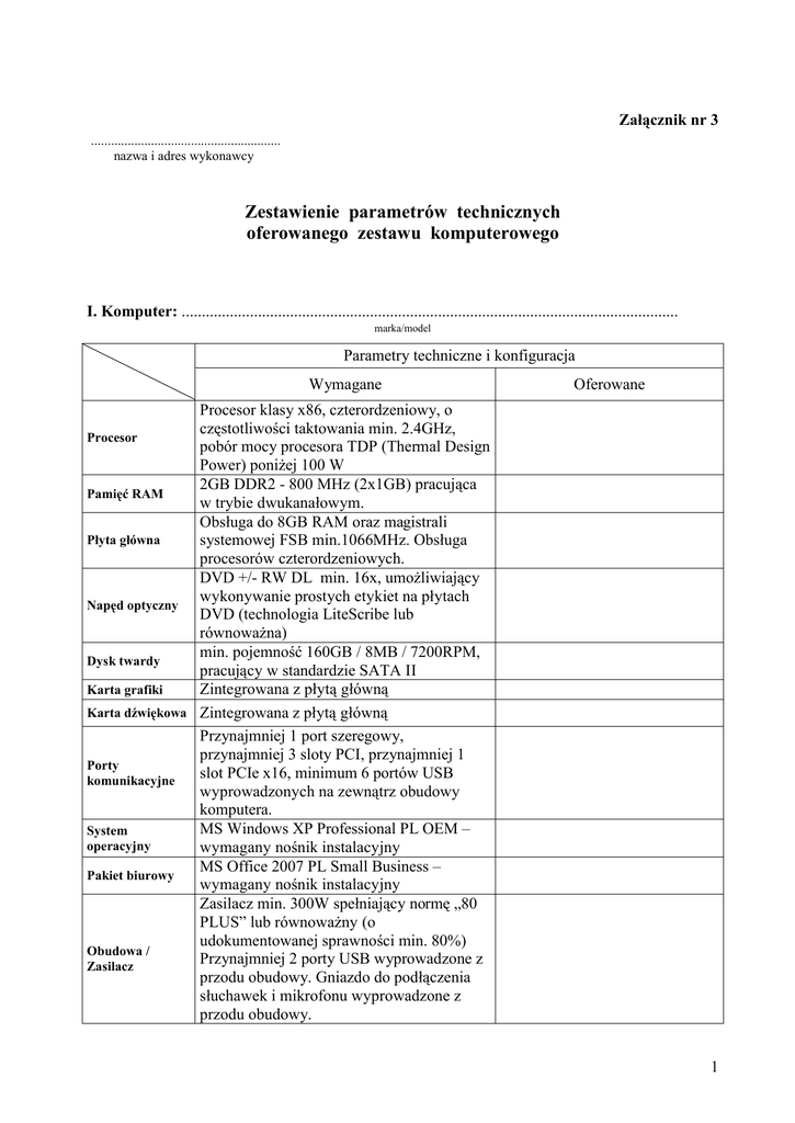 Załącznik nr 3 ......................................................... nazwa i adres wykonawcy Zestawienie parametrów technicznych oferowanego zestawu komputerowego I. Komputer: ............................................................................................................................ marka/model Parametry techniczne i konfiguracja Wymagane Oferowane Procesor klasy x86, czterordzeniowy, o częstotliwości taktowania min. 2.4GHz, Procesor pobór mocy procesora TDP (Thermal Design Power) poniżej 100 W 2GB DDR2 - 800 MHz (2x1GB) pracująca Pamięć RAM w trybie dwukanałowym. Obsługa do 8GB RAM oraz magistrali Płyta główna systemowej FSB min.1066MHz. Obsługa procesorów czterordzeniowych. DVD +/- RW DL min. 16x, umożliwiający wykonywanie prostych etykiet na płytach Napęd optyczny DVD (technologia LiteScribe lub równoważna) min. pojemność 160GB / 8MB / 7200RPM, Dysk twardy pracujący w standardzie SATA II Karta grafiki Zintegrowana z płytą główną Karta dźwiękowa Zintegrowana z płytą główną Przynajmniej 1 port szeregowy, przynajmniej 3 sloty PCI, przynajmniej 1 Porty slot PCIe x16, minimum 6 portów USB komunikacyjne wyprowadzonych na zewnątrz obudowy komputera. MS Windows XP Professional PL OEM – System operacyjny wymagany nośnik instalacyjny MS Office 2007 PL Small Business – Pakiet biurowy wymagany nośnik instalacyjny Zasilacz min. 300W spełniający normę „80 PLUS” lub równoważny (o udokumentowanej sprawności min. 80%) Obudowa / Przynajmniej 2 porty USB wyprowadzone z Zasilacz przodu obudowy. Gniazdo do podłączenia słuchawek i mikrofonu wyprowadzone z przodu obudowy. 1 Klawiatura Multimedialna Mysz optyczna z rolką LAN 1 Gbit 1. Oprogramowanie do nagrywania na nośników CD oraz DVD 2. Oprogramowanie umożliwiające Dodatkowe przeglądanie materiałów multimedialnych w oprogramowanie formacie DVD 3. Oprogramowanie antywirusowe AVAST licencja 3 lata. Komplet okablowania, Dodatkowe wyposażenie Listwa przeciwprzepięciowa 3 m Awaryjny zasilacz UPS o mocy nie Zasilanie mniejszej niż 700VA, z czasem przełączania awaryjne na zasilanie bateryjne max. 4ms Karta sieciowa II. Monitor LCD 19”: ........................................................................................................... marka/model Parametry techniczne Wymagane Wymagane Wielkość ekranu: 19 cali Proporcje monitora Rodzaj matrycy Jasność Kontrast 4:3 (rozdzielczość 1280x1024 lub większa) Kąty widzenia Czas reakcji Złącza Wbudowane głośniki TFT/TN min.300 cd/m2 min. 800:1 (jeśli dynamiczny, min 2000:1) min 160 ° zarówno w pionie jak i w poziomie max. 5 ms (GTG) D-Sub, DVI nie III. Drukarka laserowa kolorowa: ................................................................................................. marka/model Parametry techniczne Klasa produktu Druk w kolorze Wymagane Drukarka laserowa Tak Oferowane 2 Szybkość druku: A4, w czerni Szybkość druku: w kolorze, z normalną jakością, format A4 Do 12 str./min. lub więcej Maks. rozmiar nośnika A4 Jakość druku Do 600 x 600 dpi lub lepsza Standardowa pamięć Normatywny cykl pracy (miesięcznie, format A4) Standardowa pojemność podajnika (arkusze) Dodatkowy podajnik papieru Standardowa pojemność odbiornika (arkusze) 64 MB z możliwością rozbudowy Druk dwustronny Automatyczny, wbudowany Możliwość drukowania z kart pamięci przenośnych Tak (Compact Flash, SD, Memory Stick PRO) Wewnętrzny serwer druku Tak Złącza zewnętrzne USB, Ethernet 10/100 Mbps Obsługiwane systemy operacyjne MS Windows 98, Me, 2000, XP, Vista Do 10 str./min. lub więcej 35 000 lub więcej Do 250 szt. lub więcej Tak, min. 250 arkuszy Do 125 szt. lub więcej ...................................., dn. ...................... .................................................. (podpis upoważnionego przedstawiciela) 3