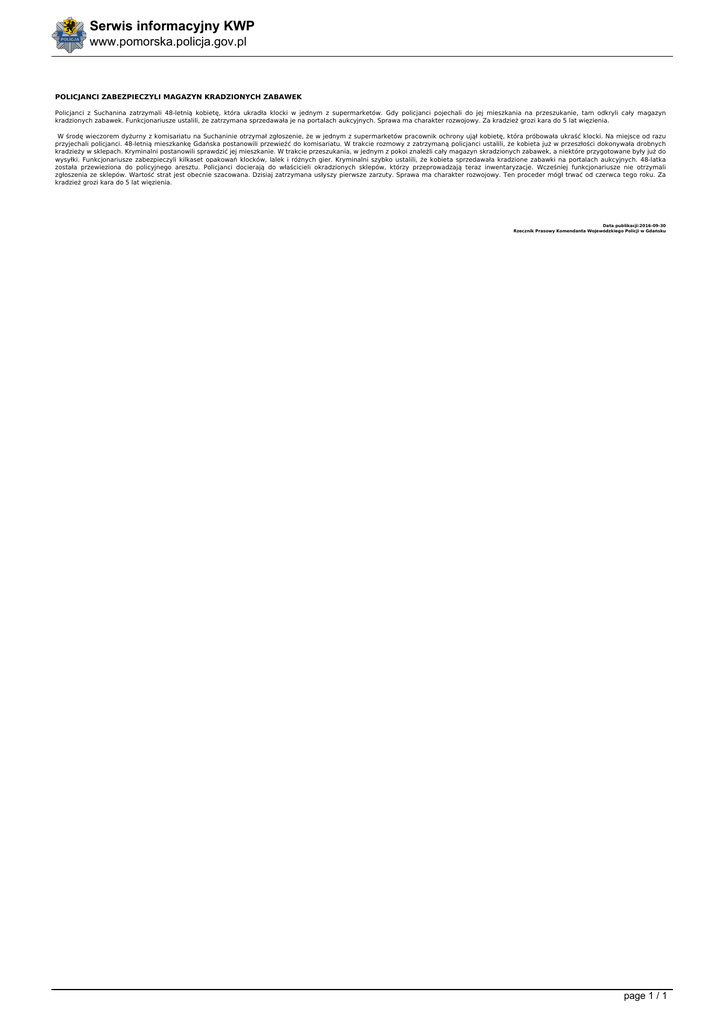 Serwis informacyjny KWP www.pomorska.policja.gov.pl POLICJANCI ZABEZPIECZYLI MAGAZYN KRADZIONYCH ZABAWEK Policjanci z Suchanina zatrzymali 48-letnią kobietę, która ukradła klocki w jednym z supermarketów. Gdy policjanci pojechali do jej mieszkania na przeszukanie, tam odkryli cały magazyn kradzionych zabawek. Funkcjonariusze ustalili, że zatrzymana sprzedawała je na portalach aukcyjnych. Sprawa ma charakter rozwojowy. Za kradzież grozi kara do 5 lat więzienia. W środę wieczorem dyżurny z komisariatu na Suchaninie otrzymał zgłoszenie, że w jednym z supermarketów pracownik ochrony ujął kobietę, która próbowała ukraść klocki. Na miejsce od razu przyjechali policjanci. 48-letnią mieszkankę Gdańska postanowili przewieźć do komisariatu. W trakcie rozmowy z zatrzymaną policjanci ustalili, że kobieta już w przeszłości dokonywała drobnych kradzieży w sklepach. Kryminalni postanowili sprawdzić jej mieszkanie. W trakcie przeszukania, w jednym z pokoi znaleźli cały magazyn skradzionych zabawek, a niektóre przygotowane były już do wysyłki. Funkcjonariusze zabezpieczyli kilkaset opakowań klocków, lalek i różnych gier. Kryminalni szybko ustalili, że kobieta sprzedawała kradzione zabawki na portalach aukcyjnych. 48-latka została przewieziona do policyjnego aresztu. Policjanci docierają do właścicieli okradzionych sklepów, którzy przeprowadzają teraz inwentaryzacje. Wcześniej funkcjonariusze nie otrzymali zgłoszenia ze sklepów. Wartość strat jest obecnie szacowana. Dzisiaj zatrzymana usłyszy pierwsze zarzuty. Sprawa ma charakter rozwojowy. Ten proceder mógł trwać od czerwca tego roku. Za kradzież grozi kara do 5 lat więzienia. Data publikacji:2016-09-30 Rzecznik Prasowy Komendanta Wojewódzkiego Policji w Gdańsku page 1 / 1 Powered by TCPDF (www.tcpdf.org)