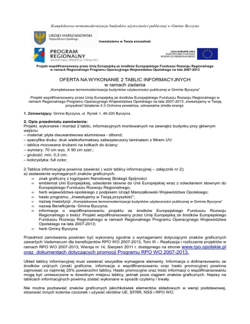 Kompleksowa termomodernizacja budynków uŜyteczności publicznej w Gminie Byczyna Inwestujemy w Twoją przyszłość Projekt współfinansowany przez Unię Europejską ze środków Europejskiego Funduszu Rozwoju Regionalnego w ramach Regionalnego Programu Operacyjnego Województwa Opolskiego na lata 2007-2013 OFERTA NA WYKONANIE 2 TABLIC INFORMACYJNYCH w ramach zadania „Kompleksowa termomodernizacja budynków uŜyteczności publicznej w Gminie Byczyna” Projekt współfinansowany przez Unię Europejską ze środków Europejskiego Funduszu Rozwoju Regionalnego w ramach Regionalnego Programu Operacyjnego Województwa Opolskiego na lata 2007-2013 „inwestujemy w Twoją przyszłość”działanie 4.3 Ochrona powietrza, odnawialne źródła energii. 1. Zamawiający: Gmina Byczyna, ul. Rynek 1, 46-220 Byczyna. 2. Opis przedmiotu zamówienia: Projekt, wykonanie i montaŜ 2 tablic, informacyjnych montowanych na zewnątrz budynku przy głównym wejściu: – materiał: płyta dwuwarstwowa aluminiowa - dibond; – specyfika druku: druk wielkoformatowy zabezpieczony laminatem z filtrem UV; – tablica mocowana śrubami na kołkach do ściany; – wymiary: 70 cm wys. X 90 cm szer.; – grubość: min. 0,3 cm; – kolorystyka: full color; 2.Tablica informacyjna powinna zawierać ( wzór tablicy informacyjnej – załącznik nr 2); a) zestawienie wymaganych znaków graficznych: • znak graficzny z logotypem Narodowej Strategii Spójności; • emblemat Unii Europejskiej, odwołanie słowne do Unii Europejskiej wraz z odwołaniem słownym do Europejskiego Funduszu Rozwoju Regionalnego; • herb województwa opolskiego z podpisem Urząd Marszałkowski Województwa Opolskiego; • hasło programu: „Inwestujemy w Twoją przyszłość”; • nazwę inwestycji: „Kompleksowa termomodernizacja budynków uŜyteczności publicznej w Gminie Byczyna” • nazwę Beneficjenta: Gmina Byczyna; • informacje o współfinansowaniu projektu ze środków Europejskiego Funduszu Rozwoju Regionalnego o treści: Projekt współfinansowany przez Unię Europejską ze środków Europejskiego Funduszu Rozwoju Regionalnego w ramach Regionalnego Programu Operacyjnego Województwa Opolskiego na lata 2007-2013; • herb Gminy Byczyna Przedmiot zamówienia powinien być wykonany zgodnie z wymaganiami dotyczącymi znaków graficznych zawartych Vademecum dla beneficjentów RPO WO 2007-2013, Tom III – Realizacja i rozliczenie projektów w ramach RPO WO 2007-2013, Wersja nr 14, Sierpień 2011 r. dostępnego na stronie www.rpo.opolskie.pl oraz dokumentach dotyczących promocji Programu RPO WO 2007-2013. Układ tablicy informacyjnej musi zawierać wszystkie wymagane elementy. Informacja o dofinansowaniu ze środków unijnych (znaki graficzne, informacja o współfinansowaniu oraz hasło promocyjne) powinna zajmować co najmniej 25% powierzchni tablicy. Hasło promocyjne oraz treść informacji o współfinansowaniu mogą być umieszczone w dowolnym miejscu tablicy, jednak poza ciągiem znaków graficznych. Napisy na tablicach informacyjnych powinny zostać wykonane w sposób czytelny i trwały. Nie moŜna pozbawiać znaków graficznych jakichkolwiek elementów składowych w wersji podstawowej, stosować innych kolorów czcionek i uŜywać skrótów UE, EFRR, NSS i RPO WO. Kompleksowa termomodernizacja budynków uŜyteczności publicznej w Gminie Byczyna Inwestujemy w Twoją przyszłość Projekt współfinansowany przez Unię Europejską ze środków Europejskiego Funduszu Rozwoju Regionalnego w ramach Regionalnego Programu Operacyjnego Województwa Opolskiego na lata 2007-2013 Opis sposobu obliczania ceny: Wykonawca określi cenę oferty brutto, która stanowić będzie wynagrodzenie ryczałtowe za realizację całego przedmiotu zamówienia. Obliczona cena musi być wyraŜona w PLN cyfrowo i słownie z wyodrębnieniem naleŜnego podatku VAT. Termin wykonania zamówienia: 28.09.2011 r. Miejsce, sposób i termin składania ofert: Ofertę naleŜy złoŜyć drogą elektroniczną na adres [email protected] w temacie wiadomości wpisując „Wykonanie i montaŜ tablicy informacyjnej” lub osobiście w Sekretariacie Urzędu Miejskiego w Byczynie (pok. 19), lub przesyłką pocztową na adres Gmina Byczyna, ul. Rynek 1, 46-220 Byczyna. Dokumenty naleŜy przesyłać w zaklejonej kopercie z dopiskiem „Wykonanie i montaŜ tablicy informacyjnej” w terminie do dnia: 16.09.2011 r. Za termin złoŜenia oferty uwaŜa się dzień jej faktycznego złoŜenia w siedzibie Zamawiającego. Oferta musi zawierać nazwę i adres wykonawcy. Musi być podpisana przez osobę lub osoby uprawnione lub upowaŜnione do występowania w imieniu wykonawcy. ZłoŜona oferta powinna obejmować: a) szczegółową kalkulację ceny obejmująca koszt: projektu tablicy, jej wykonania transportu i montaŜu, wg załącznika nr 1 do zapytania; b) dane techniczne dotyczące proponowanych materiałów, z których miałaby zostać wykonana tablica i sposób jej montaŜu, c) projekt tablicy w formie papierowej lub elektronicznej, Kryterium wyboru oferty: Przy wyborze oferty Zamawiający będzie się kierował następującymi kryteriami oceny ofert : Cena oferty: cena ofertowa brutto – 100% najniŜsza zaoferowana cena ( brutto) ilość punków = ------------------------------------------------ x 100 cena w badanej ofercie ( brutto) Warunki płatności: Za pomocą przelewu w terminie do 14 dni od dnia dostarczenia rachunku do siedziby Zamawiającego. Rozstrzygniecie postępowania i zlecenie realizacji zamówienia: O wynikach postępowania Zamawiający poinformuje oferentów biorących udział w postępowaniu na ich wniosek. Wykonawca, którego oferta zostanie wybrana zostanie powiadomiony przez Zamawiającego o miejscu i terminie podpisania umowy. W niniejszym postępowaniu nie mają zastosowania przepisy ustawy z dnia 29 stycznia 2004 r. Prawo zamówień publicznych. Dodatkowe informacje uzyskać moŜna pod numerem telefonu: Aleksandra Skoczylas 774134150 wew. 27 Kom