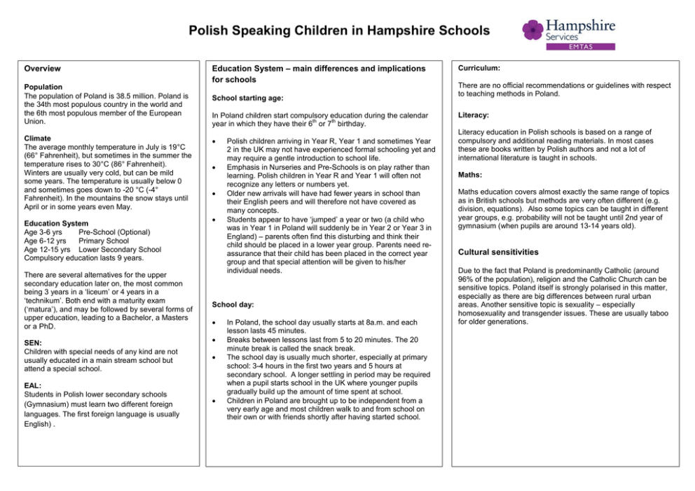 Polish Speaking Children in Hampshire Schools 1. Overview Population The population of Poland is 38.5 million. Poland is the 34th most populous country in the world and the 6th most populous member of the European Union. Climate The average monthly temperature in July is 19°C (66° Fahrenheit), but sometimes in the summer the temperature rises to 30°C (86° Fahrenheit). Winters are usually very cold, but can be mild some years. The temperature is usually below 0 and sometimes goes down to -20 °C (-4° Fahrenheit). In the mountains the snow stays until April or in some years even May. Education System Age 3-6 yrs Pre-School (Optional) Age 6-12 yrs Primary School Age 12-15 yrs Lower Secondary School Compulsory education lasts 9 years. There are several alternatives for the upper secondary education later on, the most common being 3 years in a ‘liceum’ or 4 years in a ‘technikum’. Both end with a maturity exam (‘matura’), and may be followed by several forms of upper education, leading to a Bachelor, a Masters or a PhD. SEN: Children with special needs of any kind are not usually educated in a main stream school but attend a special school. EAL: Students in Polish lower secondary schools (Gymnasium) must learn two different foreign languages. The first foreign language is usually English) . Education System – main differences and implications for schools School starting age: In Poland children start compulsory education during the calendar th th year in which they have their 6 or 7 birthday. Polish children arriving in Year R, Year 1 and sometimes Year 2 in the UK may not have experienced formal schooling yet and may require a gentle introduction to school life. Emphasis in Nurseries and Pre-Schools is on play rather than learning. Polish children in Year R and Year 1 will often not recognize any letters or numbers yet. Older new arrivals will have had fewer years in school than their English peers and will therefore not have covered as many concepts. Students appear to have ‘jumped’ a year or two (a child who was in Year 1 in Poland will suddenly be in Year 2 or Year 3 in England) – parents often find this disturbing and think their child should be placed in a lower year group. Parents need reassurance that their child has been placed in the correct year group and that special attention will be given to his/her individual needs. School day: In Poland, the school day usually starts at 8a.m. and each lesson lasts 45 minutes. Breaks between lessons last from 5 to 20 minutes. The 20 minute break is called the snack break. The school day is usually much shorter, especially at primary school: 3-4 hours in the first two years and 5 hours at secondary school. A longer settling in period may be required when a pupil starts school in the UK where younger pupils gradually build up the amount of time spent at school. Children in Poland are brought up to be independent from a very early age and most children walk to and from school on their own or with friends shortly after having started school. Curriculum: There are no official recommendations or guidelines with respect to teaching methods in Poland. Literacy: Literacy education in Polish schools is based on a range of compulsory and additional reading materials. In most cases these are books written by Polish authors and not a lot of international literature is taught in schools. Maths: Maths education covers almost exactly the same range of topics as in British schools but methods are very often different (e.g. division, equations). Also some topics can be taught in different year groups, e.g. probability will not be taught until 2nd year of gymnasium (when pupils are around 13-14 years old). Cultural sensitivities Due to the fact that Poland is predominantly Catholic (around 96% of the population), religion and the Catholic Church can be sensitive topics. Poland itself is strongly polarised in this matter, especially as there are big differences between rural urban areas. Another sensitive topic is sexuality – especially homosexuality and transgender issues. These are usually taboo for older generations. Parental involvement and attendance in Poland Parents are expected to be strongly involved in their child’s education. They will have access to everyday information from school with regards to what was done during the school day (as children bring home their notebooks from each topic). Attendance is usually not a concern to schools - school is only required to investigate if a child’s attendance falls below 50%. In a case of illness, or any other situation resulting in school absence, parents are not required to inform the school on the actual day. They should inform the school of the reason during the week after the child returns to school. No doctor’s notice is required. Language differences that may cause problems with Literacy Alphabet/Script: There are 32 letters in the Polish alphabet: 9 vowels and 23 constants. It is a Latin script with certain additional letters formed using diacritics: “kreska” (similar to acute accent): ć,ś,ź,ó,ł , “kropka: ż and “ogonek”: ą,ę. Some letters (x, q, v) are not considered to be Polish letters and are used only in foreign words and names. There are also many digraphs and trigraphs: dz dż, dź, cz, rz, sz, trz Spellings: Polish spelling is mostly phonemic – the written letters (or combinations of them) correspond in a consistent manner to the sounds (phonemes) of spoken Polish. Punctuation: Polish punctuation is similar to that of English. However there are more rigid rules concerning the use of commas. Subordinate clauses are almost always marked off with a comma, while it is normally considered incorrect to use a comma before a coordinating conjunction with the meaning ‘and’. Auxiliaries/negatives/questions/tenses: The Polish language has 3 tenses: Past, Present and Future. Questions (direct and indirect) are formed by placing the word “czy” at the