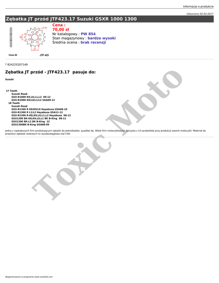 Informacje o produkcie Utworzono 02-03-2017 Zębatka JT przód JTF423.17 Suzuki GSXR 1000 1300 Cena : 70,00 zł Nr katalogowy : PW 854 Stan magazynowy : bardzo wysoki Średnia ocena : brak recenzji ? 824225207149 Zębatka JT przód - JTF423.17 pasuje do: M 17 Teeth Suzuki Road GSX-R1000 K9,L0,L1,L2 09-12 GSX-R1000 K9/L0/L1/L2 USA09-12 18 Teeth Suzuki Road GSX-R1300 R K8/K9/L0 Hayabusa USA08-10 GSX-R1300 R L1/L2 Hayabusa USA11-12 GSX-R1300 R-K8,K9,L0,L1,L2 Hayabusa 08-12 GSX1300 BK-K8,K9,L0,L1 BK B-King 08-11 GSX1300 BK-L2 BK B-King 12 GSX1300BK B-King USA08-09 ot o Suzuki To xi c jedna z największych firm produkujących zębatki do jednośladów, quadów itp. Wiele firm motocyklowych korzysta z ich produktów przy produkcji swoich motocykli. Materiał do produkcji zębatek stalowych to wysokowęglowa stal C49. Wygenerowano w programie www.oscGold.com