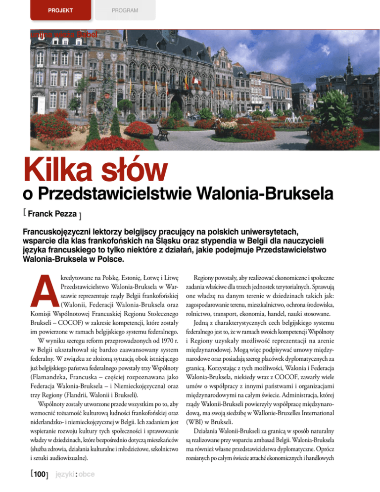 projekt program unijna wieża Babel Kilka słów o Przedstawicielstwie Walonia-Bruksela [ Franck Pezza ] Francuskojęzyczni lektorzy belgijscy pracujący na polskich uniwersytetach, wsparcie dla klas frankofońskich na Śląsku oraz stypendia w Belgii dla nauczycieli języka francuskiego to tylko niektóre z działań, jakie podejmuje Przedstawicielstwo Walonia-Bruksela w Polsce. A kredytowane na Polskę, Estonię, Łotwę i Litwę Przedstawicielstwo Walonia-Bruksela w Warszawie reprezentuje rządy Belgii frankofońskiej (Walonii, Federacji Walonia-Bruksela oraz Komisji Wspólnotowej Francuskiej Regionu Stołecznego Brukseli – COCOF) w zakresie kompetencji, które zostały im powierzone w ramach belgijskiego systemu federalnego. W wyniku szeregu reform przeprowadzonych od 1970 r. w Belgii ukształtował się bardzo zaawansowany system federalny. W związku ze złożoną sytuacją obok istniejącego już belgijskiego państwa federalnego powstały trzy Wspólnoty (Flamandzka, Francuska – częściej rozpoznawana jako Federacja Walonia-Bruksela – i Niemieckojęzyczna) oraz trzy Regiony (Flandrii, Walonii i Brukseli). Wspólnoty zostały utworzone przede wszystkim po to, aby wzmocnić tożsamość kulturową ludności frankofońskiej oraz niderlandzko- i niemieckojęzycznej w Belgii. Ich zadaniem jest wspieranie rozwoju kultury tych społeczności i sprawowanie władzy w dziedzinach, które bezpośrednio dotyczą mieszkańców (służba zdrowia, działania kulturalne i młodzieżowe, szkolnictwo i sztuki audiowizualne). [ 100 ] Regiony powstały, aby realizować ekonomiczne i społeczne zadania właściwe dla trzech jednostek terytorialnych. Sprawują one władzę na danym terenie w dziedzinach takich jak: zagospodarowanie terenu, mieszkalnictwo, ochrona środowiska, rolnictwo, transport, ekonomia, handel, nauki stosowane. Jedną z charakterystycznych cech belgijskiego systemu federalnego jest to, że w ramach swoich kompetencji Wspólnoty i Regiony uzyskały możliwość reprezentacji na arenie międzynarodowej. Mogą więc podpisywać umowy międzynarodowe oraz posiadają szereg placówek dyplomatycznych za granicą. Korzystając z tych możliwości, Walonia i Federacja Walonia-Bruksela, niekiedy wraz z COCOF, zawarły wiele umów o współpracy z innymi państwami i organizacjami międzynarodowymi na całym świecie. Administracja, której rządy Walonii-Brukseli powierzyły współpracę międzynarodową, ma swoją siedzibę w Wallonie-Bruxelles International (WBI) w Brukseli. Działania Walonii-Brukseli za granicą w sposób naturalny są realizowane przy wsparciu ambasad Belgii. Walonia-Bruksela ma również własne przedstawicielstwa dyplomatyczne. Oprócz rozsianych po całym świecie attaché ekonomicznych i handlowych projekt program unijna wieża Babel Regionu Walonii (w odniesieniu do liczby mieszkańców jest to największa na świecie sieć!) na czterech kontynentach działa szesnaście Przedstawicielstw Walonia-Bruksela. Siedziby znajdują się w: Brukseli (przy Unii Europejskiej), Berlinie, Hadze, Paryżu, Genewie, Bukareszcie, Warszawie, Pradze, Algierze, Tunisie, Rabacie, Kinszasie, Quebecu, Santiago de Chile, Hanoi i Pekinie. Pierwsza umowa o współpracy z Polską została podpisana w 1996 r. Przedstawicielstwo Walonia-Bruksela działa w Warszawie od 2002 r. i w tym roku świętuje swoje dziesięciolecie. Obecność Przedstawicielstwa Walonia-Bruksela w Warszawie w sposób niepodważalny świadczy o tym, że w swojej polityce zagranicznej Walonia-Bruksela traktuje w sposób priorytetowy stosunki z Polską. Dodatkowo oprócz Biura Radcy Ekonomicznego i Handlowego Regionu Walonii w Warszawie działa Biuro Promocji Turystyki Walonii-Brukseli, którego celem jest rozwijanie wymiany turystycznej między obydwoma krajami. Współpraca ta wpisuje się w długoterminowe partnerstwo stron, które dobrze się znają, mają te same prawa i współdziałają w atmosferze zaufania i przyjaźni. Prowadzona jest w różnych, uznawanych za priorytetowe dziedzinach, w tym w zakresie wszystkich poziomów edukacji. Oprócz wymiany naukowej uniwersytetów i innych szkół wyższych z Polski i Walonii-Brukseli na uwagę zasługuje wsparcie dla nauczania j. polskiego w Brukseli i w Walonii oraz j. francuskiego w Polsce. Walonia-Bruksela posiada bowiem sieć lektorów j. francuskiego na Uniwersytetach Warszawskim, Jagiellońskim, Śląskim i A. Mickiewicza w Poznaniu oraz lektorkę w liceum dwujęzycznym w Krakowie, która prężnie wspiera też klasy frankofońskie na Śląsku. Innym ważnym punktem naszej współpracy jest kultura, która tradycyjnie stanowi najbardziej rozpoznawaną sferę działań Przedstawicielstwa Walonia-Bruksela w Warszawie. Trudno jest wymienić wszystkie projekty, jakie zrealizowaliśmy w dziedzinie kina, malarstwa i sztuk plastycznych, tańca, muzyki, teatru, książki, w tym szczególnie komiksu. Nauczyciele języka francuskiego mogą korzystać w swojej pracy z materiałów opracowanych w ramach tych przedsięwzięć oraz uczestniczyć wraz z całymi klasami w wydarzeniach organizowanych w wielu miastach Polski. Tradycyjnie organizujemy wiele wydarzeń w marcu, miesiącu Frankofonii. Stanowi ona bowiem jeden z najważniejszych kierunków polityki międzynarodowej Federacji Walonia-Bruksela, która zresztą udziela trzeciego co do wielkości wsparcia finansowego Międzynarodowej Organizacji Frankofonii (OIF). Dywan z kwiatów na rynku Starego Miasta w Brukseli Podsumowując, Przedstawicielstwo pragnie być w centrum wydarzeń i projektów, które partnerzy z Polski i Belgii frankofońskiej wspólnie realizują we wszystkich dziedzinach politycznych, ekonomicznych, naukowych, technicznych, kulturalnych i edukacyjnych. Aktualny Program Wykonawczy Umowy o współpracy między Polską i Walonią-Brukselą obejmuje lata 2011-2013. Pod koniec 2013 r. komisja mieszana dwóch partnerskich rządów będzie obradowała po raz szósty. Opracuje ona na lata 2014-2016 Pro