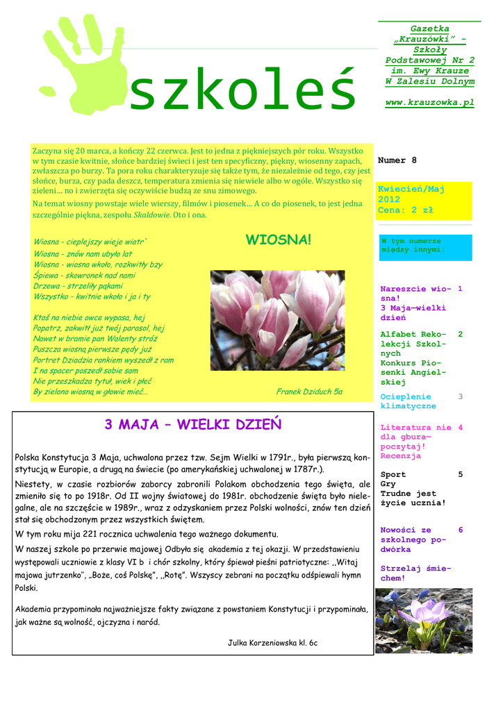 szkoleś Gazetka „Krauzówki” Szkoły Podstawowej Nr 2 im. Ewy Krauze W Zalesiu Dolnym www.krauzowka.pl Zaczyna się 20 marca, a kończy 22 czerwca. Jest to jedna z piękniejszych pór roku. Wszystko Numer 8 w tym czasie kwitnie, słońce bardziej świeci i jest ten specyficzny, piękny, wiosenny zapach, zwłaszcza po burzy. Ta pora roku charakteryzuje się także tym, że niezależnie od tego, czy jest słońce, burza, czy pada deszcz, temperatura zmienia się niewiele albo w ogóle. Wszystko się Kwiecień/Maj zieleni… no i zwierzęta się oczywiście budzą ze snu zimowego. Na temat wiosny powstaje wiele wierszy, filmów i piosenek… A co do piosenek, to jest jedna szczególnie piękna, zespołu Skaldowie. Oto i ona. Wiosna - cieplejszy wieje wiatr` Wiosna - znów nam ubyło lat Wiosna - wiosna wkoło, rozkwitły bzy Śpiewa - skowronek nad nami Drzewa - strzeliły pąkami Wszystko - kwitnie wkoło i ja i ty Ktoś na niebie owce wypasa, hej Popatrz, zakwitł już twój parasol, hej Nawet w bramie pan Walenty stróż Puszcza wiosną pierwsze pędy już Portret Dziadzia rankiem wyszedł z ram I na spacer poszedł sobie sam Nie przeszkadza tytuł, wiek i płeć By zielono wiosną w głowie mieć… WIOSNA! 2012 Cena: 2 zł W tym numerze między innymi: Nareszcie wio- 1 sna! 3 Maja—wielki dzień Franek Dziduch 5a 3 MAJA – WIELKI DZIEŃ Polska Konstytucja 3 Maja, uchwalona przez tzw. Sejm Wielki w 1791r., była pierwszą konstytucją w Europie, a drugą na świecie (po amerykańskiej uchwalonej w 1787r.). Niestety, w czasie rozbiorów zaborcy zabronili Polakom obchodzenia tego święta, ale zmieniło się to po 1918r. Od II wojny światowej do 1981r. obchodzenie święta było nielegalne, ale na szczęście w 1989r., wraz z odzyskaniem przez Polski wolności, znów ten dzień stał się obchodzonym przez wszystkich świętem. W tym roku mija 221 rocznica uchwalenia tego ważnego dokumentu. W naszej szkole po przerwie majowej Odbyła się akademia z tej okazji. W przedstawieniu występowali uczniowie z klasy VI b i chór szkolny, który śpiewał pieśni patriotyczne: ,,Witaj majowa jutrzenko’’, „Boże, coś Polskę”, ,,Rotę”. Wszyscy zebrani na początku odśpiewali hymn Polski. Alfabet Rekolekcji Szkolnych Konkurs Piosenki Angielskiej 2 Ocieplenie klimatyczne 3 Literatura nie 4 dla gbura— poczytaj! Recenzja Sport Gry Trudne jest życie ucznia! 5 Nowości ze szkolnego podwórka 6 Strzelaj śmiechem! Akademia przypominała najważniejsze fakty związane z powstaniem Konstytucji i przypominała, jak ważne są wolność, ojczyzna i naród. 8 Julka Korzeniowska kl. 6c 9 0 ALFABET REKOLEKCJI SZKOLNYCH Rekolekcje szkolne odbyły się w końcu marca. Proponujemy nasz „alfabet” rekolekcji. B jak Bóg-główny temat rekolekcji (i całej nauki Kościoła) F jak film - był trzeciego dnia rekolekcji i bardzo podobał się uczestnikom. Opowiadał o zmartwychwstaniu Pana Jezusa oczami jego uczniów. Była to kreskówka. O jak ojciec - był głównym tematem 1-go dnia rekolekcji. Brat Paweł robił ilustracje. P jak początek - pierwszego dnia rekolekcji rozmawialiśmy o początku świata i ludzkości. Omawialiśmy, jak powstała ziemia i jak Bóg ją stworzył. P jak podnoszenie rąk - podczas mszy ksiądz kilka razy podnosi ręce i je rozkłada, a to wszystko na znak tego, że Pan Jezus umarł na krzyżu, a jego ręce były przybite do krzyża w postaci rozłożonej. S jak stworzenie człowieka - dowiedzieliśmy się, że Pan Bóg stworzył nas, ,,Bo chciał” i tym musimy się kierować; nie mamy przymusu niczego robić, jeżeli nie chcemy. Z jak zmartwychwstanie - zmartwychwstanie jest to ponowne ożywienie. Chrystus zmartwychwstał i nadal jest wśród nas. O tym mówiliśmy trzeciego dnia rekolekcji. Każdy śpiewa po angielsku RELACJA WIDZA: RELACJA UCZESTNIKA: W DNIU 15 marca w naszej szkole odbył się konkurs piosenki angielskiej. Były to eliminacje szkolne, które decydowały o tym, kto wystąpi w gminnych zawodach. Występowali uczniowie z klas 4 i 5. Piosenki były bardzo przyjemne. Uczestnicy chcieli wystąpić jak najlepiej, toteż starali się jak najbardziej. Widać było, że włożyli w to dużo pracy. Poza tym trzeba wytrzymać stres i tremę, co jest najtrudniejsze, a jeszcze pojawiają się myśli, że coś się stanie, że zapomni się słów i każdy się wtedy będzie śmiać. Można zwariować! Najgorzej mają osoby, które śpiewały jako pierwsze. Sam rok temu występowałem jako pierwszy. Z klasy 5a brali udział: Franek Dziduch, Nina Gąsowska, Agata Włodarczyk i Marta Stryjecka. Zaśpiewano m.in. piosenki: „Use somebody”, „Someone like you”, „New age” itp. W pracach jury uczestniczyły: pani Wilczyńska, pani Krawczyk i pani Płaszewska. ŚPIEWAŁEM piosenkę Total Eclips of the Heart autorstwa Bonnie Tyler. Konkurencja była bardzo zacięta… Numer 8 Wszystko wyszło świetnie! Nigdy tego nie zapomnę… Opowiem o moich przygotowaniach. Piosenkę wybrałem już dawno, z pół roku temu. Zaciekawiła mnie ta piosenka, bo śpiewano ją (w polskiej wersji) w spektaklu Taniec Wampirów. Wykonanie było świetne, sam więc to zaczynałem coraz częściej nucić i w końcu odkryłem angielską wersję. Od razu się zacząłem uczyć tej piosenki. I wyszło! Poziom był wysoki – takie opinie słyszało się po koncercie. Nikt nie fałszował, wszyscy pamiętali tekst. Członkinie jury co chwila nuciły piosenki razem z zawodnikami i szeptały do siebie oraz coś pisały na kartkach. Atmosfera za kulisami była bardzo miła. Wszyscy siebie mówili, że świetnie ktoś zaśpiewał Rok temu, gdy sam brałem udział, strasznie się stresowałem. albo już jest wygranym. Pocieszała nas też pani Małgorzata Podraza, która wszystko prowadziła. Myślałem, że będę najgorszy, że inni będą się ze mnie śmiać. Uczestnicy z tego roku też pewnie się z tym męczyli. Pomagała się odstresować. Ja ciągle powtarzałem sobie tekst. W