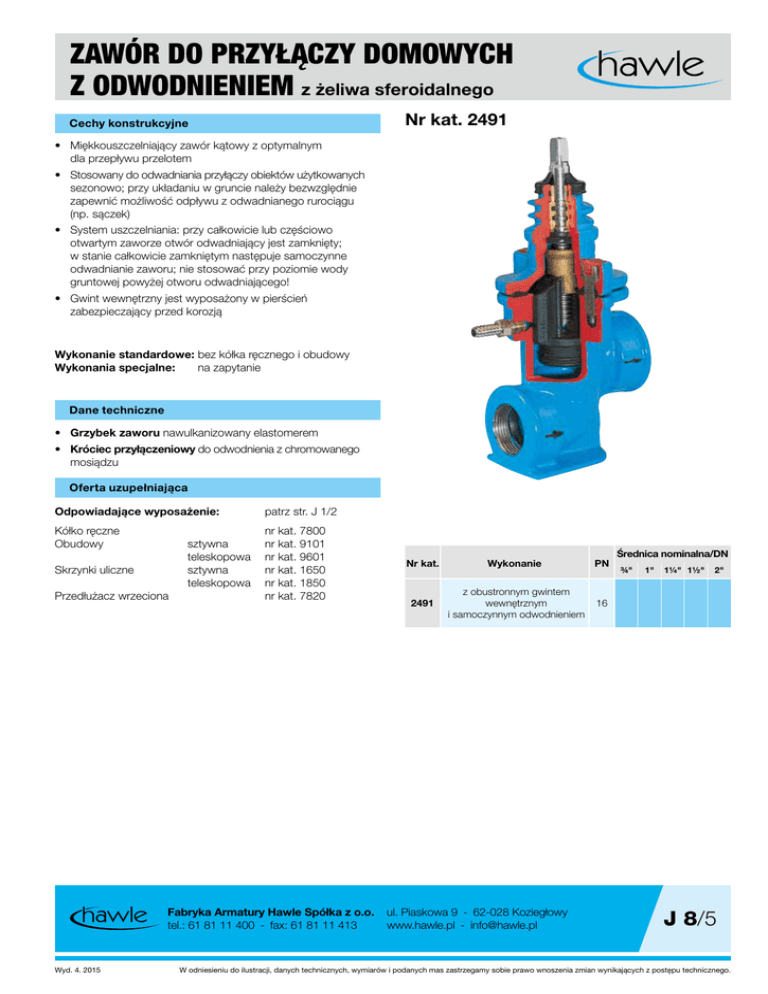 ZAWÓR DO PRZYŁĄCZY DOMOWYCH Z ODWODNIENIEM z żeliwa sferoidalnego Nr kat. 2491 Cechy konstrukcyjne • Miękkouszczelniający zawór kątowy z optymalnym dla przepływu przelotem • Stosowany do odwadniania przyłączy obiektów użytkowanych sezonowo; przy układaniu w gruncie należy bezwzględnie zapewnić możliwość odpływu z odwadnianego rurociągu (np. sączek) • System uszczelniania: przy całkowicie lub częściowo otwartym zaworze otwór odwadniający jest zamknięty; w stanie całkowicie zamkniętym następuje samoczynne odwadnianie zaworu; nie stosować przy poziomie wody gruntowej powyżej otworu odwadniającego! • Gwint wewnętrzny jest wyposażony w pierścień zabezpieczający przed korozją Wykonanie standardowe:bez kółka ręcznego i obudowy Wykonania specjalne: na zapytanie Dane techniczne • Grzybek zaworu nawulkanizowany elastomerem • Króciec przyłączeniowy do odwodnienia z chromowanego mosiądzu Oferta uzupełniająca Odpowiadające wyposażenie: patrz str. J 1/2 Kółko ręczne Obudowy sztywna teleskopowa Skrzynki uliczne sztywna teleskopowa Przedłużacz wrzeciona nr kat. 7800 nr kat. 9101 nr kat. 9601 Nr kat. nr kat. 1650 nr kat. 1850 nr kat. 7820 Fabryka Armatury Hawle Spółka z o.o. tel.: 61 81 11 400 - fax: 61 81 11 413 Wyd. 4. 2015 2491 Wykonanie PN z obustronnym gwintem wewnętrznym i samoczynnym odwodnieniem 16 ul. Piaskowa 9 - 62-028 Koziegłowy www.hawle.pl - [email protected] Średnica nominalna/DN ¾" 1" 1¼" 1½" 2" J 8/5 W odniesieniu do ilustracji, danych technicznych, wymiarów i podanych mas zastrzegamy sobie prawo wnoszenia zmian wynikających z postępu technicznego. ZAWÓR DO PRZYŁACZY DOMOWYCH Z ODWODNIENIEM z żeliwa sferoidalnego Nr kat. 2491 z odejściem gwintowanym i samoczynnym odwodnieniem Przestrzegać kierunku zabudowy (strzałka) na korpusie. Odwadnianie instalacji od strony odbiorcy tylko w pozycji zaworu całkowicie zamkniętego. Przy układaniu w gruncie należy zwrócić uwagę, aby otwór odwadniający nie znajdował się poniżej lustra wody gruntowej lub aby przy montażu w studzience nie był zalewany (brak zabezpieczenia otworu spustowego przed cofającą się wodą!). Ø d1 DN H1 DN H c a L „otwarty” „zamknięty” Kierunek odwadniania Koniecznie przestrzegać kierunku przepływu Moment obrotowy otwierania: max. 40 Nm Moment obrotowy zamykania: max. 40 Nm DN Gwint wewnętrzny (EN ISO 228) L H H1 ¾" 115 207 41 Wrzeciono Zawór a c Ø d1 Masa kg 2,40 1" 115 207 41 2,30 1¼" 130 243 50 3,90 1½" 130 243 50 4,00 2" 140 243 50 4,50 J 8/6 10,3 Fabryka Armatury Hawle Spółka z o.o. tel.: 61 81 11 400 - fax: 61 81 11 413 20 16 ul. Piaskowa 9 - 62-028 Koziegłowy www.hawle.pl - [email protected] W odniesieniu do ilustracji, danych technicznych, wymiarów i podanych mas zastrzegamy sobie prawo wnoszenia zmian wynikających z postępu technicznego. Wyd. 4. 2015 Zasuwy do przyłączy domowych przegląd Cechy konstrukcyjne Zasuwy z żeliwa sferoidalnego • Klin z nawulkanizowaną powłoką elastomerową z gładkim i wolnym przelotem • Zasuwa kołnierzowa • Zasuwa ze złączem ISO • Zasuwa z przyłączem gwintowanym • Zasuwa do zgrzewania • Zawór kątowy • Zawór do przyłączy domowych z odwodnieniem • 2 uszczelki typu O-ring osadzone w tulei z mosiądzu • Łożysko wrzeciona z mosiądzu • Przyłącze śrubowe do obudów • 100% przydatność do zabudowy w ziemi • Przy nasadkach odcinających, niewykorzystane zwoje gwintu zewnętrznego muszą po montażu zostać zabezpieczone przed korozją zgodnie z obowiązującymi ogólnymi regułami montażu Dane techniczne 4 11 5 7 6 8 2 10 9 3 , 2Korpus (1), pokrywa (2) z żeliwa sferoidalnego EN-GJS-400-18, 1 zgodnie z EN 1563, zabezpieczone zewnątrz i wewnątrz antykorozyjnie (epoksydowane) wg wytycznych GSK (patrz str. 4) 3 Klin z mosiądzu CuZn40Pb2, powłoka na klinie - elastomer 4 Wrzeciono ze stali nierdzewnej 1.4162 z walcowaną i polerowaną dogniataniem powierzchnią uszczelniającą 5 Łożysko wrzeciona (tuleja do uszczelek typu O-ring) z mosiądzu 6 Uszczelka typu O-ring z elastomeru 7 Uszczelka zwrotna z elastomeru 8 Pierścień zabezpieczający ze stali nierdzewnej 9 Uszczelka pokrywy z elastomeru 10 Śruby z łbem walcowym o gnieździe sześciokątnym wpuszczone i dzięki masie zalewowej oraz płaskiej uszczelce pokrywy całkowicie chronione przed korozją 11 Pierścień zabezpieczający przed zanieczyszczeniem z elastomeru Cechy konstrukcyjne Zasuwy z żywicy POM • Klin z nawulkanizowaną powłoką elastomerową z gładkim i wolnym przelotem • Zasuwa ze złączem ISO • Zasuwa Hawle-Fit • Zasuwa z przyłączem gwintowanym • Zasuwa do zgrzewania • Zawór kątowy • 2 uszczelki typu O-ring osadzone w tulei z mosiądzu • Pokrywa połączona z korpusem w procesie zgrzewania rotacyjnego • Zabezpieczenie przed przeciążeniem • Przyłącze śrubowe do obudów • 100% przydatność do zabudowy w ziemi 1 3 8 5 5 7 4 6 2 Dane techniczne 1 Korpus z żywicy POM 2 Klin z mosiądzu CuZN40Pb2 powłoka na klinie - elastomer 3 Wrzeciono ze stali nierdzewnej z walcowaną i polerowaną dogniataniem powierzchnią uszczelniającą 4 Łożysko wrzeciona z mosiądzu 5 Uszczelka typu O-ring z elastomeru 6 Uszczelka zwrotna z elastomeru 7 Zabezpieczenie przed przeciążeniem ze stali nierdzewnej 8 Pierścień zabezpieczający przed zanieczyszczeniem z elastomeru Fabryka Armatury Hawle Spółka z o.o. tel.: 61 81 11 400 - fax: 61 81 11 413 Wyd. 4. 2015 1 ul. Piaskowa 9 - 62-028 Koziegłowy www.hawle.pl - [email protected] J 2/1 W odniesieniu do ilustracji, danych technicznych, wymiarów i podanych mas zastrzegamy sobie prawo wnoszenia zmian wynikających z postępu technicznego. NOTATKI J 2/2 Fabryka Armatury Hawle Spółka z o.o. tel.: 61 81 11 400 - fax: 61 81 11 413 ul. Piaskowa 9 - 62-028 Koziegłowy www.hawle.pl - [email protected] W odniesieniu do ilustracji, danych technicznych, wymiarów i podanych mas zastrzegamy sobie prawo wno