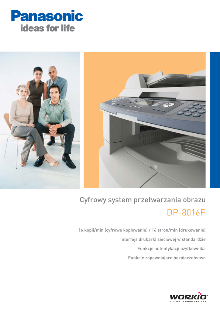Cyfrowy system przetwarzania obrazu DP-8016P 16 kopii/min (cyfrowe kopiowanie) / 16 stron/min (drukowanie) Interfejs drukarki sieciowej w standardzie Funkcje autentykacji użytkownika Funkcje zapewniające bezpieczeństwo 8016 Witamy w świecie cyfrowych systemów WORKiO, gdzie przenikają się cyfrowa komunikacja i nowoczesna technologia przetwarzania obrazu. Wnosząc do twojego biura wszechstronność, niezawodność, łatwość obsługi oraz większe możliwości połączeń sieciowych, WORKiO jest prawdziwym „kombajnem biurowym” dla twojej firmy. DP-8016P nie jest wyjątkiem w tej kategorii. > Kompaktowe, łatwo dostępne rozwiązanie do pracy w grupie Łącząc funkcje kopiarki i drukarki w jednym urządzeniu obsługującym format A3 DP-8016P jest praktycznym, obniżającym koszty rozwiązaniem przepływu dokumentów w biurze.Dzięki standardowemu interfejsowi Ethernet 10/100 DP-8016P może też służyć jako drukarka sieciowa. Dzięki przeniesieniu tacy odbiorczej „do wnętrza” i pozbawieniu wystających tac podajników, WORKiO oszczędza cenną biurową przestrzeń. Pozwala to na umieszczenie go wszędzie, nawet na małym biurku. wszechstronne drukowanie > Szybka drukarka sieciowa Po podłączeniu standardowym interfejsem Ethernet 10Base-T/100Base-TX do Drukowanie PCL*1 lokalnej sieci komputerowej DP-8016P może służyć jako szybka, wysokiej jakości laserowa drukarka, drukująca dokumenty w formacie do A3. Nawet przy szybkości 16 stron (formatu A4) na minutę, utrzymuje jakość wydruku 1200 dpi x 600 dpi*2. Takie podłączenie zapewnia zdolność drukowania dla wszystkich komputerów PC pracujących w sieci LAN, obniżając ogólne koszty. Wyposażone jest standardowo *1 Wymagany opcjonalny moduł kontrolera wydruku także w interfejs USB pozwalający na podłączenie do pojedynczego komputera PC. Poza tym DP-8016P jest wyposażone w szereg funkcji ułatwiających pracę biurową, takich jak tryb plakatowy oraz wydruki N-na-1. *2 - Z opcjonalnym kontrolerem wydruku > Informacja o zakończeniu wydruku Monitor stanu urządzenia umożliwia śledzenie bieżącego stanu DP-8016P bez konieczności wstawania od biurka. Jeżeli kończy się toner lub podajnik papieru jest pusty, użytkownicy mogą bezzwłocznie podjąć odpowiednie czynności, co jest szczególnie istotne, gdy ma się do czynienia z napiętymi terminami. wszechstronne kopiowanie > Kopiowanie 2-na-1 > Szybka, cyfrowa kopiarka Jest to wygodna funkcja redukująca zużycie DP-8016P kopiuje z prędkością 16 stron na minutę w doskonałej jakości 600 dpi. papieru dzięki umieszczaniu dwu zmniejszonych Kopiuje dokumenty w formacie A3. Zwiększa również wydajność pracy dzięki funkcjom: oryginałów na jednym arkuszu kopii. podwójnego naświetlania, kopiowania 2 na 1, cyfrowego SkyShot i obracania obrazu. Jako wyposażenie dodatkowe dostępny jest automatyczny podajnik oryginałów (ADF) przyspieszający kopiowanie wielokartkowych dokumentów. Standardowe elektroniczne sortowanie eliminuje ręczne układanie kopii. Oprócz rozdzielczości 600 x 600 dpi i 256-poziomowej skali odcieni szarości DP-8016P zapewnia stałą, optymalną jakość obrazu, dzięki ciągłemu monitorowaniu temperatury i wilgotności otoczenia oraz dostosowywaniu się do tych warunków. > Funkcja cyfrowy SkyShot > Podwójne naświetlanie Funkcja ta , podczas wykonywania kopii z otwartą Korzystając z funkcji „Double Exposure” (podwójne naświetlanie), użytkownik może pokrywą, likwiduje zbędne i pochłaniające toner wykonywać dobrej jakości kopie dwustronnych dokumentów na jednej stronie, pozbawione czarnych obramowań, nawet przy kopiowaniu z otwartą pokrywą oryginałów. czarne obramowanie. Funkcja ta jest wyjątkowo wygodna, gdy kopiuje się małe dwustronne dokumenty, takie jak dowody osobiste, karty ubezpieczeniowe, czeki, pokwitowania itp. Orygina³ Obszar skanowania Tryb Cyfrowy SkyShot wy³¹czony Wykorzystanie funkcji podwójnego naświetlania 1. In case of emergency please call 012-345-6789 2. If lost or stolen please call 101-112-1314 Tryb Cyfrowy SkyShot w³¹czony obszar skanowania oryginału Pierwsze skanowanie Obraz 1 bezpieczeństwo „cyfrowej ery” > Informacja o użytkownikach -Autentykacja użytkowników-*3 Autentykacja użytkowników nie tylko poprawia bezpieczeństwo i ułatwia administrację dzięki wykorzystaniu tych samych nazw użytkowników oraz haseł co zarejestrowane w bazie danych serwera usług katalogowych Windows, ale także umożliwia zaprogramowanie ograniczeń dostępu do funkcji kopiowania i drukowania, pozwalając na efektywniejsze zarządzanie kosztami oraz kontrolę wykorzystania. *3 - Wymaga posiadania środowiska sieciowego opartego o usługi katalogowe. Funkcja ta jest niedostępna w niektórych krajach. > Wielopoziomowe zabezpieczenia -Skrzynka pocztowaFunkcja skrzynki pocztowej pozwala użytkownikom na zapisywanie zadań drukowania w pamięci urządzenia. Dzięki temu, są oni w stanie drukować swoje dokumenty w późniejszym czasie, co pomaga odseparować ich wydruki od pozostałych. -Bezpieczna skrzynka pocztowaPoufne dokumenty mogą być tymczasowo przechowywane w bezpiecznej skrzynce pocztowej. Użytkownicy mogą bezpiecznie wydrukować swoje dokumenty w wybranym czasie po wprowadzeniu odpowiedniego hasła. obszar skanowania oryginału Drugie skanowanie Obraz 2 2 obrazy na pojedynczym arkuszu Wyposa¿enie dodatkowe modelu DP-8016P Automatyczny podajnik dokumentów DA-AS181 Twardy dysk Modu³ twardego dysku DA-HD18 (Wymaga dodatkowej pamiêci graficznej) Dodatkowa pamiêæ graficzna Opcje drukarki/drukarki sieciowej 16 MB / 64 MB / 128 MB DA-SM16B / DA-SM64B / DA-SM28B Dodatkowa pamiêæ F-ROM (Niedostêpna w niektórych krajach) Oprogramowanie Drukarka PCL Modu³ kontrolera drukarki DA-PC820 DA-EM600 System archiwizowania W niektórych krajach dodatkowe rozszerzenie F-ROM nie jest wymagane. Oprogramowanie do archiwizowania DA-WA10 (Wymaga zainstalowania dodatkowych modu