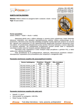 infolinia: 801-005-885 [email protected] www.egsystem-sklep.pl KARTA KATALOGOWA Nazwa: Włókno szklane do zaciągania kabli w zestawie: wózek + okucia Typ: EG-pręt-zestaw Forma sprzedaży: Zestaw (włókno + wózek + okucie + szekla) Najwyższej jakości pręt z włókna szklanego w osnowie żywicy poliestrowej. Dzięki doskonale dobranym materiałom oraz specjalnie zaprojektowanemu oplotowi włókna umieszczonego na ich powierzchni, oferowane przez nas pręty posiadają szczególnie wysoką odporność zarówno na zrywanie jak i zginanie oraz wyboczenia! W celu zagwarantowania długotrwałej żywotności oferowanym przez nas prętom, ich powierzchnię zabezpieczono grubą warstwa ochronną wykonaną z wysoce odpornego na ścieranie poliamidu! Tak profesjonalnie przygotowany produkt poradzi sobie w najcięższych warunkach na jakie może być narażony podczas układania kabli! Oferowane pręty wyposażono w dwie mosiężne tuleje początkowe z gwintem M12, a także szeklę wraz z główką prowadzącą. Pręty sprzedawane są na profesjonalnych, stalowych, lakierowanych proszkowo wózkach obowiązkowym wyposażeniu przy prowadzeniu prac związanych z zaciąganiem kabli. Parametry techniczne wspólne dla poszczególnych średnic: Numer katalogowy EG-pręt-zestaw_6_100 EG-pręt-zestaw_6_150 EG-pręt-zestaw_6_200 EG-pręt-zestaw_6_300 EG-pręt-zestaw_9_100 EG-pręt-zestaw_9_150 EG-pręt-zestaw_9_200 EG-pręt-zestaw_9_300 EG-pręt-zestaw_11_100 EG-pręt-zestaw_11_150 EG-pręt-zestaw_11_200 EG-pręt-zestaw_11_300 Średnica [mm] ∅6 ∅6 ∅6 ∅6 ∅9 ∅9 ∅9 ∅9 ∅11 ∅11 ∅11 ∅11 Długość [mb] 100 150 200 300 100 150 200 300 100 150 200 300 Siłą zrywająca [kN] 23 23 23 23 67 67 67 67 92 92 92 92 Parametry techniczne wspólne dla całej serii: Gęstość: 2,1 g/cm3 Wytrzymałość na rozciąganie: 1450 MPa Moduł Younga: 45 GPa Twój sklep internetowy – tanio, sprawnie, profesjonalnie!