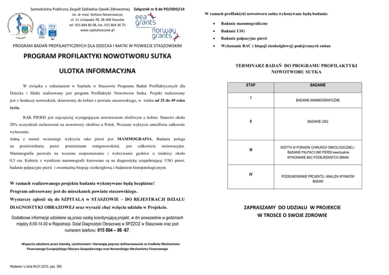 Samodzielny Publiczny Zespół Zakładów Opieki Zdrowotnej Załącznik nr 8 do PO/DDO/14 W ramach profilaktyki nowotworu sutka wykonywane będą badania: im. dr med. Stefana Niewirowicza ul. 11 Listopada 78, 28-200 Staszów tel. 015 864 86 08, fax. 015 864 36 75 www.szpitalstaszow.pl PROGRAM BADAŃ PROFILAKTYCZNYCH DLA DZIECKA I MATKI W POWIECIE STASZOWSKIM Badanie mammograficzne Badanie USG Badanie palpacyjne piersi Wykonanie BAC ( biopsji cienkoigłowej) podejrzanych zmian PROGRAM PROFILAKTYKI NOWOTWORU SUTKA TERMINARZ BADAŃ DO PROGRAMU PROFILAKTYKI NOWOTWORU SUTKA ULOTKA INFORMACYJNA W związku z wdrażaniem w Szpitalu w Staszowie Programu Badań Profilaktycznych dla Dziecka i Matki realizowany jest program Profilaktyki Nowotworu Sutka. Projekt realizowany jest z funduszy norweskich, skierowany do kobiet z powiatu staszowskiego, w wieku od 25 do 49 roku ETAP I BADANIE BADANIE MAMMOGRAFICZNE życia. RAK PIERSI jest najczęściej występującym nowotworem złośliwym u kobiet. Stanowi około 20% wszystkich zachorowań na nowotwory złośliwe u Polek. Wczesne wykrycie umożliwia całkowite II BADANIE USG wyleczenie. Jedną z metod wczesnego wykrycia raka piersi jest MAMMOGRAFIA. Badanie polega na prześwietlaniu piersi promieniami rentgenowskimi, jest całkowicie nieinwazyjne. Mammografia pozwala na wczesne rozpoznawanie i wykrywanie guzków o średnicy około III 0,5 cm. Kobiety z wynikiem mammografii kierowane są na diagnostykę uzupełniającą: USG piersi, WIZYTA W PORADNI CHIRURGII ONKOLOGICZNEJ BADANIE PALPACYJNE PIERSI ewentualnie WYKONANIE BAC PODEJRZANYCH ZMIAN badanie palpacyjne piersi i ewentualną biopsję cienkoigłową z badaniem histopatologicznym. IV W ramach realizowanego projektu badania wykonywane będą bezpłatne! PODSUMOWANIE PROJEKTU, ANALIZA WYNIKÓW BADAŃ Program adresowany jest do mieszkanek powiatu staszowskiego. Wystarczy zgłosić się do SZPITALA w STASZOWIE – DO REJESTRACJI DZIAŁU DIAGNOSTYKI OBRAZOWEJ oraz wyrazić chęć wzięcia udziału w Projekcie. Dodatkowe informacje udzielane są przez osobę koordynującą projekt, w dni powszednie w godzinach między 8.00-14.00 w Rejestracji- Dział Diagnostyki Obrazowej w SPZZOZ w Staszowie oraz pod numerem telefonu: 015 864 – 86 -67. Wsparcie udzielone przez Islandię, Liechtenstein i Norwegię poprzez dofinansowanie ze środków Mechanizmu Finansowego Europejskiego Obszaru Gospodarczego oraz Norweskiego Mechanizmu Finansowego Wydanie I z dnia 04.01.2010, poz. 393 ZAPRASZAMY DO UDZIAŁU W PROJEKCIE W TROSCE O SWOJE ZDROWIE