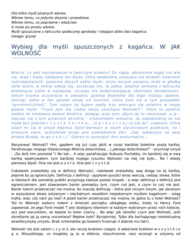 Oto klika myśli pisanych wbrew. Wbrew temu, co jedynie słuszne i prawdziwe. Wbrew temu, co poprawne i właściwe. A może po prostu wbrew. Myśli spuszczone z łańcucha społecznej aprobaty i latające dziko bez kagańca. Uwaga: gryzą! Wybieg dla WOLNOŚĆ myśli spuszczonych z kagańca: W JAK Wiecie, co jest najciekawsze w twórczym pisaniu? Że nigdy, absolutnie nigdy nie wie się, skąd i kiedy nadejdzie ten błysk, który swobodnie unoszące się skrawki niewinnie roztrzepotanych, pozornie obcych sobie myśli, ścina niczym poranny mróz w gładką taflę lustra, w której odbija się, szczerząc kły, ta jedna, właśnie zerwana z łańcucha drzemiącej sobie w najlepsze, niczego nie podejrzewającej zbiorowej świadomości. Umysł trzyma oczywiście w zanadrzu gotową etykietkę dla tego rodzaju zjawisk, tworząc sobie w ten sposób ułudę ich kontroli, która zwie się w tym przypadku ‘synchroniczność’. Tym razem jej łupem padły trzy wiercące się ostatnio w mojej głowie myśli: ”Czym jest dla ciebie twoja ukochana Wolność?”, które to pytanie zadała mi niedawno pewna Anielica, dodając przy tym, abym jej to narysował, a ja – męcząc się z tym pytaniem okrutnie - zrozumiałem wreszcie, że odpowiedzią na nie może być jedynie c z y s t a k a r t k a… „U p r a s z c z a j co się da”, sugestia, którą wżarł mi się w umysł Adamus Saint-Germain w swym styczniowym przekazie, no i wreszcie stare, aczkolwiek wciąż jare powiedzenie Zen: „Gdy zobaczysz na swej drodze Buddę, to go z a b i j.” Gdzież tu synergia? Ano posłuchajcie… Narysować Wolność? Hm, gapiłem się już czas jakiś w coraz bardziej boleśnie pustą kartkę. Parafrazując mojego Oświeconego Mistrza dzieciństwa… („Jakiego dzieciństwa?” - prychnął umysł - „Do dziś nim pozostał.”) No tak… A więc parafrazując Kubusia Puchatka, im bardziej się w ową kartkę wpatrywałem, tym bardziej mojego rysunku Wolności na niej nie było… No i wtedy pierwszy błysk. Ona nie jest p u s t a. Ona jest c z y s t a! Cokolwiek znalazłoby się w definicji Wolności, cokolwiek znalazłoby swą drogę na tę kartkę, jedynie by ją ograniczyło. Definicja z definicji - językowi puryści teraz warczą, cedząc słowa, które w tekstach dla szerokiej publiki przyjmują zawsze postać kropek - a więc definicja z definicji jest ograniczeniem, jest stawianiem barier pomiędzy tym, czym coś jest, a czym to coś nie jest. Barier takich przekraczać nie można, bo inaczej definicję – która jest niczym innym, jak ubranym w wyszukane słowa sztywnym i niechętnym wszelkim niepokornym myślom kagańcem - szlag trafia, więc cóż nam po niej? A jeżeli barier przekraczać nie można, to gdzie tu z kolei Wolność? Toż to Wolność wyboru rodem z Ameryki początku ubiegłego wieku, kiedy to Henry Ford zapewniał, że jego Ford model T jest dostępny klientom w każdym wybranym przez nich kolorze, acz pod warunkiem, że będzie to kolor czarny… No więc jak określić czym jest Wolność, jeśli określanie jej ją samą unicestwia? Błędne koło? Bynajmniej. Tylko dla kochającego intelektualną ekwilibrystykę umysłu. Brak schematów go bowiem frustruje (I dobrze mu tak!). Wolność nie jest zatem c z y m ś, ale raczej brakiem czegoś. A właściwie brakiem w s z y s t k i e g o. Wszystkiego, co mogłoby ją (a w efekcie, nieuchronnie, nas) wcisnąć w sztywny od ideologicznego krochmalu gorset tego, czym być p o w i n n a. Za każdym razem, gdy kroczymy bowiem szeroko wyasfaltowaną ‘jedynie słuszną drogą’, a choćby nawet i tylko ledwie widoczną ścieżką wydeptaną przez innych, jej (Wolności, nie ścieżki) z nami nie ma. Ona jest tylko tam, gdzie nikt jeszcze fluorescencyjnych pasów nie wytyczył, barierek nie postawił, asfaltu nie wylał i dzikości nie wykarczował. A więc tam, gdzie - w percepcji zbiorowej świadomości niechętnej takim dzikim i nieokiełznanym dżunglom nieprawości – biega sobie może samopas, bez kagańca i obroży zasad tego, co wolności czynić dozwolono. No bo parafrazując tym razem wywód o demokracji Pawlaka, bohatera nieśmiertelnych „Samych swoich” - co to za wolność, kiedy każdy może robić, co mu się podoba? Wolność wyboru tak, jak najbardziej, ale tylko pod warunkiem, że wybieramy to, co inni nam wybierać pozwalają… Oczywiście ‘inni’ (choć to raczej my - jako myślący inaczej - jesteśmy ‘inni’, oni są ‘swoi’), czyli zbiorowa świadomość, to ludzki pan – nie każe nam wszystkim jeździć samochodami w tym samym kolorze, a skąd! Mamy tylko wyznawać te same wartości. Albo – jeżeli ów ludzki pan jest szczególnie postępowy - przynajmniej wyznawać j a k i e ś wartości w ogóle. Bez wartości się nie obejdzie. Wartości są święte. Człowiekowi musi na czymś zależeć, człowiek musi w coś wierzyć. Człowiek bez wartości jest człowiekiem niebezpiecznym. A dlaczego? Bo jest nieobliczalny, to raz. Jak podobnież w 1939 roku skonstatował prezydent Franklin D. Roosevelt, gdy mu zarzucano, że Ameryka popiera krwawy reżim nikaraguańskiego prezydenta Anastasio Somozy Garcíi – „może to i sukinsyn, ale to nasz sukinsyn.” Innymi słowy, dobrze go znamy, wiemy, na co go stać, jest obliczalny i choć to okrutnik i krwiopijca, to po co nam rządy kogoś, po kim nie wiemy, czego się spodziewać? Drugim powodem, dla którego jakiś system wartości posiadać musimy jest to, że tylko człowieka, któremu na czymś zależy, któremu coś nie jest obojętne, można kontrolować. Człowieka, któremu obojętne jest to, co myślą, mówią i robią inni ludzie, któremu nie da się wmówić, że można mu coś odebrać – i bez znaczenia, czy będzie to życie czy ‘tylko’ akceptacja innych - kontrolować się nie da. Bo jakże tu zmusić do założenia sobie kagańca kogoś, kto niczego od nas nie chce? A więc chcieć musi – bezpieczeństwa czy aprobaty, wszy