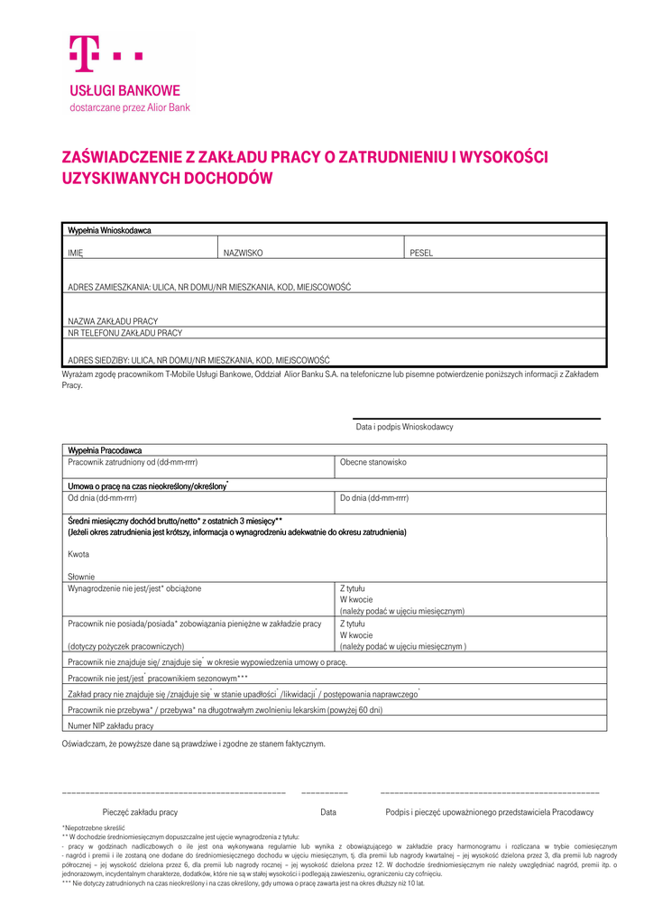 ZAŚWIADCZENIE Z ZAKŁADU PRACY O ZATRUDNIENIU I WYSOKOŚCI UZYSKIWANYCH DOCHODóW Wypełnia Wnioskodawca IMIĘ NAZWISKO PESEL ADRES ZAMIESZKANIA: ULICA, NR DOMU/NR MIESZKANIA, KOD, MIEJSCOWOŚĆ NAZWA ZAKŁADU PRACY NR TELEFONU ZAKŁADU PRACY ADRES SIEDZIBY: ULICA, NR DOMU/NR MIESZKANIA, KOD, MIEJSCOWOŚĆ Wyrażam zgodę pracownikom T-Mobile Usługi Bankowe, Oddział Alior Banku S.A. na telefoniczne lub pisemne potwierdzenie poniższych informacji z Zakładem Pracy. Data i podpis Wnioskodawcy Wypełnia Pracodawca Pracownik zatrudniony od (dd-mm-rrrr) Obecne stanowisko Umowa o pracę na czas nieokreślony/określony* Od dnia (dd-mm-rrrr) Do dnia (dd-mm-rrrr) Średni miesięczny dochód brutto/netto* z ostatnich 3 miesięcy** (Jeżeli okres zatrudnienia jest krótszy, informacja o wynagrodzeniu adekwatnie do okresu zatrudnienia) zatrudnienia) Kwota Słownie Wynagrodzenie nie jest/jest* obciążone Pracownik nie posiada/posiada* zobowiązania pieniężne w zakładzie pracy (dotyczy pożyczek pracowniczych) Z tytułu W kwocie (należy podać w ujęciu miesięcznym) Z tytułu W kwocie (należy podać w ujęciu miesięcznym ) Pracownik nie znajduje się/ znajduje się* w okresie wypowiedzenia umowy o pracę. Pracownik nie jest/jest* pracownikiem sezonowym*** Zakład pracy nie znajduje się /znajduje się* w stanie upadłości* /likwidacji* / postępowania naprawczego* Pracownik nie przebywa* / przebywa* na długotrwałym zwolnieniu lekarskim (powyżej 60 dni) Numer NIP zakładu pracy Oświadczam, że powyższe dane są prawdziwe i zgodne ze stanem faktycznym. ________________________________________________ Pieczęć zakładu pracy __________ Data _______________________________________________ Podpis i pieczęć upoważnionego przedstawiciela Pracodawcy *Niepotrzebne skreślić ** W dochodzie średniomiesięcznym dopuszczalne jest ujęcie wynagrodzenia z tytułu: - pracy w godzinach nadliczbowych o ile jest ona wykonywana regularnie lub wynika z obowiązującego w zakładzie pracy harmonogramu i rozliczana w trybie comiesięcznym - nagród i premii i ile zostaną one dodane do średniomiesięcznego dochodu w ujęciu miesięcznym, tj. dla premii lub nagrody kwartalnej – jej wysokość dzielona przez 3, dla premii lub nagrody półrocznej – jej wysokość dzielona przez 6, dla premii lub nagrody rocznej – jej wysokość dzielona przez 12. W dochodzie średniomiesięcznym nie należy uwzględniać nagród, premii itp. o jednorazowym, incydentalnym charakterze, dodatków, które nie są w stałej wysokości i podlegają zawieszeniu, ograniczeniu czy cofnięciu. *** Nie dotyczy zatrudnionych na czas nieokreślony i na czas określony, gdy umowa o pracę zawarta jest na okres dłuższy niż 10 lat.