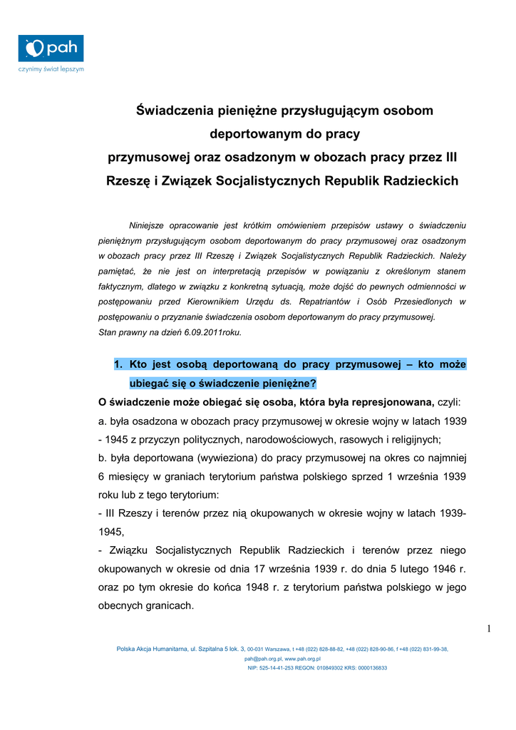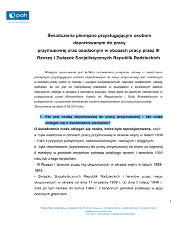 Świadczenia pieniężne przysługującym osobom deportowanym do pracy przymusowej oraz osadzonym w obozach pracy przez III Rzeszę i Związek Socjalistycznych Republik Radzieckich Niniejsze opracowanie jest krótkim omówieniem przepisów ustawy o świadczeniu pieniężnym przysługującym osobom deportowanym do pracy przymusowej oraz osadzonym w obozach pracy przez III Rzeszę i Związek Socjalistycznych Republik Radzieckich. Należy pamiętać, że nie jest on interpretacją przepisów w powiązaniu z określonym stanem faktycznym, dlatego w związku z konkretną sytuacją, może dojść do pewnych odmienności w postępowaniu przed Kierownikiem Urzędu ds. Repatriantów i Osób Przesiedlonych w postępowaniu o przyznanie świadczenia osobom deportowanym do pracy przymusowej. Stan prawny na dzień 6.09.2011roku. 1. Kto jest osobą deportowaną do pracy przymusowej – kto może ubiegać się o świadczenie pieniężne? O świadczenie może obiegać się osoba, która była represjonowana, czyli: a. była osadzona w obozach pracy przymusowej w okresie wojny w latach 1939 - 1945 z przyczyn politycznych, narodowościowych, rasowych i religijnych; b. była deportowana (wywieziona) do pracy przymusowej na okres co najmniej 6 miesięcy w graniach terytorium państwa polskiego sprzed 1 września 1939 roku lub z tego terytorium: - III Rzeszy i terenów przez nią okupowanych w okresie wojny w latach 19391945, - Związku Socjalistycznych Republik Radzieckich i terenów przez niego okupowanych w okresie od dnia 17 września 1939 r. do dnia 5 lutego 1946 r. oraz po tym okresie do końca 1948 r. z terytorium państwa polskiego w jego obecnych granicach. 1 Polska Akcja Humanitarna, ul. Szpitalna 5 lok. 3, 00-031 Warszawa, t +48 (022) 828-88-82, +48 (022) 828-90-86, f +48 (022) 831-99-38, [email protected], www.pah.org.pl NIP: 525-14-41-253 REGON: 010849302 KRS: 0000136833 UWAGA dla osób, które otrzymały decyzję negatywną, ponieważ nie przekroczyły granicy sprzed 1 września 1939 roku, a spełniają pozostałe warunki przyznania świadczenia. W związku ze zmianą ustawy z 25 lutego 2011 roku o świadczenie pieniężne mogą ubiegać się teraz także osoby, które zostały wywiezione do pracy przymusowej na okres co najmniej 6 miesięcy w graniach terytorium państwa polskiego sprzed 1 września 1939 roku. Wniosek mogą złożyć zarówno osoby, które jeszcze nie ubiegały się w ogóle o świadczenie pieniężne przysługujące osobom deportowanym, ale także osoby, które otrzymały decyzje ostateczne odmawiające świadczenia. Zmiana decyzji negatywnej jest możliwa na wniosek strony, który należy złożyć do Urzędu do Spraw Kombatantów i Osób Represjonowanych na podstawie art. 2 ustawy z dnia 25 lutego 2011 roku o zmianie ustawy o świadczeniu pieniężnym przysługującym osobom deportowanym do pracy przymusowej oraz osadzonym w obozach pracy przez III Rzeszę i Związek Socjalistycznych Republik Radzieckich w zw. z art. 154 § 1 ustawy z dnia 14 czerwca 1960 roku – Kodeks postępowania administracyjnego. w okresie podlegania represjom była obywatelem polskim i jest nim obecnie; w przypadku deportacji została wywieziona na okres co najmniej 6 miesięcy. Niniejszego okresu represji nie liczy się od momentu poczęcia (nawet jeśli matka dziecka w tym czasie była poddawana represjom), ale od daty urodzenia (tak wyrok WSA w Białymstoku z dnia 27.10.2005 r., sygn. akt II SA/Bk 503/05, LEX nr 173719, wyrok NSA w Warszawie z dnia 11.05.2010 r., sygn. akt II OSK 918/09, LEX nr 706018, wyrok NSAw Warszawie z dnia 8 października 2009 r., sygn. akt II OSK 1703/08, LEX nr 573604). Uwaga! Do okresu deportacji nie zalicza się także okresu po dniu zakończenia wojny (tak wyrok NSA w Warszawie z dnia 6 czerwca 2008 r., sygn. akt II OSK 979/07, LEX nr 493532). Pod uwagę należy wziąć tylko daty ściśle podane 2 Polska Akcja Humanitarna, ul. Szpitalna 5 lok. 3, 00-031 Warszawa, t +48 (022) 828-88-82, +48 (022) 828-90-86, f +48 (022) 831-99-38, [email protected], www.pah.org.pl NIP: 525-14-41-253 REGON: 010849302 KRS: 0000136833 w art. 2 ustawy o świadczeniach pieniężnych przysługujących osobom deportowanym do pracy przymusowej. 2. Kto z osób represjonowanych nie może otrzymać świadczenia albo pobierając inne świadczenia może otrzymać tylko jedno z nich? Świadczenia nie może otrzymać osoba, która otrzymuje dodatek: kombatancki, za tajne nauczanie. Osoba, która jest uprawniona zarówno do pobierania świadczenia przysługującego osobom deportowanym oraz równocześnie jest uprawniona do dodatku na podstawie przepisów o : - ubezpieczeniu społecznym rolników, - uprawnieniach przysługujących żołnierzom zastępczej służby wojskowej przymusowo zatrudnionym w kopalniach węgla, kamieniołomach i zakładach wydobywania rud uranu; może otrzymać tylko albo świadczenie albo dodatek – otrzymuje ona albo wyższe świadczenie, albo to, które wybierze, że chce otrzymywać. 3. Jakie należy złożyć dokumenty, ubiegając się o świadczenie pieniężne? a. Osoby ubiegające się pierwszy raz o świadczenie pieniężne. Decyzję w sprawie przyznania bądź odmowy przyznania świadczenia pieniężnego przysługującego osobom deportowanym wydaje Kierownik Urzędu do Spraw Kombatantów i Osób Represjonowanych na podstawie wniosku zainteresowanej osoby, który powinien zawierać: 3 Polska Akcja Humanitarna, ul. Szpitalna 5 lok. 3, 00-031 Warszawa, t +48 (022) 828-88-82, +48 (022) 828-90-86, f +48 (022) 831-99-38, [email protected], www.pah.org.pl NIP: 525-14-41-253 REGON: 010849302 KRS: 0000136833 wypełniony i podpisany wniosek o przyznanie świadczeń - kwestionariusz (Załącznik nr 1); wszelkiego rodzaju dowody, w tym zwłaszcza dokumenty, które potwierdzają rodzaj i okres represji (mogą to być m.in. dokumenty z miejsca wykonywania pracy przymusowej, zaświadczenia, poświadczenia, oświadczenia instytucji państwowych i zagranicznych, urzędów centralnych i