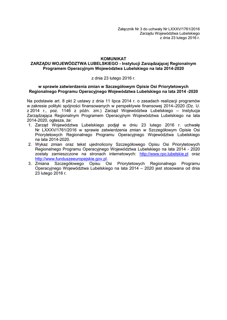 Załącznik Nr 3 do uchwały Nr LXXXV/1761/2016 Zarządu Województwa Lubelskiego z dnia 23 lutego 2016 r. KOMUNIKAT ZARZĄDU WOJEWÓDZTWA LUBELSKIEGO - Instytucji Zarządzającej Regionalnym Programem Operacyjnym Województwa Lubelskiego na lata 2014-2020 z dnia 23 lutego 2016 r. w sprawie zatwierdzenia zmian w Szczegółowym Opisie Osi Priorytetowych Regionalnego Programu Operacyjnego Województwa Lubelskiego na lata 2014 -2020 Na podstawie art. 8 pkt 2 ustawy z dnia 11 lipca 2014 r. o zasadach realizacji programów w zakresie polityki spójności finansowanych w perspektywie finansowej 2014–2020 (Dz. U. z 2014 r., poz. 1146 z późn. zm.) Zarząd Województwa Lubelskiego – Instytucja Zarządzająca Regionalnym Programem Operacyjnym Województwa Lubelskiego na lata 2014-2020, ogłasza, że: 1. Zarząd Województwa Lubelskiego podjął w dniu 23 lutego 2016 r. uchwałę Nr LXXXV/1761/2016 w sprawie zatwierdzenia zmian w Szczegółowym Opisie Osi Priorytetowych Regionalnego Programu Operacyjnego Województwa Lubelskiego na lata 2014-2020. 2. Wykaz zmian oraz tekst ujednolicony Szczegółowego Opisu Osi Priorytetowych Regionalnego Programu Operacyjnego Województwa Lubelskiego na lata 2014 - 2020 zostały zamieszczone na stronach internetowych: http://www.rpo.lubelskie.pl oraz http://www.funduszeeuropejskie.gov.pl. 3. Zmiana Szczegółowego Opisu Osi Priorytetowych Regionalnego Programu Operacyjnego Województwa Lubelskiego na lata 2014 – 2020 jest stosowana od dnia 23 lutego 2016 r.