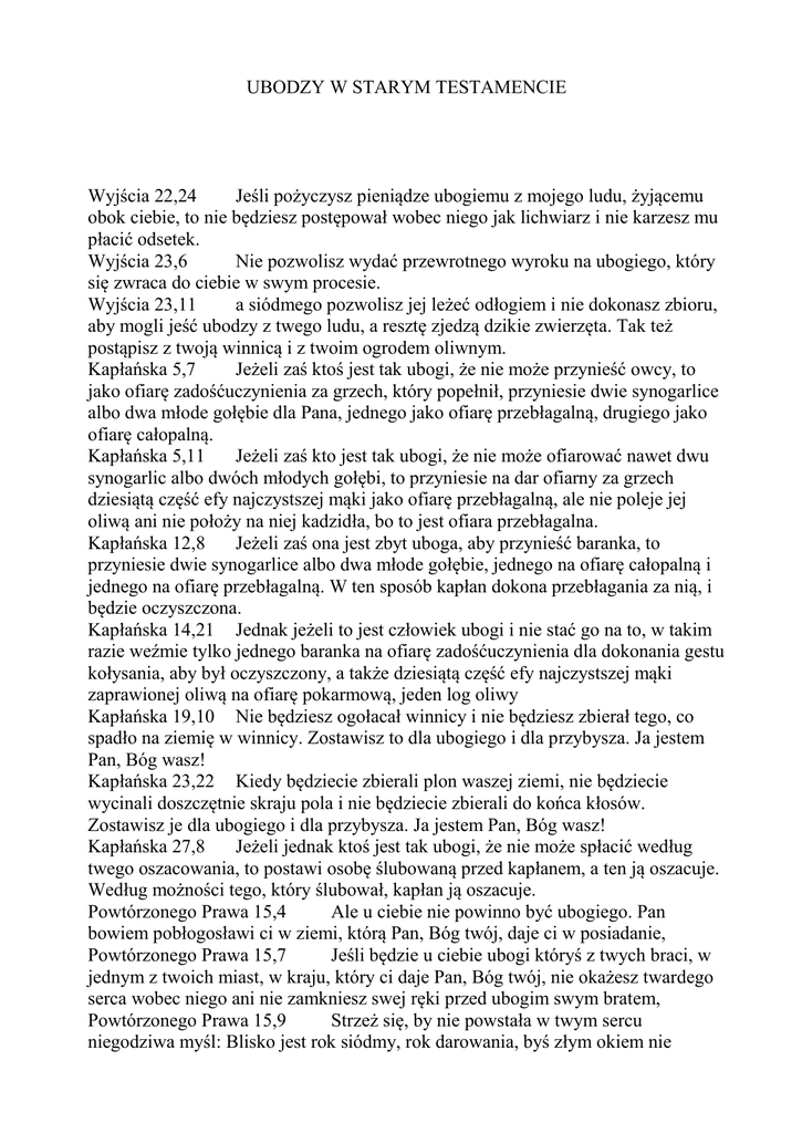 UBODZY W STARYM TESTAMENCIE Wyjścia 22,24 Jeśli pożyczysz pieniądze ubogiemu z mojego ludu, żyjącemu obok ciebie, to nie będziesz postępował wobec niego jak lichwiarz i nie karzesz mu płacić odsetek. Wyjścia 23,6 Nie pozwolisz wydać przewrotnego wyroku na ubogiego, który się zwraca do ciebie w swym procesie. Wyjścia 23,11 a siódmego pozwolisz jej leżeć odłogiem i nie dokonasz zbioru, aby mogli jeść ubodzy z twego ludu, a resztę zjedzą dzikie zwierzęta. Tak też postąpisz z twoją winnicą i z twoim ogrodem oliwnym. Kapłańska 5,7 Jeżeli zaś ktoś jest tak ubogi, że nie może przynieść owcy, to jako ofiarę zadośćuczynienia za grzech, który popełnił, przyniesie dwie synogarlice albo dwa młode gołębie dla Pana, jednego jako ofiarę przebłagalną, drugiego jako ofiarę całopalną. Kapłańska 5,11 Jeżeli zaś kto jest tak ubogi, że nie może ofiarować nawet dwu synogarlic albo dwóch młodych gołębi, to przyniesie na dar ofiarny za grzech dziesiątą część efy najczystszej mąki jako ofiarę przebłagalną, ale nie poleje jej oliwą ani nie położy na niej kadzidła, bo to jest ofiara przebłagalna. Kapłańska 12,8 Jeżeli zaś ona jest zbyt uboga, aby przynieść baranka, to przyniesie dwie synogarlice albo dwa młode gołębie, jednego na ofiarę całopalną i jednego na ofiarę przebłagalną. W ten sposób kapłan dokona przebłagania za nią, i będzie oczyszczona. Kapłańska 14,21 Jednak jeżeli to jest człowiek ubogi i nie stać go na to, w takim razie weźmie tylko jednego baranka na ofiarę zadośćuczynienia dla dokonania gestu kołysania, aby był oczyszczony, a także dziesiątą część efy najczystszej mąki zaprawionej oliwą na ofiarę pokarmową, jeden log oliwy Kapłańska 19,10 Nie będziesz ogołacał winnicy i nie będziesz zbierał tego, co spadło na ziemię w winnicy. Zostawisz to dla ubogiego i dla przybysza. Ja jestem Pan, Bóg wasz! Kapłańska 23,22 Kiedy będziecie zbierali plon waszej ziemi, nie będziecie wycinali doszczętnie skraju pola i nie będziecie zbierali do końca kłosów. Zostawisz je dla ubogiego i dla przybysza. Ja jestem Pan, Bóg wasz! Kapłańska 27,8 Jeżeli jednak ktoś jest tak ubogi, że nie może spłacić według twego oszacowania, to postawi osobę ślubowaną przed kapłanem, a ten ją oszacuje. Według możności tego, który ślubował, kapłan ją oszacuje. Powtórzonego Prawa 15,4 Ale u ciebie nie powinno być ubogiego. Pan bowiem pobłogosławi ci w ziemi, którą Pan, Bóg twój, daje ci w posiadanie, Powtórzonego Prawa 15,7 Jeśli będzie u ciebie ubogi któryś z twych braci, w jednym z twoich miast, w kraju, który ci daje Pan, Bóg twój, nie okażesz twardego serca wobec niego ani nie zamkniesz swej ręki przed ubogim swym bratem, Powtórzonego Prawa 15,9 Strzeż się, by nie powstała w twym sercu niegodziwa myśl: Blisko jest rok siódmy, rok darowania, byś złym okiem nie patrzał na ubogiego twego brata, nie udzielając mu pomocy. On będzie wzywał Pana przeciwko tobie, a ty obciążysz się grzechem. Powtórzonego Prawa 15,11 Ubogiego bowiem nie zabraknie w tym kraju, dlatego ja nakazuję: Otwórz szczodrze rękę swemu bratu uciśnionemu lub ubogiemu w twej ziemi. Powtórzonego Prawa 24,12 Wszakże jeśli to jest człowiek ubogi, nie położysz się spać nakryty tym zastawem, Powtórzonego Prawa 24,14 Nie będziesz niesprawiedliwie gnębił najemnika ubogiego i nędznego, czy to będzie brat twój, czy obcy, o ile jest w twoim kraju, w twoich murach. Powtórzonego Prawa 24,15 Tegoż dnia oddasz mu zapłatę, nie pozwolisz zajść nad nią słońcu, gdyż jest on biedny i całym sercem jej pragnie; by nie wzywał Pana przeciw tobie, a to by cię obciążyło grzechem. 1Samuela 2,8 Z pyłu podnosi biedaka, z barłogu dźwiga nędzarza, by go wśród możnych posadzić, by dać mu tron zaszczytny. Do Pana należą filary ziemi: na nich świat położył. 2Samuela 12,1 Pan posłał do Dawida proroka Natana. Ten przybył do niego i powiedział: W pewnym mieście było dwóch ludzi, jeden był bogaczem, a drugi biedakiem. 2Samuela 12,3 biedak nie miał nic, prócz jednej małej owieczki, którą nabył. On ją karmił i wyrosła przy nim wraz z jego dziećmi, jadła jego chleb i piła z jego kubka, spała u jego boku i była dla niego jak córka. 2Samuela 12,4 Raz przyszedł gość do bogacza, lecz jemu żal było brać coś z owiec i własnego bydła, czym mógłby posłużyć podróżnemu, który do niego zawitał. Więc zabrał owieczkę owemu biednemu mężowi i tę przygotował człowiekowi, co przybył do niego. 2Królewska 25,12 Lecz spośród biednego ludu ziemi dowódca straży przybocznej pozostawił niektórych jako uprawiających winnice i jako rolników. Estery 9,22 jako dni, w których Żydzi uwolnili się od nieprzyjaciół, i miesiąc, który obrócił się im ze smutku w radość i z żałoby stał się dla nich dniem wesela, aby obchodzili je jako dni ucztowania i wesela, posyłając innym coś z zapasów żywności, a ubogim dary. Hioba 5,15 Sierotę ratuje od miecza, biedaka - z przemocy mocarza, Hioba 5,16 ubogi się karmi nadzieją, bo nieprawość zamyka swe usta. Hioba 20,10 Synowie zwracają mienie ubogim, jego ręce oddają bogactwa. Hioba 20,19 Skrzywdził, zasmucił ubogich, domy zagrabiał, nie stawiał; Hioba 24,4 Ubogich usuwa się z drogi, biedni się wszyscy chowają Hioba 24,14 Morderca nie wstaje za dnia, by zabić biedaka, nędzarza, lecz chodzi po nocy jak złodziej. Hioba 29,12 Bo ratowałem biednego przed możnym, sierotę, co nie miał pomocy. Hioba 29,16 Dla biednych stałem się ojcem, pomagałem w sporze i nieznajomemu, Hioba 30,3 wynędzniali z biedy i głodu? Zrywają rośliny pustyni, ziemi od dawna jałowej. Hioba 30,25 Czy nie płakałem z innym w dzień smutku? Współczuła z biedakiem ma dusza. Hioba 31,19 Czy na biedaka nagiego patrzałem, kiedy nędzarzom zabrakło odzienia? Hioba 34,19 On nie schlebia książętom