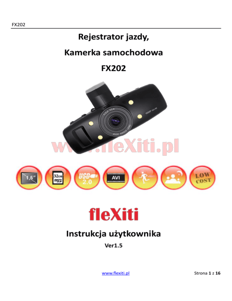 FX202 Rejestrator jazdy, Kamerka samochodowa FX202 Instrukcja użytkownika Ver1.5 www.flexiti.pl Strona 1 z 16 FX202 Wstęp Cyfrowa kamera FX202 HD (wysokiej rozdzielczości) jest wykonana z wykorzystaniem najnowszych technologii. Może służyć zarówno jako kamera HD, jak również jako profesjonalna kamerka samochodowa. Kamerka samochodowa (rejestrator jazdy) nagrywa w rozdzielczości zdjęcia są wykonywanie z rozdzielczością do 1920x1080P, a do 5 mega pikseli. Używając karty SDHC jako pamięci do przechowywania nagrań, przy równoczesnym małym poborze energii, kamera HD może nagrywać obraz wideo, audio i robić zdjęcia, po czym zapisywać je na karcie pamięci.. Wideo może być wyświetlane i przeglądane bezpośrednio na wyświetlaczu, na ekranie telewizora podłączonego za pomocą kabla HDMI, lub przeglądane i kopiowane za pomocą komputera. www.flexiti.pl Strona 2 z 16 FX202 Zawartość opakowania kamerka FX202 Przykładowy montaż rejestratora FX202 w samochodzie www.flexiti.pl Strona 3 z 16 FX202 1. Instrukcja instalacji i. Wyłącz silnik samochodu lub odłącz kamerę od zasilania. ii. Włóż kartę SD w slot. [Uwaga] Sugerujemy użycie karty SD klasa 6 lub wyższa, i o pojemności nie mniejszej niż 1 GB. Urządzenie obsługuje karty SD o pojemności 32GB maksymalnie. [Uwaga] Należy dobrze umyć szybę samochodu nim przylepisz uchwyt. Zabrudzona I wilgotna szyba może powodować że uchwyt będzie się odklejał. iii. Podłącz kamerę na stałe do instalacji 12V lub do gniazda zapalniczki. [Uwaga] Kabel zasilający USB nie powinien zwisać na przedniej szybie samochodu. iv. Zależnie od potrzeb wyreguluj ustawienie kamery. v. Uruchom silnik. [Uwaga] Jeśli kamera jest ustawiona I zainstalowana prawidłowo, kamera automatycznie wejdzie w tryb nagrywania w momencie uruchomienia silnika. Sprawdź na ekranie LCD obraz, dostosuj również ustawienia dostępne w Menu urządzenia. Przydatne informacje Aby nagrania z kamerki były prawidłowe i bez zacięć należy zastosować dobrej jakości kartę MicroSD, o dużej prędkości zapisu. Czytaj więcej tu... Dobrze zaprogramowana kamerka samochodowa po uruchomieniu samochodu zaczyna automatycznie rejestrację, a kończy kilkanaście sekund po wyłączeniu silnika (nie wymaga ingerencji) Uaktywnienie opcji wykrywania ruchu może spowodować nieciągłość nagrania, gdyż kamerka nagrywać będzie tylko w przypadku wykrycia ruchu. Tryb ten pozwala oszczędzać miejsce na karcie SD, jednakże nie zapewnia ciągłości. Kamera automatycznie nagrywa wszystkie nagranie w trybie cyklicznym. Oznacza to że w przypadku braku wolnego miejsca kasowane będą najstarsze nagrania, a w ich miejsce nagrywane nowe. Kamera zaopatrzona jest również w detekcję niskiego napięcia baterii, i w razie wykrycia takiej sytuacji automatycznie kończy zapis. Funkcja G-sensor może być aktywowana z Menu. W takiej sytuacji kamera mierzy przyśpieszenie we wszystkich kierunkach, i w razie wykrycia kolizji automatycznie zabezpiecza przed utratą nagranie 10s przed zdarzeniem oraz 20s po zdarzeniu. Ten fragment nie będzie nadpisany poprzez nowe nagrania. Umiejscowienie kamerki za lusterkiem powoduje że kamerka nie przeszkadza kierowcy w czasie jazdy, a równocześnie doskonale nagrywa. Nie każdy obszar okna samochodu jest wycierany wycieraczką, należy na to zwrócić uwagę w czasie montażu. Szyba samochodu, szczególnie przyciemniana może powodować refleksy i odbicia deski rozdzielczej, dlatego należy starać się umieścić obiektyw kamery jak najbliżej szyby samochodu. Doświetlenie nocne, czy też nazywane inaczej "night vision" jest tylko elementem marketingu Chińskich producentów. Zakres takiego doświetlenia zamyka się w obszarze do 1 metra (a czasami dużo mniej) i jego funkcjonalność jest znikoma. Nie są nam znane kamerki samochodowe które rzeczywiście "widzą" w nocy (kamery noktowizyjne to potrafią, jest to jednak zupełnie inna półka cenowa).Jakość obrazu nocą zależeć będzie głównie od oświetlenia zewnętrznego np. lampy uliczne, reflektory samochodów. www.flexiti.pl Strona 4 z 16 FX202 Cechy rejestratora: Szerokokątny obiektyw o kącie widzenia 120/130 stopni. Rozdzielczość: 1920×1080P FULL HD . Zaawansowany kodek kompresji AVI Aparat, zdjęcia w rozdzielczości 4X zoom cyfrowy, ostrość od 12cm do nieskończoności. 1.5 calowy wyświetlacz LCD, podgląd w czasie nagrywania. Diody podświetlania dla nagrań przy słabym oświetleniu. Złącze do transmisji HDMI wideo. 5 rodzajów jakości nagrywanego materiału wideo. 30/60 ramek na sekundę zapewnia płynny obraz wideo. Specjalny samochodowy uchwyt mocujący do szyby. Czujnik przyśpieszenia: G-sensor Zabezpieczenie nagrań, nawet w przypadku nagłego wypadku nagrania wideo są 5 mega pikseli. zabezpieczone. Spójność nagrań wideo (brak przerw w nagraniach). Zasilanie bezpośrednio z gniazdka zapalniczki, szybkie podłączenie I nagrywanie w czasie jazdy. Automatyczne uruchamianie nagrywania w momencie uruchomienia silnika (również automatyczne wyłączanie po jego wyłączenia) Nagrywanie w pętli, z możliwością ustawienia długości fragmentów wideo. Możliwość przeglądania wideo w czasie nagrywania. Nagrywanie daty i czasu na nagranym materiale wideo. Ustawiany czas nagrywanych sekwencji wideo. Funkcja zdjęć, może wykonać zdjęcie w czasie nagrywania sekwencji wideo. Ładowanie akumulatorka poprzez złącze USB. Nagrywania na karcie SD, do 32GB pojemności. www.flexiti.pl Strona 5 z 16 FX202 Opis przycisków i złączy www.flexiti.pl Strona 6 z 16 FX202 Funkcje przycisków Przycisk MODE : W czasie oczekiwania przycisk służy do zmiany trybu pracy z trybu nagrywania wideo, w tryb fotograficzny ,w tryb odtwarzania wideo lub tryb ustawień. W czasie nagrywania przyciskiem tym możemy również zabezpieczyć/odbezpieczyć aktualne nagranie. (zabezpieczone video nie zostanie skasowane, nawet po zapełnieniu się całej karty SD) P