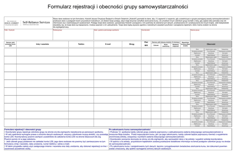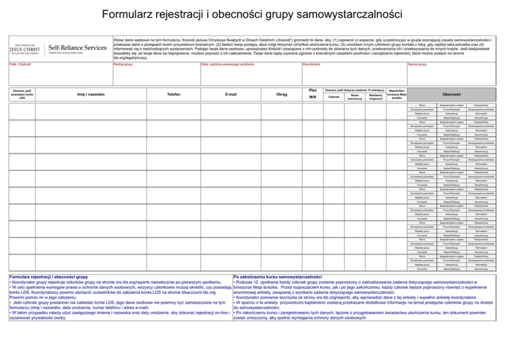 Formularz rejestracji i obecności grupy samowystarczalności Wpisz dane osobowe na tym formularzu. Kościół Jezusa Chrystusa Świętych w Dniach Ostatnich („Kościół”) gromadzi te dane, aby: (1) zapewnić ci wsparcie, gdy uczestniczysz w grupie poznającej zasady samowystarczalności i przekazać dane o postępach twoim przywódcom kościelnym, (2) śledzić twoje postępy, abyś mógł otrzymać certyfikat ukończenia kursu, (3) umożliwić innym członkom grupy kontakt z tobą, gdy zajdzie taka potrzeba oraz (4) informować cię o nadchodzących wydarzeniach. Podając twoje dane osobowe, upoważniasz Kościół i powiązane z nim podmioty do zbierania tych danych, przetwarzania ich i przekazywania do innych krajów. Jeśli kiedykolwiek okazałoby się, że twoje dane są niepoprawne, możesz poprosić o ich uaktualnienie. Twoje dane będą używane zgodnie z kościelnymi zasadami poufności i zarządzania rejestrami, które można znaleźć na stronie lds.org/legal/privacy. Palik / Dystrykt Zaznacz, jeśli posiadasz konto LDS Rodzaj grupy Data i godzina pierwszego spotkania Koordynator Płeć Imię i nazwisko Telefon E-mail Formularz rejestracji i obecności grupy • Koordynator grupy rejestruje członków grupy na stronie srs.lds.org/reports niezwłocznie po pierwszym spotkaniu. • W celu spełnienia wymogów prawa o ochronie danych osobowych, wszyscy członkowie muszą określić, czy posiadają konto LDS. Koordynatorzy powinni zachęcić uczestników do założenia konta LDS na stronie ldsaccount.lds.org. Powinni pomóc im w jego założeniu. • Jeśli członek grupy postanowi nie zakładać konta LDS, jego dane osobowe nie powinny być zamieszczane na tym formularzu (imię i nazwisko, data urodzenia, numer telefonu i adres e-mail) • W takim przypadku należy użyć zastępczego imienia i nazwiska oraz daty urodzenia, aby dokonać rejestracji on-line i uszanować prywatność osoby. Okręg M/K Nazwa grupy Zaznacz, jeśli dotyczy (ostatnie 12 miesięcy) Członek Nowo nawrócony Niedawny misjonarz Wypełniłem broszurę Moja ścieżka Obecność Wiara Gospodarowanie czasem Posłuszeństwo Zarządzanie pieniędzmi Praca/Obowiązki Rozwiązywanie problemów Wspólna praca Komunikacja Wytrwałość Uczciwość Nauka/Edukacja Koncentracja Wiara Gospodarowanie czasem Posłuszeństwo Zarządzanie pieniędzmi Praca/Obowiązki Rozwiązywanie problemów Wspólna praca Komunikacja Wytrwałość Uczciwość Nauka/Edukacja Koncentracja Wiara Gospodarowanie czasem Posłuszeństwo Zarządzanie pieniędzmi Praca/Obowiązki Rozwiązywanie problemów Wspólna praca Komunikacja Wytrwałość Uczciwość Nauka/Edukacja Koncentracja Wiara Gospodarowanie czasem Posłuszeństwo Zarządzanie pieniędzmi Praca/Obowiązki Rozwiązywanie problemów Wspólna praca Komunikacja Wytrwałość Uczciwość Nauka/Edukacja Koncentracja Wiara Gospodarowanie czasem Posłuszeństwo Zarządzanie pieniędzmi Praca/Obowiązki Rozwiązywanie problemów Wspólna praca Komunikacja Wytrwałość Uczciwość Nauka/Edukacja Koncentracja Wiara Gospodarowanie czasem Posłuszeństwo Zarządzanie pieniędzmi Praca/Obowiązki Rozwiązywanie problemów Wspólna praca Komunikacja Wytrwałość Uczciwość Nauka/Edukacja Koncentracja Wiara Gospodarowanie czasem Posłuszeństwo Zarządzanie pieniędzmi Praca/Obowiązki Rozwiązywanie problemów Wspólna praca Komunikacja Wytrwałość Uczciwość Nauka/Edukacja Koncentracja Wiara Gospodarowanie czasem Posłuszeństwo Zarządzanie pieniędzmi Praca/Obowiązki Rozwiązywanie problemów Wspólna praca Komunikacja Wytrwałość Uczciwość Nauka/Edukacja Koncentracja Wiara Gospodarowanie czasem Posłuszeństwo Zarządzanie pieniędzmi Praca/Obowiązki Rozwiązywanie problemów Wspólna praca Komunikacja Wytrwałość Uczciwość Nauka/Edukacja Koncentracja Wiara Gospodarowanie czasem Posłuszeństwo Zarządzanie pieniędzmi Praca/Obowiązki Rozwiązywanie problemów Wspólna praca Komunikacja Wytrwałość Uczciwość Nauka/Edukacja Koncentracja Po zakończeniu kursu samowystarczalności • Podczas 12. spotkania każdy członek grupy zostanie poproszony o zaktualizowanie zadania dotyczącego samowystarczalności w broszurze Moja ścieżka. Przed rozpoczęciem kursu, jak i po jego zakończeniu, każdy członek będzie poproszony również o wypełnienie anonimowej ankiety, związanej z wynikami zadania dotyczącego samowystarczalności. • Koordynator ponownie skorzysta ze strony srs.lds.org/reports, aby wprowadzić dane z tej ankiety i wypełnić ankietę koordynatora. • W oparciu o te ankiety przywódcom kapłańskim zostaną przekazane dodatkowe informacje na temat postępów członków grupy na drodze do samowystarczalności. • Po zakończeniu kursu i zarejestrowaniu tych danych, łącznie z przygotowaniem świadectwa ukończenia kursu, ten dokument powinien zostać zniszczony, aby spełnić wymagania ochrony danych osobowych.