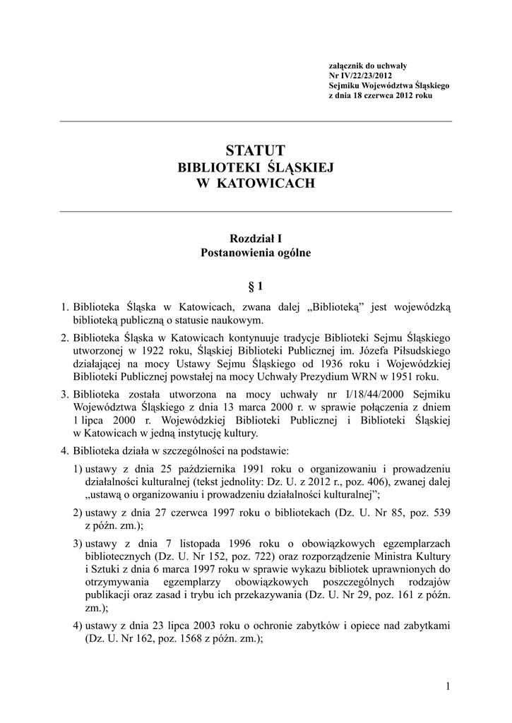 załącznik do uchwały Nr IV/22/23/2012 Sejmiku Województwa Śląskiego z dnia 18 czerwca 2012 roku STATUT BIBLIOTEKI ŚLĄSKIEJ W KATOWICACH Rozdział I Postanowienia ogólne §1 1. Biblioteka Śląska w Katowicach, zwana dalej „Biblioteką” jest wojewódzką biblioteką publiczną o statusie naukowym. 2. Biblioteka Śląska w Katowicach kontynuuje tradycje Biblioteki Sejmu Śląskiego utworzonej w 1922 roku, Śląskiej Biblioteki Publicznej im. Józefa Piłsudskiego działającej na mocy Ustawy Sejmu Śląskiego od 1936 roku i Wojewódzkiej Biblioteki Publicznej powstałej na mocy Uchwały Prezydium WRN w 1951 roku. 3. Biblioteka została utworzona na mocy uchwały nr I/18/44/2000 Sejmiku Województwa Śląskiego z dnia 13 marca 2000 r. w sprawie połączenia z dniem 1 lipca 2000 r. Wojewódzkiej Biblioteki Publicznej i Biblioteki Śląskiej w Katowicach w jedną instytucję kultury. 4. Biblioteka działa w szczególności na podstawie: 1) ustawy z dnia 25 października 1991 roku o organizowaniu i prowadzeniu działalności kulturalnej (tekst jednolity: Dz. U. z 2012 r., poz. 406), zwanej dalej „ustawą o organizowaniu i prowadzeniu działalności kulturalnej”; 2) ustawy z dnia 27 czerwca 1997 roku o bibliotekach (Dz. U. Nr 85, poz. 539 z późn. zm.); 3) ustawy z dnia 7 listopada 1996 roku o obowiązkowych egzemplarzach bibliotecznych (Dz. U. Nr 152, poz. 722) oraz rozporządzenie Ministra Kultury i Sztuki z dnia 6 marca 1997 roku w sprawie wykazu bibliotek uprawnionych do otrzymywania egzemplarzy obowiązkowych poszczególnych rodzajów publikacji oraz zasad i trybu ich przekazywania (Dz. U. Nr 29, poz. 161 z późn. zm.); 4) ustawy z dnia 23 lipca 2003 roku o ochronie zabytków i opiece nad zabytkami (Dz. U. Nr 162, poz. 1568 z późn. zm.); 1 5) rozporządzenia Ministra Kultury i Sztuki z dnia 24 listopada 1998 roku w sprawie ustalenia wykazu bibliotek, których zasoby tworzą narodowy zasób biblioteczny, określenia organizacji tego zasobu oraz zasad i zakresu jego szczegółowej ochrony (Dz. U. Nr 146, poz. 955 z późn. zm.); 6) ustawy z dnia 5 czerwca 1998 roku o samorządzie województwa (tekst jednolity Dz. U. z 2001 r. Nr 142, poz. 1590 z późn. zm.); 7) niniejszego statutu. §2 1. Biblioteka Śląska w Katowicach może używać skróconej nazwy - „Biblioteka Śląska”. 2. Siedzibą Biblioteki jest miasto Katowice. 3. Biblioteka prowadzi działalność na terenie Rzeczypospolitej Polskiej oraz poza jej granicami. 4. Biblioteka używa pieczęci podłużnej z pełną nazwą instytucji oraz jej adresem. §3 1. Organizatorem Biblioteki jest Województwo Śląskie. 2. Nadzór nad Biblioteką sprawuje Zarząd Województwa Śląskiego. §4 Biblioteka posiada osobowość prawną; jest wpisana do rejestru instytucji kultury prowadzonego przez Województwo Śląskie pod numerem RIK-B/19/2000. §5 Biblioteka wchodzi w skład ogólnokrajowej sieci bibliotecznej. Rozdział II Zakres działania Biblioteki §6 1. Biblioteka jest biblioteką publiczną. Jej zbiory stanowią dobro narodowe i służą zachowaniu dziedzictwa narodowego, współtworząc narodowy zasób biblioteczny. 2. Biblioteka organizuje biblioteczną, bibliograficzną i naukowo-badawczą działalność na rzecz narodowej kultury, nauki, edukacji oraz dla zaspokojenia potrzeb informacyjnych społeczności województwa śląskiego, a w szczególności: 1) gromadzi, opracowuje, chroni oraz przechowuje swoje zbiory zgodnie 2 z obowiązującymi przepisami, 2) udostępnia zbiory na miejscu i w drodze wypożyczeń osobom indywidualnym oraz instytucjom w kraju i za granicą w celu zapewnienia swobodnego dostępu do wiedzy i informacji; tryb udostępniania zbiorów regulują oddzielne przepisy, porozumienia i regulaminy, 3) prowadzi działalność bibliograficzną, dokumentacyjną, wydawniczą, edukacyjną, popularyzatorską i instrukcyjno-metodyczną. 3. Zbiory Biblioteki są wzbogacane i uzupełniane: 1) w oparciu o przepisy o egzemplarzu obowiązkowym, 2) drogą zakupu, darowizn lub wymiany materiałów bibliotecznych. 4. Biblioteka kompletuje zbiór śląskoznawczych materiałów bibliotecznych. 5. Biblioteka gromadzi materiały dotyczące Unii Europejskiej. 6. W zakresie popularyzacji książki Biblioteka realizuje swoje zadanie szczególnie przez: 1) promocję książki i czytelnictwa, 2) organizowanie imprez kulturalnych, 3) współpracę i pomoc dla organizacji pozarządowych działających na rzecz książki i czytelnictwa. §7 1. Biblioteka jest biblioteką naukową. 2. Biblioteka uczestniczy w krajowej i międzynarodowej wymianie doświadczeń naukowych, zwłaszcza w zakresie bibliotekarstwa naukowego i publicznego oraz innych dziedzin poznania. 3. Biblioteka opracowuje i publikuje prace naukowe, bibliografię regionalną oraz inne materiały o charakterze regionalnym. 4. W zakresie działalności naukowej Biblioteka realizuje swoje zadania szczególnie przez: 1) inicjowanie i prowadzenie badań naukowych w zakresie bibliotekoznawstwa, edytorstwa, badań nad książką i czytelnictwem, kulturą literacką, ze szczególnym uwzględnieniem problematyki śląskoznawczej, 2) prowadzenie działalności naukowo-badawczej i wydawniczej w zakresie obsługiwanych przez Bibliotekę dziedzin nauki, 3) upowszechnianie wyników badań naukowych. §8 1. Biblioteka jest centralną placówką metodyczną dla bibliotek publicznych 3 województwa śląskiego. 2. Biblioteka sprawuje nadzór merytoryczny w zakresie realizacji przez samorządowe biblioteki publiczne zadań wynikających z przynależności do ogólnokrajowej sieci bibliotecznej. 3. Biblioteka prowadzi działalność edukacyjną i popularyzacyjną. 4. W zakresie działalności na rzecz samorządowych bibliotek publicznych Biblioteka realizuje swoje zadania szczególnie przez: 1) koordynowanie działalności bibliotek publicznych w celu stworzenia na terenie województwa śląskiego jednolitego systemu informacyjnego, stanowiącego integralną część systemu og