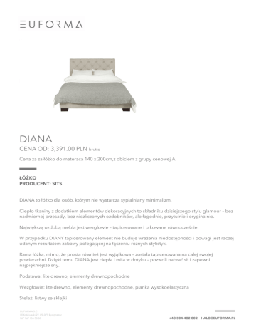 DIANA CENA OD: 3,391.00 PLN brutto Cena za za łóżko do materaca 140 x 200cm,z obiciem z grupy cenowej A. ŁÓŻKO PRODUCENT: SITS DIANA to łóżko dla osób, którym nie wystarcza sypialniany minimalizm. Ciepło tkaniny z dodatkiem elementów dekoracyjnych to składniku dzisiejszego stylu glamour – bez nadmiernej przesady, bez niezliczonych ozdobników, ale łagodnie, przytulnie i oryginalnie. Największą ozdobą mebla jest wezgłowie – tapicerowane i pikowane równocześnie. W przypadku DIANY tapicerowany element nie buduje wrażenia niedostępności i powagi jest raczej udanym rezultatem zabawy polegającej na łączeniu różnych stylistyk. Rama łóżka, mimo, że prosta również jest wyjątkowa – została tapicerowana na całej swojej powierzchni. Dzięki temu DIANA jest ciepła i miła w dotyku – pozwoli nabrać sił i zapewni najpiękniejsze sny. Podstawa: lite drewno, elementy drewnopochodne Wezgłowie: lite drewno, elementy drewnopochodne, pianka wysokoelastyczna Stelaż: listwy ze sklejki Nogi: lite drewno, metal (noga wspierająca- plastik) Obicie: szeroki wybór tkanin Powered by TCPDF (www.tcpdf.org)
