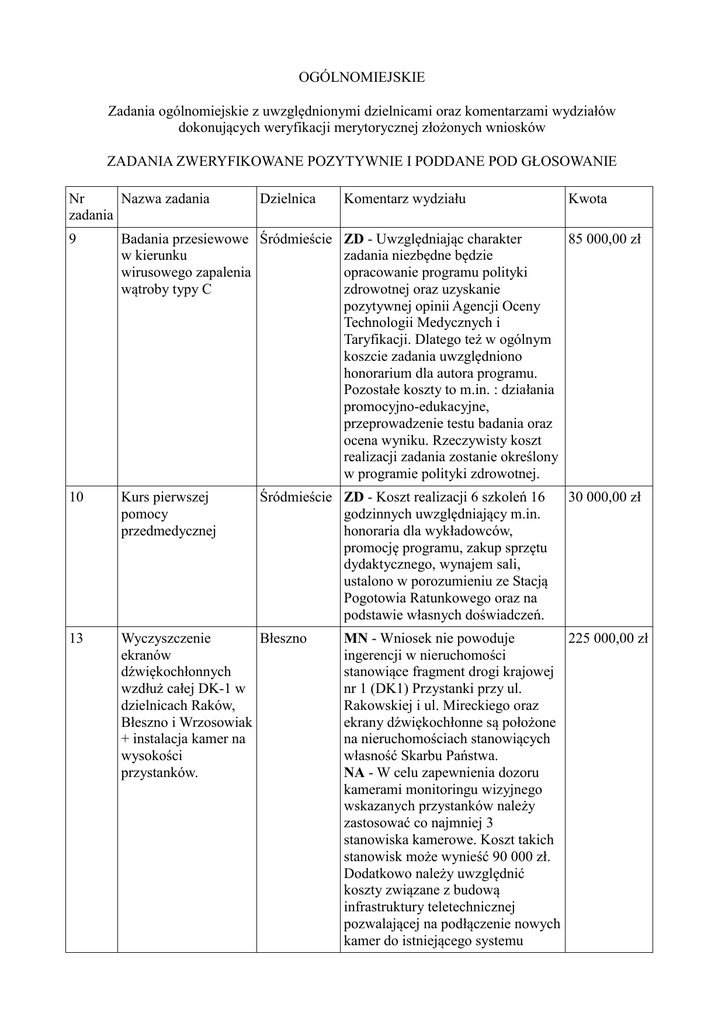 OGÓLNOMIEJSKIE Zadania ogólnomiejskie z uwzględnionymi dzielnicami oraz komentarzami wydziałów dokonujących weryfikacji merytorycznej złożonych wniosków ZADANIA ZWERYFIKOWANE POZYTYWNIE I PODDANE POD GŁOSOWANIE Nr Nazwa zadania zadania Dzielnica Komentarz wydziału Kwota 9 Badania przesiewowe Śródmieście ZD - Uwzględniając charakter 85 000,00 zł w kierunku zadania niezbędne będzie wirusowego zapalenia opracowanie programu polityki wątroby typy C zdrowotnej oraz uzyskanie pozytywnej opinii Agencji Oceny Technologii Medycznych i Taryfikacji. Dlatego też w ogólnym koszcie zadania uwzględniono honorarium dla autora programu. Pozostałe koszty to m.in. : działania promocyjno-edukacyjne, przeprowadzenie testu badania oraz ocena wyniku. Rzeczywisty koszt realizacji zadania zostanie określony w programie polityki zdrowotnej. 10 Kurs pierwszej pomocy przedmedycznej 13 Wyczyszczenie Błeszno ekranów dźwiękochłonnych wzdłuż całej DK-1 w dzielnicach Raków, Błeszno i Wrzosowiak + instalacja kamer na wysokości przystanków. Śródmieście ZD - Koszt realizacji 6 szkoleń 16 godzinnych uwzględniający m.in. honoraria dla wykładowców, promocję programu, zakup sprzętu dydaktycznego, wynajem sali, ustalono w porozumieniu ze Stacją Pogotowia Ratunkowego oraz na podstawie własnych doświadczeń. 30 000,00 zł MN - Wniosek nie powoduje 225 000,00 zł ingerencji w nieruchomości stanowiące fragment drogi krajowej nr 1 (DK1) Przystanki przy ul. Rakowskiej i ul. Mireckiego oraz ekrany dźwiękochłonne są położone na nieruchomościach stanowiących własność Skarbu Państwa. NA - W celu zapewnienia dozoru kamerami monitoringu wizyjnego wskazanych przystanków należy zastosować co najmniej 3 stanowiska kamerowe. Koszt takich stanowisk może wynieść 90 000 zł. Dodatkowo należy uwzględnić koszty związane z budową infrastruktury teletechnicznej pozwalającej na podłączenie nowych kamer do istniejącego systemu monitoringu. Szacunkowy koszt takiego podłączenia to 20 000 zł. Na potrzeby podłączenie nowych kamer monitoringu należy rozbudować system przechowywania danych rejestrowanych w Centrum Monitoringu Wizyjnego. Koszt rozbudowy istniejącego systemu to 40 000 zł. 22 Budowa bezpłatnych Częstochów MZDiT - Dla przedmiotowej 150 000,00 zł miejsc parkingowych ka – Parkitka inwestycji konieczne jest przy szpitalu Parkitka opracowanie dokumentacji budowlanej oraz w przypadku budowy powyżej 10 miejsc parkingowych zachodzi konieczność uzyskania decyzji o lokalizacji inwestycji celu publicznego i uzyskanie pozwolenia na budowę. Opracowanie dokumentacji budowlanej wraz z decyzją celu publicznego to okres ok. 6 miesięcy, uzyskanie prawomocnego pozwolenia na budowę ok. 2 miesięcy. Zgodnie z przyjętym cennikiem budowa 1m2 parkingu to koszt ok. 200zł. Stanowisko parkingowe powinno mieć wymiary 2,5mx5,0m. Zatem koszt budowy jednego stanowiska parkingowego to ok. 2 500,00 zł. W celu poprawy stanu istniejącego należałby wybudować ok. 50 stanowisk postojowych, wówczas koszt inwestycji wyniósłby ok. 125 000,00 zł plus ok. 25 tysięcy na opracowanie dokumentacji budowlanej. Należy również zaznaczyć, że w Studium Uwarunkowań i Kierunków Zagospodarowania Przestrzennego Miasta teren ten przeznaczony jest pod budowę drogi klasy "G" (główna). W przypadku przystąpienia do budowy tej drogi wszystkie miejsca parkingowe wybudowane w ramach budżetu obywatelskiego zostałby zlikwidowane. 35 Plac Zabaw Raków MN - Lokalizacja zadania możliwa do realizacji na działkach o nr 48/4 obręb 311 i nr 38/12 obręb 305 - 150 000,00 zł teren przekazany w zarządzanie ZGM TBS Sp. z o.o. - wymagana zgoda zarządcy nieruchomości. Zadanie niemożliwe do realizacji na działkach o nr 110/7 i 123/2 obręb 305 - teren przekazany w użytkowanie wieczyste na rzecz RSM HUTNIK i osób fizycznych. W 2015 r. Wydział Mienia i Nadzoru Właścicielskiego na nieruchomościach oznaczonych jako działki 48/4 obręb 311 i nr 38/12 obręb 305 pozytywnie zaopiniował wniosek: „Plac zabaw na skwerku przy połączeniu ulic: Aleja Pokoju, Kuncewiczowej i Witkiewicza.” BGLK - pozytywna opinia zarządcy terenu 51 Psia Zabawa Wrzosowiak OŚR - Koszt zadania ustalono szacunkowo w oparciu o ceny rynkowe. 70 000,00 zł 53 Ławki oraz kosze na śmieci – Korytarz Północny Północ MN - Nieruchomości, które 11 800,00 zł obejmuje wniosek zostały przekazane w trwały zarząd MZDiT w Częstochowie - wymagana zgoda zarządcy nieruchomości. W 2016 r. w ciągu Alei Marszałkowskiej jest realizowane zadanie: "Czysty Korytarz Północny - ławki, kosze" wniosek złożony w ramach budżetu obywatelskiego w 2015 r. 57 Fontanna lub oczko wodne. Tysiąclecie MN - Wnioskodawca nie podał 832 710,00 zł dokładnej lokalizacji - wniosek rozpatrywany jako obejmujący działkę 213/7 w obrębie 24, na której znajduje się nieczynna fontanna (wynika to również ze szczegółowego opisu zadania). Część nieruchomości stanowi pas drogowy wymagana zgoda MZDiT w Częstochowie. OŚR - adanie to wiąże się z wykonaniem dokumentacji projektowej, uzyskaniem stosownych uzgodnień branżowych wraz z pozwoleniem na budowę, przeprowadzeniem procedury przetargowej na realizację oraz samą budowę obiektu i będzie trudne do zrealizowania w ciągu jednego roku. Kwota możliwa dostępna na realizację zadania ogólnomiejskiego może okazać się niewystarczająca na realizację zadania w pełnym zakresie. 62 Rewitalizacja parku na ul. Św. Barbary poprzez budowę siłowni na wolnym powietrzu Podjasnogór MN - UWAGA: Historyczny układ 290 000,00 zł ska urbanistyczny miasta - tereny wpisane do rejestru zabytków. Wymagana zgoda (opinia) Konserwatora Zabytków oraz Zespołu ds. Estetyki Miasta. W 2015 r. na nieruchomości objętej wnioskiem Wydział Mienia i Nadzoru pozytywnie zaopiniował wniosek: "Podjasnogórski Wodny Plac Zabaw". OŚR - koszty realizacji zadania zwiększono o wykonanie do