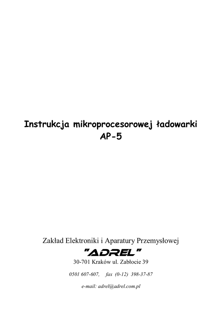 Instrukcja mikroprocesorowej ładowarki AP-5 Zakład Elektroniki i Aparatury Przemysłowej "ADREL" 30-701 Kraków ul. Zabłocie 39 0501 607-607, fax (0-12) 398-37-87 e-mail: [email protected] 1.Parametry.......................................................................................................................................3 2. Opis ogólny ..................................................................................................................................4 3. Wybór procesów i ustawianie parametrów ................................................................................4 3.1 Opis parametrów....................................................................................................................4 Start ..................................................................................................................................4 Rodzaj pracy ....................................................................................................................5 Typ akumulatora ( Typ Acc) ..........................................................................................6 Tryb ładowania ................................................................................................................6 Tryb rozładowania...........................................................................................................6 Prąd ładowania ................................................................................................................6 Prąd rozładowania ...........................................................................................................6 Ilość cykli.........................................................................................................................6 Pojemność........................................................................................................................7 Wyświetl pojemność .......................................................................................................7 Kalibracja .........................................................................................................................7 4. Ładowanie akumulatorów ...........................................................................................................7 5. Rozładowanie akumulatorów......................................................................................................8 6. Rozładowanie-ładowanie akumulatorów ...................................................................................9 7. Formowanie akumulatorów.........................................................................................................9 8. Regeneracja akumulatorów .......................................................................................................10 2 1.Parametry - Typ ładowanych akumulatorów: - Rodzaje pracy: - Tryb ładowania - Prąd ładowania/rozładowania Błąd pomiaru prądu Napięcie wyjściowe (ładowania) Napięcie zasilania Pobór prądu w stanie spoczynku Algorytmy ładowania dla Ni-Cd / Ni-Mh: Algorytmy rozładowania dla Ni-Cd / Ni-Mh: Napięcia odcięcia dla rozładowania: - Ilość cykli formowania/regeneracji: Zabezpieczenie przed odwrotnym podłączeniem zasilania/akumulatora: elektroniczne Zabezpieczenie przed przeciąŜeniem: automatyczne ograniczenie mocy Automatyczne sprawdzanie ilości cel akumulatora Interfejs uŜytkownika: 3 klawisze, wyświetlacz LCD 2 x 16 znaków Obudowa: tworzywo ABS Zaciski wejściowe: ‘krokodylki’ Zaciski wyjściowe: zaciski bananowe Informacje dostarczane w czasie procesów: o Typ akumulatora o Ilość cel o Rodzaj procesu wraz z numerem cyklu o Pojemność ładowania/rozładowania o Prąd ustawiony oraz aktualny o Napięcie ładowanego/rozładowywanego akumulatora o Napięcie zasilania o Czas trwania procesu o Przewidywany czas zakończenia procesu o Procentowy wskaźnik rozładowania Ustawianie napięcia odcięcia zasilania (ochrona akumulatora jako źródła zasilania) Pojemność ładowanych akumulatorów: 0,1Ah do 99Ah Pamięć nastaw: 10 (rodzaj procesu wraz z nastawami) Pamięć przebiegu procesu: 7 (pojemność ładowania/rozładowania) Kalibracja prądu ładowania/rozładowania Kalibracja napięcia wyjściowego Max moc wyjściowa ładowania: 100W Max moc rozładowywania: 30W Sygnalizacja końca procesu: na wyświetlaczu oraz dźwiękowa - - Ni-Cd 1 – 20 cel Ni-Mh 1 – 20 cel SLA/PB 1 - 14 cel Li-pol 1 - 8 cel A123 (LiPh) 1 - 9 cel ładowanie Rozładowanie Rozładowanie – ładowanie Regeneracja Formowanie Normalny ( stałoprądowy) Impulsowy z ‘dopychaniem’ 5A (ustawianie co 0,1A) 1,5% (moŜliwość kalibracji prądu) max 35V (moŜliwość kalibracji napięcia) 8V – 18V ok. 120mA dV/dt i -dV ( 5-poziomów) normalne i pełne Ni-Cd 0,95V (rozł. Normalne) 0,65V (rozł. Pełne) Ni-MH 1,1V ( rozł. Normalne) 0,95V (rozł. Pełne) Lit-Pol 3,4V SLA/PB 1,7V 1 do 8 3 2. Opis ogólny ładowarka AP-5 jest nowoczesną ładowarką całkowicie sterowaną przez mikroprocesor. Do wyświetlania informacji dla uŜytkownika słuŜy wyświetlacz alfanumeryczny LCD 2 linie po 16 znaków w linii. Ustawianie trybów pracy oraz parametrów jest bardzo intuicyjne i praktycznie nie wymaga instrukcji. Ładowarka jest zabezpieczona przed wszelkimi moŜliwymi stanami awaryjnymi ( odwrotne podłączenie, przeciąŜenie, przegrzanie itp.), dzięki temu nawet niewprawny uŜytkownik moŜe ją uŜywać bez obawy zniszczenia. Układ elektroniczny ładowarki został oparty na przetwornicy impulsowej z moŜliwością podwyŜszania napięcia. Dzięki temu sprawność energetyczna jest bardzo wysoka. Dzięki moŜliwości podwyŜszania napięcia moŜna ładować akumulatory, których napięcie znacznie przewyŜsza napięcie zasilania ładowarki. NaleŜy przy tym pamiętać o bilansie energetyczny, czyli Ŝe wtedy prąd pobierany ze źródła jest znacznie wyŜszy (nawet kilkakrotnie) niŜ prąd łado