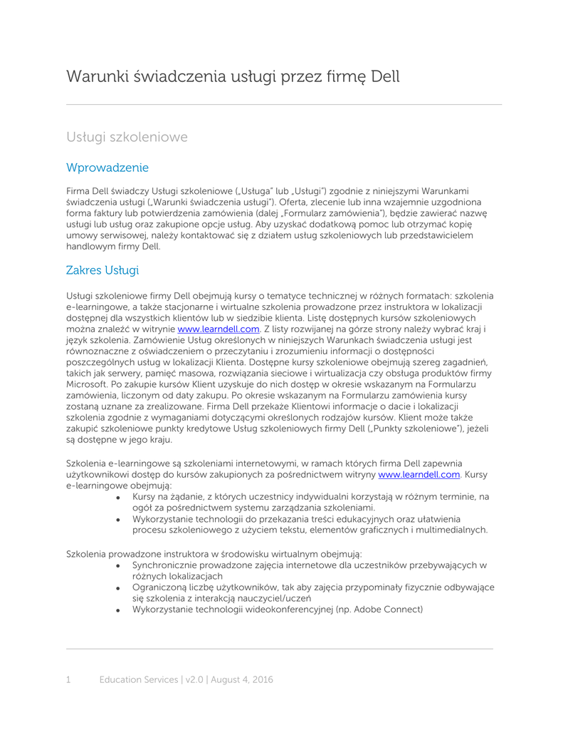 Warunki świadczenia usługi przez firmę Dell Usługi szkoleniowe Wprowadzenie Firma Dell świadczy Usługi szkoleniowe („Usługa” lub „Usługi”) zgodnie z niniejszymi Warunkami świadczenia usługi („Warunki świadczenia usługi”). Oferta, zlecenie lub inna wzajemnie uzgodniona forma faktury lub potwierdzenia zamówienia (dalej „Formularz zamówienia”), będzie zawierać nazwę usługi lub usług oraz zakupione opcje usług. Aby uzyskać dodatkową pomoc lub otrzymać kopię umowy serwisowej, należy kontaktować się z działem usług szkoleniowych lub przedstawicielem handlowym firmy Dell. Zakres Usługi Usługi szkoleniowe firmy Dell obejmują kursy o tematyce technicznej w różnych formatach: szkolenia e-learningowe, a także stacjonarne i wirtualne szkolenia prowadzone przez instruktora w lokalizacji dostępnej dla wszystkich klientów lub w siedzibie klienta. Listę dostępnych kursów szkoleniowych można znaleźć w witrynie www.learndell.com. Z listy rozwijanej na górze strony należy wybrać kraj i język szkolenia. Zamówienie Usług określonych w niniejszych Warunkach świadczenia usługi jest równoznaczne z oświadczeniem o przeczytaniu i zrozumieniu informacji o dostępności poszczególnych usług w lokalizacji Klienta. Dostępne kursy szkoleniowe obejmują szereg zagadnień, takich jak serwery, pamięć masowa, rozwiązania sieciowe i wirtualizacja czy obsługa produktów firmy Microsoft. Po zakupie kursów Klient uzyskuje do nich dostęp w okresie wskazanym na Formularzu zamówienia, liczonym od daty zakupu. Po okresie wskazanym na Formularzu zamówienia kursy zostaną uznane za zrealizowane. Firma Dell przekaże Klientowi informacje o dacie i lokalizacji szkolenia zgodnie z wymaganiami dotyczącymi określonych rodzajów kursów. Klient może także zakupić szkoleniowe punkty kredytowe Usług szkoleniowych firmy Dell („Punkty szkoleniowe”), jeżeli są dostępne w jego kraju. Szkolenia e-learningowe są szkoleniami internetowymi, w ramach których firma Dell zapewnia użytkownikowi dostęp do kursów zakupionych za pośrednictwem witryny www.learndell.com. Kursy e-learningowe obejmują: • Kursy na żądanie, z których uczestnicy indywidualni korzystają w różnym terminie, na ogół za pośrednictwem systemu zarządzania szkoleniami. • Wykorzystanie technologii do przekazania treści edukacyjnych oraz ułatwienia procesu szkoleniowego z użyciem tekstu, elementów graficznych i multimedialnych. Szkolenia prowadzone instruktora w środowisku wirtualnym obejmują: • Synchronicznie prowadzone zajęcia internetowe dla uczestników przebywających w różnych lokalizacjach • Ograniczoną liczbę użytkowników, tak aby zajęcia przypominały fizycznie odbywające się szkolenia z interakcją nauczyciel/uczeń • Wykorzystanie technologii wideokonferencyjnej (np. Adobe Connect) 1 Education Services | v2.0 | August 4, 2016 Szkolenia prowadzone przez instruktora w dowolnej lokalizacji otwartej dla klientów obejmują: • Synchronicznie prowadzone zajęcia z uczestnikami zgromadzonymi w jednym miejscu, do którego zapraszani są różni klienci • Szkolenia prowadzone przez instruktora w sali • Interakcję uczestników i instruktorów oraz okazje do omówienia materiałów szkoleniowych indywidualnie lub grupowo • Kurs zaplanowany z pełnym wykorzystaniem warunków panujących w sali oraz interakcji uczeń/nauczyciel Szkolenia prowadzone przez instruktora w siedzibie klienta obejmują: • Synchronicznie prowadzone zajęcia z uczestnikami zgromadzonymi w jednym miejscu w siedzibie klienta • Szkolenia prowadzone przez instruktora w warunkach zapewnionych przez klienta • Interakcję uczestników i instruktorów oraz okazje do omówienia materiałów szkoleniowych indywidualnie lub grupowo • Kurs zaplanowany z pełnym wykorzystaniem warunków panujących w sali oraz interakcji uczeń/nauczyciel Obowiązki związane ze szkoleniem prowadzonym przez instruktora w siedzibie klienta są następujące: Obowiązki klienta: Przed rozpoczęciem zaplanowanego szkolenia Klient wyznaczy osobę pełniącą funkcję punktu kontaktowego i wskaże ją na piśmie firmie Dell. Cała komunikacja związana z projektem będzie kierowana do punktu kontaktowego. Osoba pełniąca funkcję punktu kontaktowego: 2 Jest upoważniona do działania w imieniu Klienta w ramach wszystkich aspektów projektu oraz do rozwiązywania sprzeczności w wymaganiach Klienta Koordynuje odpowiednie zasoby i rezerwuje pomieszczenia do celów szkoleniowych Uzyskuje i przedstawia wymagania dotyczące projektu, informacje, dane, decyzje i zatwierdzenia w ciągu jednego dnia roboczego od otrzymania prośby o nie, jeżeli obie strony nie uzgodnią innego terminu udzielenia odpowiedzi. Przekazuje przed rozpoczęciem szkolenia dokładną liczbę uczestników wraz z ich imionami i nazwiskami Zapewnia w uzasadnionym zakresie instruktorom firmy Dell bezpieczny dostęp do parkingu przy obiekcie szkoleniowym, łączność telefoniczną oraz internetową, a także miejsce do pracy odpowiednio do wymagań Wypełnia kwestionariusz przekazany przez firmę Dell Klientowi przed rozpoczęciem kursów Education Services | v2.0 | August 4, 2016 Zapewnia: − − − − Projektor z ekranem do prezentacji Komputery klienckie dla uczestników do ćwiczeń Klient jest także zobowiązany do zapewnienia komputerów stacjonarnych lub laptopów dla każdego uczestnika szkolenia i instruktora. Tablicę lub flipchart z markerami Łączność internetową umożliwiającą zdalny dostęp do systemów Usług szkoleniowych firmy Dell — najlepiej połączenie przewodowe lub bardzo stabilne połączenie bezprzewodowe. Pomyślne przeprowadzenie ćwiczeń zależy od stabilności połączenia internetowego. Obowiązki firmy Dell: Firma Dell przesyła Klientowi kwestionariusz do wypełnienia. Ponadto firma Dell podejmuje następujące działania: Przekazuje konkretne wymagania logistyczne i sprzętowe związane z