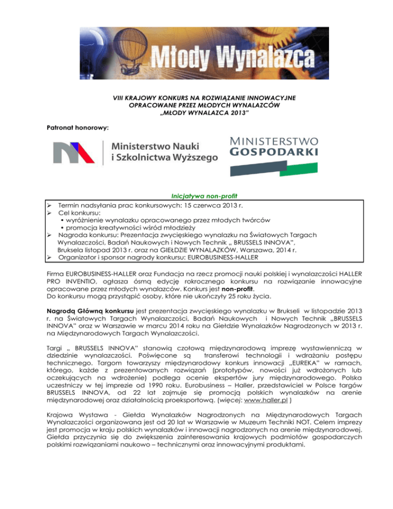 VIII KRAJOWY KONKURS NA ROZWIĄZANIE INNOWACYJNE OPRACOWANE PRZEZ MŁODYCH WYNALAZCÓW „MŁODY WYNALAZCA 2013” Patronat honorowy: Inicjatywa non-profit Termin nadsyłania prac konkursowych: 15 czerwca 2013 r. Cel konkursu: • wyróżnienie wynalazku opracowanego przez młodych twórców • promocja kreatywności wśród młodzieży Nagroda konkursu: Prezentacja zwycięskiego wynalazku na Światowych Targach Wynalazczości, Badań Naukowych i Nowych Technik „ BRUSSELS INNOVA”, Bruksela listopad 2013 r. oraz na GIEŁDZIE WYNALAZKÓW, Warszawa, 2014 r. Organizator i sponsor nagrody konkursu: EUROBUSINESS-HALLER Firma EUROBUSINESS-HALLER oraz Fundacja na rzecz promocji nauki polskiej i wynalazczości HALLER PRO INVENTIO, ogłasza ósmą edycję rokrocznego konkursu na rozwiązanie innowacyjne opracowane przez młodych wynalazców. Konkurs jest non-profit. Do konkursu mogą przystąpić osoby, które nie ukończyły 25 roku życia. Nagrodą Główną konkursu jest prezentacja zwycięskiego wynalazku w Brukseli w listopadzie 2013 r. na Światowych Targach Wynalazczości, Badań Naukowych i Nowych Technik „BRUSSELS INNOVA” oraz w Warszawie w marcu 2014 roku na Giełdzie Wynalazków Nagrodzonych w 2013 r. na Międzynarodowych Targach Wynalazczości. Targi „ BRUSSELS INNOVA” stanowią czołową międzynarodową imprezę wystawienniczą w dziedzinie wynalazczości. Poświęcone są transferowi technologii i wdrażaniu postępu technicznego. Targom towarzyszy międzynarodowy konkurs innowacji „EUREKA” w ramach, którego, każde z prezentowanych rozwiązań (prototypów, nowości już wdrożonych lub oczekujących na wdrożenie) podlega ocenie ekspertów jury międzynarodowego. Polska uczestniczy w tej imprezie od 1990 roku. Eurobusiness – Haller, przedstawiciel w Polsce targów BRUSSELS INNOVA, od 22 lat zajmuje się promocją polskich wynalazków na arenie międzynarodowej oraz działalnością proeksportową. (więcej: www.haller.pl ) Krajowa Wystawa - Giełda Wynalazków Nagrodzonych na Międzynarodowych Targach Wynalazczości organizowana jest od 20 lat w Warszawie w Muzeum Techniki NOT. Celem imprezy jest promocja w kraju polskich wynalazków i innowacji nagrodzonych na arenie międzynarodowej. Giełda przyczynia się do zwiększenia zainteresowania krajowych podmiotów gospodarczych polskimi rozwiązaniami naukowo – technicznymi oraz innowacyjnymi produktami. Zgłoszenia do udziału w konkursie prosimy nadsyłać do dnia 15 czerwca 2013 na adres organizatora konkursu: EUROBUSINESS-HALLER, ul. Obroki 133, 40-833 Katowice z dopiskiem "KONKURS „MŁODY WYNALAZCA 2013”. Zgłoszenie winno zawierać: imiona i nazwiska, adresy wykonawców i ewentualnie opiekuna projektu tytuł rozwiązania opis rozwiązania, etap wdrożeniowy projektu spodziewane efekty wdrożenia i ewentualne koszty wdrożeniowe ewentualne nagrody, opinie ewentualnie prototyp lub jego makieta. Krajowemu Jury konkursu przewodniczy dr inż. Krzysztof Biernat vice- przewodniczący Międzynarodowego Jury Targów „ BRUSSELS INNOVA”. Dodatkowych informacji udziela p. Edyta Wołczyk tel.: 032 355 38 01. Serdecznie zapraszamy do udziału w konkursie. Z poważaniem, Barbara Haller Prezes Eurobusiness-Haller Przedstawiciel w Polsce Międzynarodowych Targów Wynalazczości: BRUSSELS INNOVA w Belgii ; CONCOURS LEPINE we Francji; INPEX w USA; INST w Tajwanie, EUROINVENT w Rumunii, INNOVATION TURKIYE w Turcji, MEDINNOVA w Maroko Organizator Krajowego Konkursu : ”MŁODY WYNALAZCA” Współorganizator: KRAJOWEJ GIEŁDY WYNALAZKÓW, Warszawa; Partner: Krajowego Konkursu LIDER INNOWACJI; Międzynarodowych Targów Wynalazczości INTARG, Katowice ul. Obroki 133, 40-833 Katowice tel.: 32/ 355-38-01, tel./fax: 32/ 355-38-00 e-mail:[email protected]; www.haller.pl Patronat medialny: