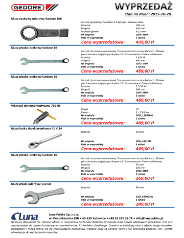 Stan na dzień: 2015-10-20 Klucz oczkowy udarowy Gedore 306 Ze stali specjalnej. Z oczkiem 12-kątnym. Stalowo-szare. Rozmiar 100 mm Długość 400 mm Grubość główki 41,5 mm Nr artykułu 1058-2104 Ilość w wyprzedaży 1 sztuka Cena wyprzedażowa: 499,00 zł Klucz płasko-oczkowy Gedore 1B Ze stali chromowo-wanadowej. Ten sam rozmiar na obu końcach. Główka pierścieniowa, odgięta pod kątem 10°. Chromowane. Główki szlifowane. Rozmiar 2.3/8 AF Długość 660 mm Nr artykułu 1042-2707 Ilość w wyprzedaży 1 sztuka Cena wyprzedażowa: 489,00 zł Klucz płasko-oczkowy Gedore 1B Ze stali chromowo-wanadowej. Ten sam rozmiar na obu końcach. Główka pierścieniowa, odgięta pod kątem 10°. Chromowane. Główki szlifowane. Rozmiar 2.7/16 AF Długość 660 mm Nr artykułu 1042-2806 Ilość w wyprzedaży 2 sztuki Cena wyprzedażowa: 489,00 zł Chwyt Zakres Nr artykułu Ilość w wyprzedaży ¼” 1 – 13,6 Nm GED_1228501L 1 sztuka Cena wyprzedażowa: 489,00 zł Rozmiar 24 mm Nr artykułu Ilość w wyprzedaży GED_41V-24L 3 sztuki Cena wyprzedażowa: 449,00 zł Wkrętak dynamometryczny 755-05 Grzechotka dwukierunkowa 41 V 24 Klucz płasko-oczkowy Gedore 1B Ze stali chromowo-wanadowej. Ten sam rozmiar na obu końcach. Główka pierścieniowa, odgięta pod kątem 10°. Chromowane. Główki szlifowane. Rozmiar 55 mm Długość 620 mm Nr artykułu 1042-3102 Ilość w wyprzedaży 1 sztuka Cena wyprzedażowa: 269,00 zł Rozmiar 60 mm Nr artykułu Ilość w wyprzedaży GED_6400930L 1 sztuka Cena wyprzedażowa: 249,00 zł Klucz płaski udarowy 133 60 Luna Polska Sp. z o.o. ul. Konduktorska 39B • 40-155 Katowice • +48 32 220 33 78 • [email protected] Niniejszy dokument nie stanowi oferty w rozumieniu przepisów Kodeksu Cywilnego oraz innych właściwych przepisów, lecz jest zaproszeniem do zawarcia umowy w rozumieniu art. 71 Kodeksu Cywilnego. Zawarte w niniejszej ulotce zdjęcia mają charakter poglądowy i mogą różnić się od rzeczywistych produktów. Podane ceny są cenami netto i nie zawierają podatku VAT. Oferta obowiązuje do wyczerpania zapasów. Stan na dzień: 2015-10-20 Łyżka do prostowania blach. Gedore 293 Odkuwana ze stali specjalnej i hartowana. Powierzchnie robocze dokładnie polerowane. Z dwiema mocno wygiętymi, gładkimi powierzchniami roboczymi. Długość powierzchni roboczej 200 mm Szerokość powierzchni roboczej 60x40 mm Długość całkowita 500 mm Nr artykułu 1602-0109 Ilość w wyprzedaży 1 sztuka Cena wyprzedażowa: 229,00 zł Nasadka. Z chwytem □ 1". Gedore D 21 Ze stali chromowo-wanadowej. Dwunastokątne. Zabezpieczane kołkiem poprzecznym. Chromowane. Rozmiar 2 ¾ NF Nr artykułu 1172-1503 Ilość w wyprzedaży 2 sztuki Cena wyprzedażowa: 209,00 zł Chwyt Długość Nr artykułu Ilość w wyprzedaży 1” 405 mm 1186-0509 1 sztuka Cena wyprzedażowa: 159,00 zł Przedłużacz trzpieniowy. Gedore 2190/16 Główka zapadkowa wymienna do kluczy dynamometrycznych Gedore 7412-00 Do kluczy dynamometrycznych z chwytem 9×12 mm. Chwyt 1/4” Max. moment 30 Nm Nr artykułu 5478-3204 Ilość w wyprzedaży 1 sztuka Cena wyprzedażowa: 159,00 zł Nasadka. Z chwytem □ 1". Gedore D 21 Ze stali chromowo-wanadowej. Dwunastokątne. Zabezpieczane kołkiem poprzecznym. Chromowane. Rozmiar 2.3/16 NF Nr artykułu 1172-0901 Ilość w wyprzedaży 1 sztuka Cena wyprzedażowa: 149,00 zł Nasadka. Z chwytem □ 1". Gedore D 21 Ze stali chromowo-wanadowej. Dwunastokątne. Zabezpieczane kołkiem poprzecznym. Chromowane. Rozmiar 2 ¼ NF Nr artykułu 1172-1008 Ilość w wyprzedaży 2 sztuki Cena wyprzedażowa: 149,00 zł Główka wymienna do kluczy dynamometrycznych Gedore 29963.36 Rozmiar Max. moment 36 mm 894 Nm Nr artykułu Ilość w wyprzedaży 12235-0606 1 sztuka Cena wyprzedażowa: 139,00 zł Luna Polska Sp. z o.o. ul. Konduktorska 39B • 40-155 Katowice • +48 32 220 33 78 • [email protected] Niniejszy dokument nie stanowi oferty w rozumieniu przepisów Kodeksu Cywilnego oraz innych właściwych przepisów, lecz jest zaproszeniem do zawarcia umowy w rozumieniu art. 71 Kodeksu Cywilnego. Zawarte w niniejszej ulotce zdjęcia mają charakter poglądowy i mogą różnić się od rzeczywistych produktów. Podane ceny są cenami netto i nie zawierają podatku VAT. Oferta obowiązuje do wyczerpania zapasów. Stan na dzień: 2015-10-20 Łyżka do prostowania blach. Gedore 291 Odkuwana ze stali specjalnej i hartowana. Powierzchnia robocza dokładnie polerowana. Gładka, podwójnie zgięta powierzchnia robocza. Długość powierzchni roboczej 200 mm Szerokość powierzchni roboczej 60x30 mm Długość całkowita 390 mm Nr artykułu 1600-0101 Ilość w wyprzedaży 1 sztuka Cena wyprzedażowa: 139,00 zł Szczypce do sprężyn hamulcowych. Gedore 135 Ze stali chromowo-wanadowej. Z osadzoną na przegubie kulistym objemką chwytną. Chromowane. Długość 330 mm Nr artykułu 1000-0107 Ilość w wyprzedaży 1 sztuka Cena wyprzedażowa: 109,00 zł Klucz płaski udarowy Gedore 133 Ze stali specjalnej. Wymiary wg DIN 133. Stalowo-szare. Rozmiar 55 mm Nr artykułu 1025-0801 Ilość w wyprzedaży 1 sztuka Cena wyprzedażowa: 109,00 zł Klucz płasko-oczkowy Gedore 1B Ze stali chromowo-wanadowej. Ten sam rozmiar na obu końcach. Główka pierścieniowa, odgięta pod kątem 10°. Chromowane. Główki szlifowane. Rozmiar 38 mm Długość 460 mm Nr artykułu 1041-2757 Ilość w wyprzedaży 1 sztuka Cena wyprzedażowa: 109,00 zł Długość Średnica Masa Nr artykułu Ilość w wyprzedaży 300 mm 40 mm 446 g 1887-0105 1 sztuka Cena wyprzedażowa: 99,00 zł Młotek do wyklepywania Gedore 276 Młotek karoseryjny. Gedore 277 Do napraw karoserii itp. Lakierowane piecowo na niebiesko, powierzchnie robocze polerowane. Trzonek z drewna jesionowego. Długość 137 mm Średnica 37 mm Masa 350 g Nr artykułu 1888-0104 Ilość w wyprzedaży 1 sztuka Cena wyprzedażowa: 99,00 zł Chwyt Długość Nr artykułu Ilość w wyprzedaży ¾” 400 mm 1186-0400 2 sztuki Cena wyprzedażowa: 89,00 zł Przedłu