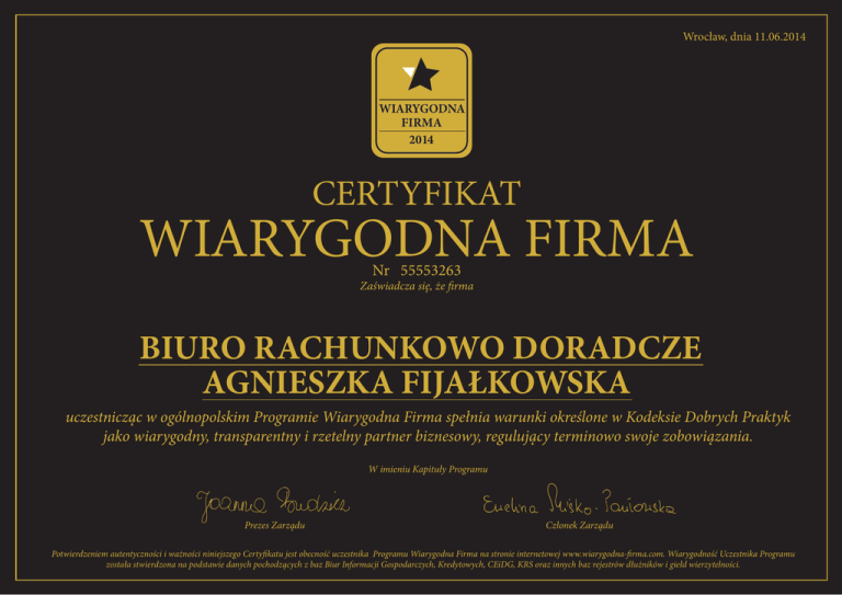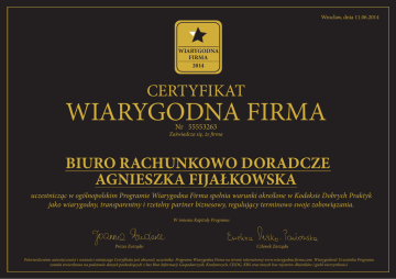 Wrocław, dnia 11.06.2014 CERTYFIKAT WIARYGODNA FIRMA Nr 55553263 Zaświadcza się, że firma BIURO RACHUNKOWO DORADCZE AGNIESZKA FIJAŁKOWSKA uczestnicząc w ogólnopolskim Programie Wiarygodna Firma spełnia warunki określone w Kodeksie Dobrych Praktyk jako wiarygodny, transparentny i rzetelny partner biznesowy, regulujący terminowo swoje zobowiązania. W imieniu Kapituły Programu Prezes Zarządu Członek Zarządu Potwierdzeniem autentyczności i ważności niniejszego Certyfikatu jest obecność uczestnika Programu Wiarygodna Firma na stronie internetowej www.wiarygodna-firma.com. Wiarygodność Uczestnika Programu została stwierdzona na podstawie danych pochodzących z baz Biur Informacji Gospodarczych, Kredytowych, CEiDG, KRS oraz innych baz rejestrów dłużników i giełd wierzytelności.