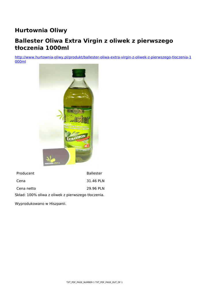 Hurtownia Oliwy Ballester Oliwa Extra Virgin z oliwek z pierwszego tłoczenia 1000ml http://www.hurtownia-oliwy.pl/produkt/ballester-oliwa-extra-virgin-z-oliwek-z-pierwszego-tloczenia-1 000ml Producent Ballester Cena 31.46 PLN Cena netto 29.96 PLN Skład: 100% oliwa z oliwek z pierwszego tłoczenia. Wyprodukowano w Hiszpanii. TXT_PDF_PAGE_NUMBER 1 TXT_PDF_PAGE_OUT_OF 1