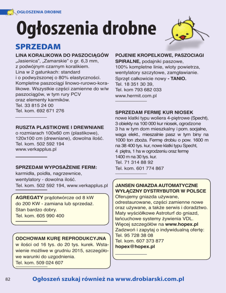 OGŁOSZENIA DROBNE Ogłoszenia drobne SPRZEDAM LINA KORALIKOWA DO PASZOCIĄGÓW „Jasienica”, „Zamarskie” o gr. 6,3 mm, z podwójnym czarnym koralikiem. Lina w 2 gatunkach: standard i o podwyższonej o 80% elastyczności. Kompletne paszociągi linowo-rurowo-koralikowe. Wszystkie części zamienne do w/w paszociągów, w tym rury PCV oraz elementy karmików. Tel. 33 815 24 00 Tel. kom. 692 671 276 RUSZTA PLASTIKOWE I DREWNIANE o rozmiarach 100x60 cm (plastikowe), 120x100 cm (drewniane), dowolna ilość. Tel. kom. 502 592 194 www.verkapplus.pl SPRZEDAM WYPOSAŻENIE FERM: karmidła, poidła, nagrzewnice, wentylatory - dowolna ilość. Tel. kom. 502 592 194, www.verkapplus.pl AGREGATY prądotwórcze od 8 kW do 200 KW - zamiana lub sprzedaż. Stan bardzo dobry. Tel. kom. 605 990 400 ODCHOWAM KURĘ REPRODUKCYJNA w ilości od 16 tys. do 20 tys. kurek. Wstawienie możliwe w grudniu 2015, szczegółowe warunki do uzgodnienia. Tel. kom. 509 024 607 82 POJENIE KROPELKOWE, PASZOCIAGI SPIRALNE, podajniki paszowe, 100% kompletne linie, wloty powietrza, wentylatory szczytowe, zamgławianie. Sprzęt całkowicie nowy - TANIO. Tel. 18 351 30 39, Tel. kom 793 682 033 www.hermit.com.pl SPRZEDAM FERMĘ KUR NIOSEK nowe klatki typu woliera 4-piętrowe (Specht), 3 obiekty na 100 000 kur niosek, ogrodzone 3 ha w tym dom mieszkalny i pom. socjalne, waga elekt., mieszalnie pasz w tym biny na 1000 ton zboża. Fermę drobiu o pow. 1600 m na 38 400 tys. kur, nowe klatki typu Specht, 4 piętra, 1 ha w ogrodzeniu oraz fermę 1400 m na 30 tys. kur. Tel. 71 314 88 92 Tel. kom. 601 774 867 JANSEN GNIAZDA AUTOMATYCZNE WYŁĄCZNY DYSTRYBUTOR W POLSCE Oferujemy gniazda używane, odrestaurowane, części zamienne nowe oraz używane, a także serwis i doradztwo. Maty wyściółkowe Astroturf do gniazd, łańcuchowe systemy żywienia VDL. Więcej szczegółów na www.hopex.pl Zadzwoń i zapytaj o indywidualną ofertę: Tel. 95 728 38 08 Tel. kom. 607 373 877 [email protected] Ogłoszeń szukaj również na www.drobiarski.com.pl OGŁOSZENIA DROBNE SPRZEDAM AGREGATY prądotwórcze od 10 kVA do 2500 kVA - dobór agregatu w obiekcie inwestora - dostawy własnym transporetem - montaż - serwis gwarancyjny i pogwarancyjny Tel. 52 351 62 45 Tel. kom. 601 639 554 www.janaszkiewicz.eu ŁUSKARKI lodu „MAJA” i „HIGEL” od 100 do 6000 kg/dobę. Nowe i używane z gwarancją. Remonty maszyn. Najniższe ceny w kraju. Tel. kom. 602 283 252, Tel./fax. 33 815 61 35, e-mail: [email protected] Zapraszamy na naszą stronę: www.phu-west.pl SPRZEDAM Komory lęgowe D-36 - 3 sztuki Komory klujnikowe Atlas 180 - 2 szt Tace lęgowe( 50-siątki) Tel. kom. 509 223 050 AGOS SILOSY PASZOWE / ZBOŻOWE 5-140 t największy producent silosów Dozownik ziarna 5% - 50% - montowany pod koszem paszociągu lub z zasobnikiem 1200 kg. www.silosypaszowe.pl Tel/fax. 95 741 16 27 AGREGATY PRĄDOTWÓRCZE od 20 KW do 1000 KW, nowe i używane z gwarancją i dowozem na miejsce, naprawy główne i bieżące. Tel. kom. 605 209 828 www.agregaty-pradotworcze-kruszwica.pl MATY DEZYNFEKCYJNE do ferm drobiarskich, wylęgarni, ubojni. Rozmiar standard : 90x60 cm. Firma realizuje również zamówienia wg indywidualnych potrzeb Klienta. V I L S Tel. kom. 698 085 200 SORTOWNICE DO JAJ - naprawy bieżące, remonty kapitalne sortownic do jaj - skup, sprzedaż sortownic do jaj Tomax S.c. Tel. kom. 603 533 506, 603 533 502 www.sortownice.cba.pl SPRZEDAM GNIAZDA DO AUTOMATYCZNEGO zbioru jaj, 5 urządzeń firmy JANSEN, FINHAGE. Urządzenia były zainstalowane w kurnikach o wymiarach 85 x 12 m, wielkość XXL, do zainstalowania w stadach nioski towarowej i rodzicielskiej. Możliwy demontaż, transport i montaż u zainteresowanych. Tel. kom. 501 232 080 Sprzedaż bez pośredników Ogłoszeń szukaj również na www.drobiarski.com.pl 83 OGŁOSZENIA DROBNE SPRZEDAM SPRZEDAM: 4 rzędy, woliery, „Comfort 2”. Producent Firma Janssen z Barneveld, Holandia. Woliera wraz z 3 rzędami gniazd, w każdym rzędzie 51 gniazd z obsadą: ok. 21.000 kur. Dodatkowe wyposażenie: transporter poprzeczny do zbioru jaj. Urządzenia zostaną zwolnione w miesiącu sierpniu 2015r. Kontakt: Firma SPECHT, pan Hans Theo Ten Elsen, telefon: +49 1738796582 SPRZEDAŻ KUREK RASY ISA BROWN od 9 października 2015, wiek 15 tyg. Program szczepień do wglądu, dodatkowo szczepienia autoszczepionką SG. Ilość ok 45 000 tys. Ferma Drobiu Karniszyn Tel kom. 509 445 272 KARCHER - NOWE I UŻYWANE MYJKI CIŚNIENIOWE. Gwarancja, serwis, osprzęt. TRAKTOROWE AGREGATY PRĄDOTWÓRCZE WOM 16-110 kVa. Największy wybór w Polsce. ROZDRABNIACZE, SIECZKARNIE, ŚCIELARKI DO SŁOMY TAGLE, KIDD. Milicz, Tel. kom. 606 211 056, 507 158 699 84 SORTOWNICE Sprzedaż - Skup Wydajność od 1600 szt./h do 50.000 szt./h, możliwość wraz z drukarką. Naprawy, remonty kapitalne - wszystkie typy. Tel./fax. 61 286 38 38 Tel. kom. 603 930 803 www.sortownicejuszczak.pl SPRZEDAM KURKI ODCHOWANE, towarowe i ogólnoużytkowe w różnym wieku. Tel. kom. 605 834 710 JAJA KURZE SKUP-SPRZEDAŻ Zakład Pakowania Jaj „KURAK”, Bieżuń, woj. mazowieckie. Tel./fax 23 68 41 718 Tel. kom. 606 334 400 SPRZEDAM TANIO: rura ze smoczkiem s i miseczką jednoramienną - 350 m supersmoczek - 1400 szt reduktor koral niskiego ciśnienia - 5 szt karmidło brojler leo - 290 szt nagrzewnica lb white 66 kW z reduktorami - 3 szt Tel. kom. 606 369 739 Ogłoszeń szukaj również na www.drobiarski.com.pl OGŁOSZENIA DROBNE SPRZEDAM TANIO SPRZEDAM GNIAZDA AUTOMATYCZNE firmy BIG DUTCHMAN o długości 110 m dla kury lekkiej. Stan bardzo dobry. Tel. kom. 604 211 193 KURKI ODCHOWANE ROSA kolorowe w różnym wieku, możliwy dowóz. Sępólno Tel. kom. 600 539 790, 600 500 706 SPRZEDAM GNIAZDA AUTOMATYCZNE VENCOMATIC długość 108 mb, rok prod. 2011, ruszty z obydwóch stron, stan bardzo dobry, atrakcyjna cena. woj. wielkopolskie, Tel. kom. 602 831 199 SPRZEDAM KURKI Novogen, Rosa i Lohmann brązowy, biały oraz sandy (produkuje kremowe jaja) w ilości 150 tys. sztuk,