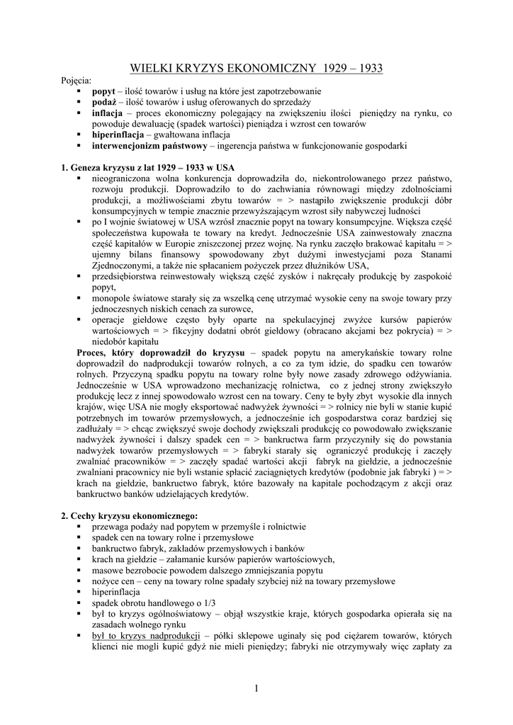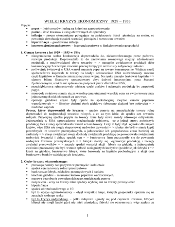 WIELKI KRYZYS EKONOMICZNY 1929 – 1933 Pojęcia: popyt – ilość towarów i usług na które jest zapotrzebowanie podaż – ilość towarów i usług oferowanych do sprzedaży inflacja – proces ekonomiczny polegający na zwiększeniu ilości pieniędzy na rynku, co powoduje dewaluację (spadek wartości) pieniądza i wzrost cen towarów hiperinflacja – gwałtowana inflacja interwencjonizm państwowy – ingerencja państwa w funkcjonowanie gospodarki 1. Geneza kryzysu z lat 1929 – 1933 w USA nieograniczona wolna konkurencja doprowadziła do, niekontrolowanego przez państwo, rozwoju produkcji. Doprowadziło to do zachwiania równowagi między zdolnościami produkcji, a możliwościami zbytu towarów = > nastąpiło zwiększenie produkcji dóbr konsumpcyjnych w tempie znacznie przewyższającym wzrost siły nabywczej ludności po I wojnie światowej w USA wzrósł znacznie popyt na towary konsumpcyjne. Większa część społeczeństwa kupowała te towary na kredyt. Jednocześnie USA zainwestowały znaczna część kapitałów w Europie zniszczonej przez wojnę. Na rynku zaczęło brakować kapitału = > ujemny bilans finansowy spowodowany zbyt dużymi inwestycjami poza Stanami Zjednoczonymi, a także nie spłacaniem pożyczek przez dłużników USA, przedsiębiorstwa reinwestowały większą część zysków i nakręcały produkcję by zaspokoić popyt, monopole światowe starały się za wszelką cenę utrzymać wysokie ceny na swoje towary przy jednoczesnych niskich cenach za surowce, operacje giełdowe często były oparte na spekulacyjnej zwyżce kursów papierów wartościowych = > fikcyjny dodatni obrót giełdowy (obracano akcjami bez pokrycia) = > niedobór kapitału Proces, który doprowadził do kryzysu – spadek popytu na amerykańskie towary rolne doprowadził do nadprodukcji towarów rolnych, a co za tym idzie, do spadku cen towarów rolnych. Przyczyną spadku popytu na towary rolne były nowe zasady zdrowego odżywiania. Jednocześnie w USA wprowadzono mechanizację rolnictwa, co z jednej strony zwiększyło produkcję lecz z innej spowodowało wzrost cen na towary. Ceny te były zbyt wysokie dla innych krajów, więc USA nie mogły eksportować nadwyżek żywności = > rolnicy nie byli w stanie kupić potrzebnych im towarów przemysłowych, a jednocześnie ich gospodarstwa coraz bardziej się zadłużały = > chcąc zwiększyć swoje dochody zwiększali produkcję co powodowało zwiększanie nadwyżek żywności i dalszy spadek cen = > bankructwa farm przyczyniły się do powstania nadwyżek towarów przemysłowych = > fabryki starały się ograniczyć produkcję i zaczęły zwalniać pracowników = > zaczęły spadać wartości akcji fabryk na giełdzie, a jednocześnie zwalniani pracownicy nie byli wstanie spłacić zaciągniętych kredytów (podobnie jak fabryki ) = > krach na giełdzie, bankructwo fabryk, które bazowały na kapitale pochodzącym z akcji oraz bankructwo banków udzielających kredytów. 2. Cechy kryzysu ekonomicznego: przewaga podaży nad popytem w przemyśle i rolnictwie spadek cen na towary rolne i przemysłowe bankructwo fabryk, zakładów przemysłowych i banków krach na giełdzie – załamanie kursów papierów wartościowych, masowe bezrobocie powodem dalszego zmniejszania popytu nożyce cen – ceny na towary rolne spadały szybciej niż na towary przemysłowe hiperinflacja spadek obrotu handlowego o 1/3 był to kryzys ogólnoświatowy – objął wszystkie kraje, których gospodarka opierała się na zasadach wolnego rynku był to kryzys nadprodukcji – półki sklepowe uginały się pod ciężarem towarów, których klienci nie mogli kupić gdyż nie mieli pieniędzy; fabryki nie otrzymywały więc zapłaty za 1 wyprodukowany towar i nie mogły zapłacić należności ani wypłacić pensji = > zwolnienia pracowników 3. Metody zwalczania kryzysu interwencjonizm państwowy – państwo przejęło kontrolę nad gospodarką co zakończyło okres nieograniczonej niczym wolnej konkurencji. Państwo zaczęło wyznaczać płace minimalne i maksymalny czas pracy, wprowadziło zasady uczciwej konkurencji zahamowanie produkcji by zrównoważyć popyt i podaż zwiększenie eksportu i zmniejszenie importu, by chronić rodzimych producentów wprowadzenie ustawodawstwa socjalnego rozpoczęcie robót publicznych na wielką skalę, przy których zatrudniano bezrobotnych ( budowa autostrad, tam itp.) zniesienie parytetu złota – do tej pory kraj mógł wypuścić na rynek taką ilość waluty na jaką miał pokrycie w złocie. Od tej pory ilość pieniędzy w obiegu miała być zależna od oszacowanych dóbr narodowych druk pieniędzy bez pokrycia, aby odrodzić popyt – łagodna, kontrolowana inflacja, zmniejszenie areału ziem uprawnych by zmniejszyć nadprodukcję żywności. Większość tych metod zastosował po raz pierwszy rząd amerykański zgodnie z planem odrodzenia gospodarczego. Przygotował go Franklin Delano Roosevelt i dzięki niemu wygrał wybory prezydenckie. Program ten nazwano New Deal = Nowy Ład. 2