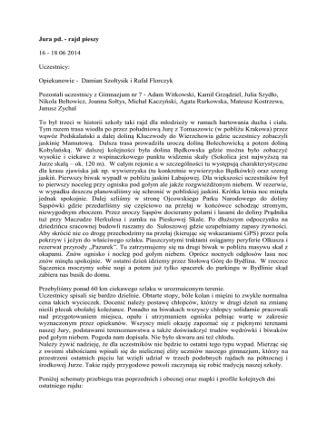 Jura pd. - rajd pieszy 16 - 18 06 2014 Uczestnicy: Opiekunowie - Damian Szołtysik i Rafał Florczyk Pozostali uczestnicy z Gimnazjum nr 7 - Adam Witkowski, Kamil Grządziel, Julia Szydło, Nikola Bełtowicz, Joanna Sołtys, Michał Kaczyński, Agata Rurkowska, Mateusz Kostrzewa, Janusz Zychal To był trzeci w historii szkoły taki rajd dla młodzieży w ramach hartowania ducha i ciała. Tym razem trasa wiodła po przez południową Jurę z Tomaszowic (w pobliżu Krakowa) przez wąwóz Podskalański a dalej doliną Kluczwody do Wierzchowia gdzie uczestnicy zobaczyli jaskinię Mamutową. Dalsza trasa prowadziła uroczą doliną Bolechowicką a potem doliną Kobylańską. W dalszej kolejności była dolina Będkowska gdzie można było zobaczyć wysokie i ciekawe z wspinaczkowego punktu widzenia skały (Sokolica jest najwyższą na Jurze skałą – ok. 120 m). W całym rejonie a w szczególności tu występują charakterystyczne dla krasu zjawiska jak np. wywierzyska (tu konkretnie wywierzysko Będkówki) oraz szereg jaskiń. Pierwszy biwak wypadł w pobliżu jaskini Łabajowej. Dla większości uczestników był to pierwszy noceleg przy ognisku pod gołym ale jakże rozgwieżdżonym niebem. W rezerwie, w wypadku deszczu planowaliśmy się schronić w pobliskiej jaskini. Krótka letnia noc minęła jednak spokojnie. Dalej szliśmy w stronę Ojcowskiego Parku Narodowego do doliny Sąspówki gdzie przedarliśmy się częściowo na przełaj w końcówce schodząc stromym, niewygodnym zboczem. Przez uroczy Sąspów docieramy polami i lasami do doliny Prądnika tuż przy Maczudze Herkulesa i zamku na Pieskowej Skale. Po dłuższym odpoczynku na dziedzińcu szacownej budowli ruszamy do Sułoszowej gdzie uzupełniamy zapasy żywności. Aby skrócić nie co drogę przechodzimy na przełaj (kierując się wskazaniami GPS) przez pola pokrzyw i jeżyn do właściwego szlaku. Piaszczystymi traktami osiągamy peryferie Olkusza i rezerwat przyrody „Pazurek”. Tu zatrzymujemy się na drugi biwak w pobliżu masywu skał z okapami. Znów ognisko i nocleg pod gołym niebem. Oprócz nocnych odgłosów lasu noc znów minęła spokojnie. W ostatni dzień idziemy przez Stołową Górę do Bydlina. W rzeczce Sączenica moczymy sobie nogi a potem już tylko spacerek do parkingu w Bydlinie skąd zabiera nas busik do domu. Przebyliśmy ponad 60 km ciekawego szlaku w urozmaiconym terenie. Uczestnicy spisali się bardzo dzielnie. Obtarte stopy, bóle kolan i mięśni to zwykle normalna cena takich wycieczek. Docenić należy postawę chłopców, którzy w drugi dzień na zmianę nieśli plecak obolałej koleżance. Ponadto na biwakach wszyscy chłopcy solidarnie pracowali nad przygotowaniem miejsca, opału i utrzymaniem ogniska pełniąc wartę w zakresie wyznaczonym przez opiekunów. Wszyscy mieli okazję zapoznać się z pięknymi terenami naszej Jury, podstawami terenoznawstwa a także doświadczyć trudów wędrówki i biwaków pod gołym niebem. Pogoda nam dopisała. Nie było skwaru ani też chłodu. Należy żywić nadzieję, że dla uczestników nie będzie to ostatni tego typu wypad. Mierząc się z swoimi słabościami wpisali się do nielicznej elity uczniów naszego gimnazjum, którzy na przestrzeni ostatnich pięciu lat wzięli udział w trzech podobnych rajdach na północnej i środkowej Jurze. Takie rajdy przygodowe powoli zaczynają się robić tradycją naszej szkoły. Poniżej schematy przebiegu tras poprzednich i obecnej oraz mapki i profile kolejnych dni ostatniego rajdu: Dzień 1 Dzień 2 Dzień 3
