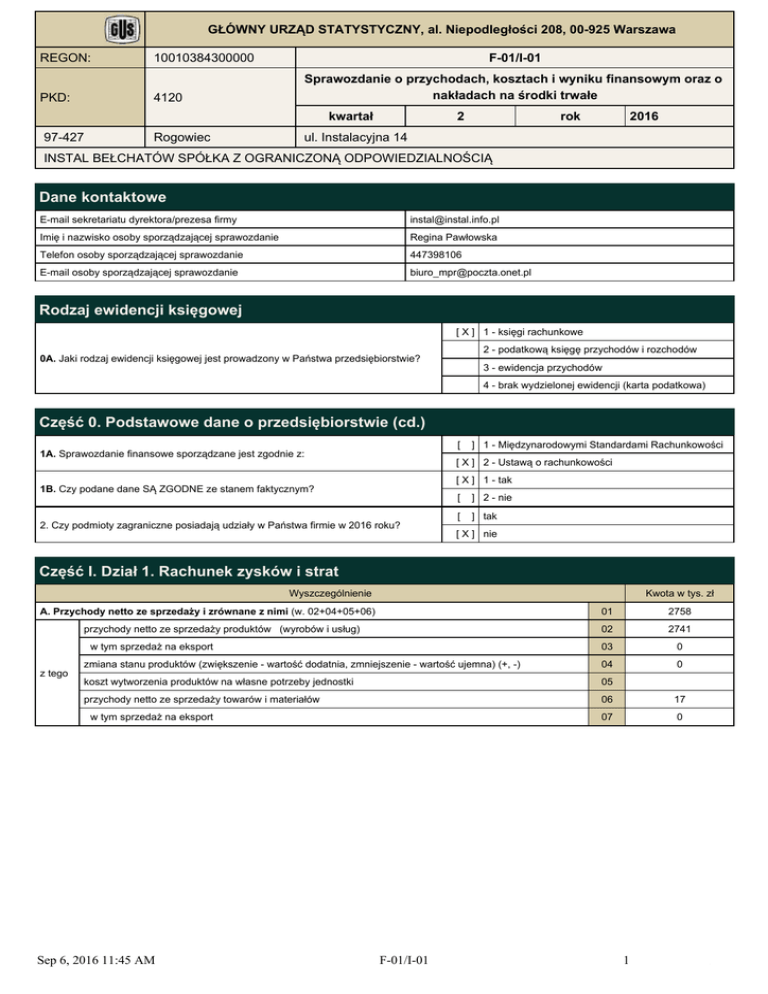 GŁÓWNY URZĄD STATYSTYCZNY, al. Niepodległości 208, 00-925 Warszawa REGON: PKD: 10010384300000 4120 F-01/I-01 Sprawozdanie o przychodach, kosztach i wyniku finansowym oraz o nakładach na środki trwałe kwartał 97-427 Rogowiec 2 rok 2016 ul. Instalacyjna 14 INSTAL BEŁCHATÓW SPÓŁKA Z OGRANICZONĄ ODPOWIEDZIALNOŚCIĄ Dane kontaktowe E-mail sekretariatu dyrektora/prezesa firmy [email protected] Imię i nazwisko osoby sporządzającej sprawozdanie Regina Pawłowska Telefon osoby sporządzającej sprawozdanie 447398106 E-mail osoby sporządzającej sprawozdanie [email protected] Rodzaj ewidencji księgowej [ X ] 1 - księgi rachunkowe 2 - podatkową księgę przychodów i rozchodów 0A. Jaki rodzaj ewidencji księgowej jest prowadzony w Państwa przedsiębiorstwie? 3 - ewidencja przychodów 4 - brak wydzielonej ewidencji (karta podatkowa) Część 0. Podstawowe dane o przedsiębiorstwie (cd.) [ 1A. Sprawozdanie finansowe sporządzane jest zgodnie z: ] 1 - Międzynarodowymi Standardami Rachunkowości [ X ] 2 - Ustawą o rachunkowości [ X ] 1 - tak 1B. Czy podane dane SĄ ZGODNE ze stanem faktycznym? 2. Czy podmioty zagraniczne posiadają udziały w Państwa firmie w 2016 roku? [ ] 2 - nie [ ] tak [ X ] nie Część I. Dział 1. Rachunek zysków i strat Wyszczególnienie Kwota w tys. zł A. Przychody netto ze sprzedaży i zrównane z nimi (w. 02+04+05+06) 01 2758 02 2741 03 0 zmiana stanu produktów (zwiększenie - wartość dodatnia, zmniejszenie - wartość ujemna) (+, -) 04 0 koszt wytworzenia produktów na własne potrzeby jednostki 05 przychody netto ze sprzedaży towarów i materiałów 06 17 07 0 przychody netto ze sprzedaży produktów (wyrobów i usług) w tym sprzedaż na eksport z tego w tym sprzedaż na eksport Sep 6, 2016 11:45 AM F-01/I-01 1 /7 Część I. Dział 1. Rachunek zysków i strat (cd.) Wyszczególnienie Kwota w tys. zł B. Koszty działalności operacyjnej (w. 09+10+12+14+17+19+22+25) 08 3217 amortyzacja 09 269 zużycie materiałów i energii 10 867 11 17 usługi obce 12 376 w tym zakupione w celu odsprzedaży (podwykonawstwo) 13 205 podatki i opłaty 14 185 15 0 16 0 17 1176 18 1171 19 238 składki z tytułu ubezpieczeń społecznych 20 224 wydatki z tytułu szkolenia pracowników w tym energii w tym podatek akcyzowy w tym ze sprzedaży produktów z tego wynagrodzenia w tym ze stosunku pracy ubezpieczenia społeczne i inne świadczenia w tym 21 0 pozostałe koszty rodzajowe 22 89 podróże służbowe 23 składki z tytułu ubezpieczeń majatkowych i osobowych 24 59 25 17 w tym wartość sprzedanych towarów i materiałów C1. Zysk ze sprzedaży (w. 01-08)>0 26 0 C2. Strata ze sprzedaży (w. 01-08)<0 27 459 D. Pozostałe przychody operacyjne (w. 29+30+31) 28 89 zysk z tytułu rozchodu niefinansowych aktywów trwałych 29 75 dotacje 30 inne przychody operacyjne 31 14 w tym rozwiązane rezerwy 32 0 E. Pozostałe koszty operacyjne (w. 34+35+36) 33 15 z tego z tego strata z tytułu rozchodu niefinansowych aktywów trwałych 34 aktualizacja wartości aktywów niefinansowych 35 inne koszty operacyjne 36 w tym rezerwy na przyszłe zobowiązania 37 odpisane wierzytelności (w wyniku postępowań upadłościowych, układowych i naprawczych) 38 15 F1. Zysk na działalności operacyjnej (w. 01-08+28-33)>0 39 0 F2. Strata na działalności operacyjnej (w. 01-08+28-33)<0 40 385 Sep 6, 2016 11:45 AM F-01/I-01 2 /7 G. Przychody finansowe (w. 42+43+46+47+48) 41 dywidendy i udziały w zyskach 42 odsetki 43 w tym od udzielonych pożyczek i lokat terminowych z tego 42 44 w tym przychody odsetkowe (odsetki od pożyczek udzielonych innym przedsiębiorstwom) 45 zysk z tytułu rozchodu aktywów finansowych 46 aktualizacja wartości aktywów finansowych 47 inne 48 w tym nadwyżka dodatnich różnic kursowych nad ujemnymi 49 H. Koszty finansowe (w. 51+53+54+55) 50 odsetki 0 51 w tym odsetki od kredytów i pożyczek z tego 42 52 strata z tytułu rozchodu aktywów finansowych 53 aktualizacja wartości aktywów finansowych 54 inne 55 w tym nadwyżka ujemnych różnic kursowych nad dodatnimi 56 I1. Zysk brutto (w. 01-08+28-33+41-50)>0 57 I2. Strata brutto (w. 01-08+28-33+41-50)<0 58 343 J. Podatek dochodowy 59 0 część bieżąca 60 część odroczona 61 z tego K. Pozostałe obowiązkowe zmniejszenie zysku (zwiększenie straty) 62 L1. Zysk netto (w. 01-08+28-33+41-50-59-62)>0 63 L2. Strata netto (w. 01-08+28-33+41-50-59-62)<0 64 Sep 6, 2016 11:45 AM F-01/I-01 343 3 /7 Część I. Dane uzupełniające Wyszczególnienie Kwota w tys. zł Przychody netto ze sprzedaży i zrównane z nimi 2758 65 w tym dotacje do działalności podstawowej Przychody netto ze sprzedaży produktów 0 2741 66 w tym dotacje do produktów (wyrobów i usług) 0 Wydatki na spłatę zadłużenia (raty kapitałowe i odsetki zapłacone bankom, przedsiębiorstwom niefinansowym) 67 0 Wartość zakupów z importu ogółem 68 0 import surowców, materiałów i półfabrykatów na cele produkcyjne 69 0 import towarów przeznaczonych do dalszej odsprzedaży 70 0 w tym Podatek akcyzowy ogółem w tym 71 0 od wyrobów krajowych (producent) 72 0 od towarów sprowadzanych z zagranicy 73 0 od energii elektrycznej 74 0 W przeliczeniu na pełne etaty Wyszczególnienie Przeciętne zatrudnienie w przeliczeniu na pełne etaty z jednym znakiem po przecinku (od początku roku do końca okresu sprawozdawczego) 75 44 Wyszczególnienie Stan w osobach Liczba pracujących w osobach (stan w ostatnim dniu okresu sprawozdawczego) Sep 6, 2016 11:45 AM F-01/I-01 76 43 4 /7 Część I. Dział 2. Aktywa trwałe i obrotowe Wyszczególnienie 0 2 3 01 5540 2995 należności długoterminowe ogółem 02 0 0 inwestycje długoterminowe ogółem 03 2500 0 A. Aktywa trwałe w tym Stan na koniec okresu sprawozdawczego Stan na 01.01 B. Aktywa obrotowe (w. 05+10+13+16) 04 2969 4795 I. Zapasy ogółem 05 475 396 materiały 06 382 396 półprodukty i produkty w toku 07 92 produkty gotowe 08 0 towary 09 0 10 1992 1000 z tytułu dostaw i usług (bez względu na ok