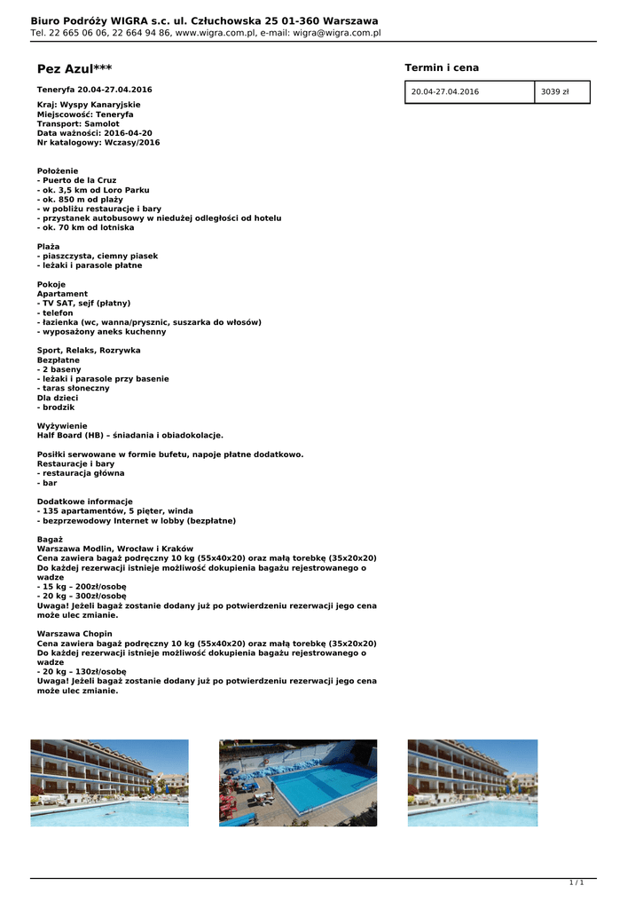 Biuro Podróży WIGRA s.c. ul. Człuchowska 25 01-360 Warszawa Tel. 22 665 06 06, 22 664 94 86, www.wigra.com.pl, e-mail: [email protected] Pez Azul*** Teneryfa 20.04-27.04.2016 Termin i cena 20.04-27.04.2016 3039 zł Kraj: Wyspy Kanaryjskie Miejscowość: Teneryfa Transport: Samolot Data ważności: 2016-04-20 Nr katalogowy: Wczasy/2016 Położenie - Puerto de la Cruz - ok. 3,5 km od Loro Parku - ok. 850 m od plaży - w pobliżu restauracje i bary - przystanek autobusowy w niedużej odległości od hotelu - ok. 70 km od lotniska Plaża - piaszczysta, ciemny piasek - leżaki i parasole płatne Pokoje Apartament - TV SAT, sejf (płatny) - telefon - łazienka (wc, wanna/prysznic, suszarka do włosów) - wyposażony aneks kuchenny Sport, Relaks, Rozrywka Bezpłatne - 2 baseny - leżaki i parasole przy basenie - taras słoneczny Dla dzieci - brodzik Wyżywienie Half Board (HB) – śniadania i obiadokolacje. Posiłki serwowane w formie bufetu, napoje płatne dodatkowo. Restauracje i bary - restauracja główna - bar Dodatkowe informacje - 135 apartamentów, 5 pięter, winda - bezprzewodowy Internet w lobby (bezpłatne) Bagaż Warszawa Modlin, Wrocław i Kraków Cena zawiera bagaż podręczny 10 kg (55x40x20) oraz małą torebkę (35x20x20) Do każdej rezerwacji istnieje możliwość dokupienia bagażu rejestrowanego o wadze - 15 kg – 200zł/osobę - 20 kg – 300zł/osobę Uwaga! Jeżeli bagaż zostanie dodany już po potwierdzeniu rezerwacji jego cena może ulec zmianie. Warszawa Chopin Cena zawiera bagaż podręczny 10 kg (55x40x20) oraz małą torebkę (35x20x20) Do każdej rezerwacji istnieje możliwość dokupienia bagażu rejestrowanego o wadze - 20 kg – 130zł/osobę Uwaga! Jeżeli bagaż zostanie dodany już po potwierdzeniu rezerwacji jego cena może ulec zmianie. 1/1 Powered by TCPDF (www.tcpdf.org)