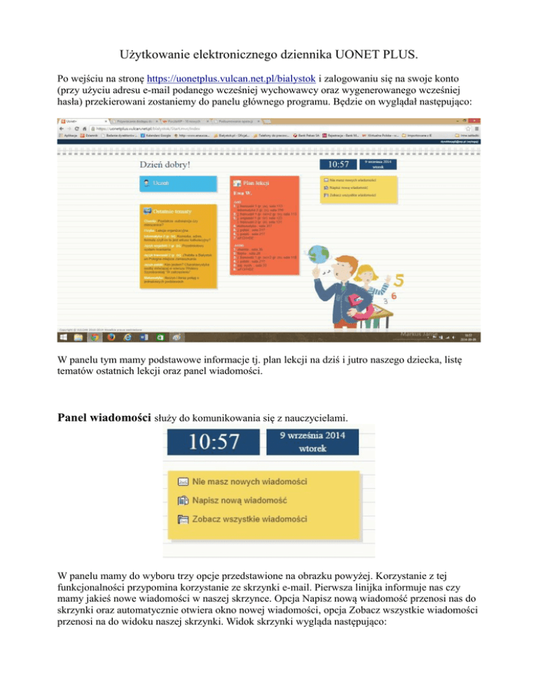 Użytkowanie elektronicznego dziennika UONET PLUS. Po wejściu na stronę https://uonetplus.vulcan.net.pl/bialystok i zalogowaniu się na swoje konto (przy użyciu adresu e-mail podanego wcześniej wychowawcy oraz wygenerowanego wcześniej hasła) przekierowani zostaniemy do panelu głównego programu. Będzie on wyglądał następująco: W panelu tym mamy podstawowe informacje tj. plan lekcji na dziś i jutro naszego dziecka, listę tematów ostatnich lekcji oraz panel wiadomości. Panel wiadomości służy do komunikowania się z nauczycielami. W panelu mamy do wyboru trzy opcje przedstawione na obrazku powyżej. Korzystanie z tej funkcjonalności przypomina korzystanie ze skrzynki e-mail. Pierwsza linijka informuje nas czy mamy jakieś nowe wiadomości w naszej skrzynce. Opcja Napisz nową wiadomość przenosi nas do skrzynki oraz automatycznie otwiera okno nowej wiadomości, opcja Zobacz wszystkie wiadomości przenosi na do widoku naszej skrzynki. Widok skrzynki wygląda następująco: Po lewej stronie znajduje się lista folderów. Po prawej stronie znajduje się lista wiadomości oraz poniżej jej treść. Aby utworzyć nową wiadomość jeśli znajdujemy się w panelu głównym klikamy wcześniej wspomnianą opcję Napisz nową wiadomość, jeśli znajdujemy się w skrzynce nad listą folderów znajduje się przycisk Nowa wiadomość. Otrzymujemy widok: Klikamy przycisk Dodaj/zmień adresatów pojawi nam się okno w którym na rozwijanej liście wybieramy grupę w jakiej znajduje się adresat np. wychowawcy. Następnie w polu Wyszukaj wpisujemy pierwsze litery nazwiska lub imienia naszego adresata. Klikamy na wybraną osobę zaznaczając ją, po czym klikamy znajdujący się na środku okienka + (plus), nasz adresat pojawi się po lewej stronie okna. Powtarzając ten krok możemy naszą wiadomość skierować równocześnie do kilku adresatów. Jeśli nastąpiła pomyłka i dodaliśmy nie tego adresata możemy zaznaczyć go (klikając na niego) po lewej stronie okna i kliknąć znajdujący się pośrodku – (minus) wówczas zostanie on usunięty z listy adresatów. Kiedy mamy już dodanych wszystkich adresatów klikamy znajdujący się poniżej przycisk Zapisz. Wrócimy tym samym do okna wiadomości. Wpisujemy temat, czyli czego dotyczyć będzie wiadomość oraz w polu Treść wpisujemy treść naszej wiadomości. Po czym klikamy znajdujący się poniżej przycisk Wyślij. Wiadomość zostanie wysłana do odbiorcy i możemy oczekiwać odpowiedzi. Aby wrócić do panelu głównego kliknij wizerunek domku z napisem Start znajdujący się w prawym górnym rogu. Informacje o Twoim dziecku Aby przejść do szerszych informacji dotyczących ucznia w panelu głównym należy kliknąć w niebieski prostokąt z napisem Uczeń. Po tej operacji otrzymamy następujący widok: W panelu tym znajdziemy w górnym prawym rogu adres e-mail na który się zalogowaliśmy. Poniżej opcję Wyloguj (zakończenie pracy z dziennikiem) Start (powrót do panelu głównego) Imię i Nazwisko naszego dziecka oraz klasę z której dziennik przeglądamy. Pola uczeń i Dziennik są rozwijanymi listami. UWAGA! Pole uczeń jest listą wyboru w przypadku gdy do jednej szkoły uczęszcza więcej niż jedno z naszych dzieci. Umożliwia ono przełączanie się między dziennikami naszych pociech. Wystarczy kliknąć na strzałkę znajdującą się po prawej stronie pola i rozwinie się lista z której wybieramy dziecko którego oceny lub frekwencję chcemy sprawdzić. Pole dziennik oznacza poziom i rok nauczania, możemy przeglądać dzienniki z ubiegłych lat, wybierając odpowiednie pole z rozwijanej listy. Aby to zrobić wystarczy nacisnąć strzałkę znajdującą się po prawej stronie pola i rozwinie się lista z której wybieramy interesujący nas dziennik. Po lewej stronie natomiast mamy menu nawigacji. Na samej górze mamy zakładki: * informacje o uczniu - w której znajdziemy podkategorie takie jak Oceny, Frekwencja, Uwagi i osiągnięcia oraz dane ucznia; * organizacja zajęć – podkategorie to plan zajęć, lekcje zrealizowane, Szkoła i nauczyciele, Terminarz sprawdzianów oraz Zadania domowe * Pomoc-tu znajdziemy informacje o programie oraz wszelkiego rodzaju instrukcje. Pierwsza z zakładek to informacje o uczniu klikając w podkategorie oceny wyświetlona zostanie tabela z przedmiotami i ocenami z danego przedmiotu, dodatkowo znajduje się tu jeszcze kolumna z przewidywaną oceną śródroczną oraz oceną śródroczną. W przypadku drugiego semestru nauczania będą to oceny końcowe. Pod paskiem podkategorii znajdziemy jeszcze dodatkowo zakładki Oceny (domyślnie wyświetlana) oraz Egzaminy Zewnętrzne. Kolejna podkategoria to frekwencja. Tu jak łatwo się domyślić znajdziemy informację o frekwencji naszego dziecka na poszczególnych lekcjach. Przedstawiona jest ona w formie tabeli z jednego tygodnia. Wiersze to godziny lekcyjne natomiast kolumny to dni. Jeśli uczeń był obecny wówczas przy nazwie przedmiotu znajdziemy kropeczkę w nawiasach. Wygląda to tak: jeśli natomiast uczeń się spóźnił lub był nieobecny wówczas nazwa przedmiotu jest wyświetlana na odpowiednim kolorze tła. Opis kolorów znajdziemy po prawej stronie tabeli. Nad tabelą znajdują się strzałki pozwalające na przełączanie poszczególnych tygodni. Natomiast pod tabelą znajduje się rozwijana lista przedmiotów jeśli chcielibyśmy sprawdzić jak przedstawiała się frekwencja ucznia na danym fakultecie. W kategorii Uwagi i osiągnięcia jak łatwo się domyślić znajdziemy uwagi dotyczące naszych dzieci wpisane przez nauczycieli lub ich osiągnięcia. Natomiast w kategorii Dane ucznia znajdziemy dane dotyczące naszego dziecka, pozwala ona skontrolować czy dane posiadane przez szkołę są aktualne. Zakładka organizacja zajęć Plan lekcji- w tej podkategorii znajdziemy plan lekcji na dany tydzień Zawiera on informacje o godzinie, nazwie przedmiotu oraz prowadzących poszczególne lekcje. Na bieżąc