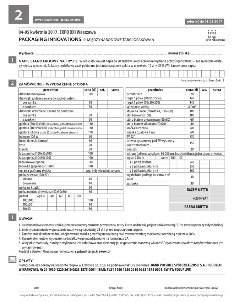 2 WYPOSAŻENIE DODATKOWE odesłać do 03.03.2017 04-05 kwietnia 2017, EXPO XXI Warszawa PACKAGING INNOVATIONS 9. MIĘDZYNARODOWE TARGI OPAKOWAŃ Wystawca ............................................................................................................................................................... numer stoiska ....................................... 1 2 NAPIS STANDARDOWY NA FRYZIE. W cenie stoiska jest napis do 20 znaków (kolor i czcionka wybrana przez Organizatora) – nie są liczone odstępy między wyrazami. Za każdy dodatkowy znak pobierana jest automatycznie opłata w wysokości 10 zł + 23% VAT. Zamawiamy napis: Inne zamówienia – patrz form. 6 pkt. 2 ZAMÓWIENIE – WYPOSAŻENIE STOISKA przedmiot cena (zł) szt. suma drzwi harmonijkowe 110 drzwiczki szklane suwane do gablot i witryn: bez zamka 30 z zamkiem 50 drzwiczki drewniane suwane do podestów: bez zamka 30 z zamkiem 50 gablota (50x50x100) szkło 20 cm, jedna strona otwarta 130 gablota (100x50x100) szkło 20 cm, jedna strona otwarta 130 gablota łukowa szkło 20 cm. jedna strona otwarta 170 halogen 100 W 60 hoker (krzesło barowe) 60 kosz 20 krzesło 30 lada z półką (100x50x100) 100 lada z półką (50x50x100) 100 lada łukowa z półką 110 lodówka (pojemność: 120l) 180 oprawa graficzna stoiska wg. indywidualnej wyceny półka ścienna (100x27) szklana 40 drewniana 40 półka na książki 30 półka narożna drewniana (50x50x66) 60 podest wys.= 40 60 80 100 100x100 100 100x50 90 50x50 80 ! przedmiot cena (zł) szt. suma przedłużacz 20 regał 5 półek (100x50x250) 140 regał 5 półek (50x50x250) 140 sprzątanie stoiska 8 / m2 stojak na ulotki (format A4, 6 miejsc) 100 stół barowy (śr. 50) 100 stół z blatem drewnianym (80x80) 60 stół z blatem szklanym (70x70) 40 szafka kuchenna 60 ścianka działowa 1 mb 60 TV 42” 750 uchwyt systemowy pod TV wystawcy 150 wraz z montażem wieszak 20 witryna (szkło na wysokości 80-200 cm, bez oświetlenia, jedna strona otwarta): wys= 250 cm szer.= 100 50 z 1 półką szklaną 240 z 2 półkami szklanymi 250 z 3 półkami szklanymi 260 wykładzina podłogowa extra 1 m2 30 kolor ................................................... zasłonka 30 RAZEM NETTO +23% VAT RAZEM BRUTTO UWAGA! 1. Niestandardowe elementy stoiska (element obrotowy, struktura przestrzenna, rastry, lustro, nadstawki, projekt stoiska w wersji 3D itp.) według wyceny indywidualnej. 2. Zmiany zamówienia wyposażenia możliwe są najpóźniej 21 dni przed rozpoczęciem targów. 3. Zamówienia składane w dniu obejmowania stoiska przez Wystawcę będą realizowane w miarę możliwości oraz będą droższe o 50%. 4. Rysunki elementów wyposażenia dodatkowego przedstawiono na formularzu 2A. 5. Wszystkie materiały, z których wykonana jest zabudowa oraz elementy jej wyposażenia stanowią własność Organizatora (na okres targów zabudowa jest wynajmowana). Kontakt z Działem Organizacji Technicznej: [email protected] OPŁATY Płatności należy dokonywać na konto Targów w Krakowie Sp. z o.o. na podstawie faktury pro-forma: BANK POLSKIEJ SPÓŁDZIELCZOŚCI S.A. II ODDZIAŁ W KRAKOWIE, Nr 21 1930 1220 2610 0623 1875 0001 (IBAN: PL21 1930 1220 2610 0623 1875 0001, SWIFT: POLUPLPR) data pieczęć firmy podpis osoby upoważnionej do zawierania umów Targi w Krakowie Sp. z o.o., 31-586 Kraków, ul. Galicyjska 9, tel. (+4812) 6519524, (+4812) 6519525, fax (+4812) 6519522, e-mail: [email protected], www.packaginginnovations.pl