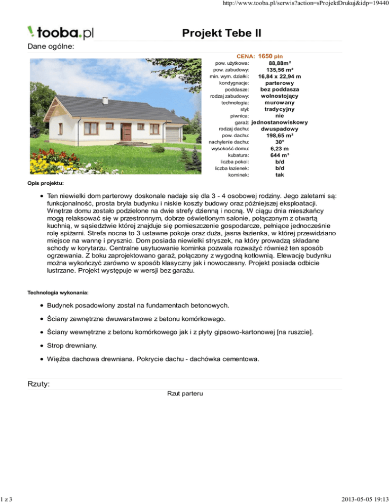 1z3 http://www.tooba.pl/serwis?action=sProjektDrukuj&idp=19440 Projekt Tebe II Dane ogólne: CENA: 1650 pln pow. użytkowa: 88,88m² pow. zabudowy: 135,56 m² min. wym. działki: 16,84 x 22,94 m kondygnacje: parterowy poddasze: bez poddasza rodzaj zabudowy: wolnostojący technologia: murowany styl: tradycyjny piwnica: nie garaż: jednostanowiskowy rodzaj dachu: dwuspadowy pow. dachu: 198,65 m² nachylenie dachu: 30° wysokość domu: 6,23 m kubatura: 644 m³ liczba pokoi: b/d liczba łazienek: b/d kominek: tak Opis projektu: Ten niewielki dom parterowy doskonale nadaje się dla 3 - 4 osobowej rodziny. Jego zaletami są: funkcjonalność, prosta bryła budynku i niskie koszty budowy oraz późniejszej eksploatacji. Wnętrze domu zostało podzielone na dwie strefy dzienną i nocną. W ciągu dnia mieszkańcy mogą relaksować się w przestronnym, dobrze oświetlonym salonie, połączonym z otwartą kuchnią, w sąsiedztwie której znajduje się pomieszczenie gospodarcze, pełniące jednocześnie rolę spiżarni. Strefa nocna to 3 ustawne pokoje oraz duża, jasna łazienka, w której przewidziano miejsce na wannę i prysznic. Dom posiada niewielki stryszek, na który prowadzą składane schody w korytarzu. Centralne usytuowanie kominka pozwala rozważyć również ten sposób ogrzewania. Z boku zaprojektowano garaż, połączony z wygodną kotłownią. Elewację budynku można wykończyć zarówno w sposób klasyczny jak i nowoczesny. Projekt posiada odbicie lustrzane. Projekt występuje w wersji bez garażu. Technologia wykonania: Budynek posadowiony został na fundamentach betonowych. Ściany zewnętrzne dwuwarstwowe z betonu komórkowego. Ściany wewnętrzne z betonu komórkowego jak i z płyty gipsowo-kartonowej [na ruszcie]. Strop drewniany. Więźba dachowa drewniana. Pokrycie dachu - dachówka cementowa. Rzuty: Rzut parteru 2013-05-05 19:13 2z3 http://www.tooba.pl/serwis?action=sProjektDrukuj&idp=19440 Opis pomieszczeń: 1.wiatrołap - 2.38 m² 2.komunikacja - 7.95 m² 3.spiżarnia + pralnia - 3.7 m² 4.salon + kuchnia - 31.92 m² 5.pokój - 9.75 m² 6.pokój - 11.95 m² 7.pokój - 10.38 m² 8.łazienka - 6.04 m² 9.kotłownia - 4.81 m² 10.garaż - 17.75 m² Przekrój Sytuacja Elewacje: Elewacja przednia Elewacja tylna 2013-05-05 19:13 3z3 http://www.tooba.pl/serwis?action=sProjektDrukuj&idp=19440 Elewacja lewa Elewacja prawa Potrzebujesz porady...? Skontaktuj się z nami - jesteśmy do Twojej dyspozycji. tel: (52) 384 49 90 kom: 605 071 505 fax: (52) 342 24 39 kom: 500 049 219 email: [email protected] 2013-05-05 19:13