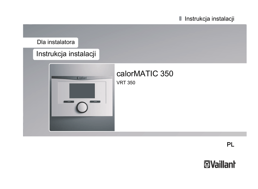 Instrukcja instalacji Dla instalatora Instrukcja instalacji calorMATIC 350 VRT 350 PL Stopka redakcyjna Typ dokumentu: Instrukcja instalacji Produkt: calorMATIC 350 Grupa docelowa: Autoryzowany instalator Język: PL Nr dokumentu_wersja: 0020137739_01 Data utworzenia: 24.05.2012 Wydawca / producent Vaillant GmbH Berghauser Str. 40 D-42859 Remscheid Telefon +49 21 91 18‑0 Telefax +49 21 91 18‑28 10 [email protected] www.vaillant.de © Vaillant GmbH 2012 Przedruk niniejszej instrukcji lub jej części jest dozwolony wyłącznie za pisemną zgodą firmy Vaillant GmbH. Wszystkie nazwy produktów występujące w niniejszej instrukcji są zastrzeżonymi nazwami / znakami towarowymi odpowiednich przedsiębiorstw. Zmiany techniczne zastrzeżone. Spis treści Spis treści 7 Obsługa.............................................................. 14 7.1 Przegląd poziomu instalatora .............................. 15 1 Wskazówki dotyczące dokumentacji.................... 4 8 Funkcje obsługowe i wskazujące....................... 18 1.1 Zastosowane symbole i znaki................................ 4 8.1 Informacja serwisowa .......................................... 18 1.2 Przestrzeganie dokumentów dodatkowych ........... 4 8.2 Konfiguracja systemu - system............................ 18 1.3 Przechowywanie dokumentacji ............................. 4 8.3 Konfiguracja systemu - urządzenie grzewcze ..... 19 1.4 Zakres stosowalności instrukcji ............................. 4 8.4 Konfiguracja systemu - obieg grzewczy .............. 20 2 Bezpieczeństwo ................................................... 5 8.5 Konfiguracja systemu - ciepła woda (obieg)........ 21 2.1 Wymagane kwalifikacje pracowników ................... 5 8.6 Zmiana kodu dla poziomu instalatora.................. 22 2.2 Ogólne wskazówki bezpieczeństwa ...................... 5 9 Usuwanie usterek .............................................. 23 2.3 Znak CE................................................................. 6 9.1 Komunikaty usterek ............................................. 23 2.4 Użytkowanie zgodne z przeznaczeniem ............... 7 9.2 Usterki.................................................................. 24 3 Widok urządzenia ................................................ 8 10 Zakończenie eksploatacji................................... 25 3.1 Tabliczka znamionowa .......................................... 8 10.1 Wymiana regulatora............................................. 25 3.2 Zakres dostawy...................................................... 8 10.2 Recykling i usuwanie urządzeń ........................... 25 4 Montaż ................................................................. 8 11 Serwis techniczny .............................................. 26 4.1 Montaż regulatora w pomieszczeniu mieszkalnym .......................................................... 8 5 Instalacja elektryczna........................................... 9 5.1 Podłączanie regulatora do urządzenia grzewczego za pomocą “zacisku 3-4-5” .............. 10 5.2 Podłączanie regulatora do urządzenia grzewczego za pomocą “zacisku 24=RT”............ 11 6 Uruchamianie ..................................................... 12 6.1 Przegląd ustawień asystenta instalacji ................ 13 0020137739_01 calorMATIC 350 Instrukcja instalacji 3 1 Wskazówki dotyczące dokumentacji 1 Wskazówki dotyczące dokumentacji 1.1 Zastosowane symbole i znaki 1.3 Przekazanie dokumentacji ▶ Symbole Mogą występować następujące symbole: Przechowywanie dokumentacji Instrukcje i wszystkie dokumenty obowiązujące dodatkowo oraz ew. potrzebne materiały pomocnicze należy przekazać użytkownikowi instalacji. Dostępność dokumentacji Symbol ostrzeżenia Użytkownik instalacji odpowiada za przechowywanie dokumentacji w takim miejscu, aby w razie potrzeby była ona dostępna. Symbol wskazówki Symbol czynności do wykonania. Symbol rezultatu czynności. 1.2 ▶ Przestrzeganie dokumentów dodatkowych 1.4 Zakres stosowalności instrukcji Niniejsza instrukcja dotyczy wyłącznie: Nr katalogowy Polska 0020124476 Podczas instalacji koniecznie przestrzegać wszystkich instrukcji instalacji części i podzespołów układu. Te instrukcje instalacji są dołączone do odpowiednich części układu oraz podzespołów uzupełniających. ▶ 4 Przestrzegać ponadto wszystkich instrukcji obsługi dołączonych do podzespołów układu. Instrukcja instalacji calorMATIC 350 0020137739_01 Bezpieczeństwo 2 2 2.1 Bezpieczeństwo Wymagane kwalifikacje pracowników 2.2 Ogólne wskazówki bezpieczeństwa 2.2.1 Instalacja tylko przez instalatora Niniejsza instrukcja jest skierowana do osób o następujących kwalifikacjach. Urządzenie musi zostać zainstalowane przez autoryzowanego instalatora, odpowiedzialnego za przestrzeganie obowiązujących przepisów, zasad i dyrektyw. 2.1.1 ▶ ▶ Autoryzowany instalator Instalacja, montaż, demontaż, uruchomienie, konserwacja, naprawa i wycofywanie z eksploatacji produktów i wyposażenia Vaillant to czynności zastrzeżone dla autoryzowanych instalatorów. Wskazówka Instalator ze względu na swoje wykształcenie ma kwalifikacje jedynie w określonej branży. Wolno mu wykonywać prace przy urządzeniach jedynie wówczas, gdy dysponuje on właściwymi kwalifikacjami. Instalatorzy podczas pracy muszą przestrzegać wszystkich właściwych wytycznych, norm, ustaw i pozostałych przepisów. 0020137739_01 calorMATIC 350 Instrukcja instalacji ▶ Należy dokładnie przeczytać niniejszą instrukcję instalacji. Wykonywać jedynie czynności opisane w tej instrukcji instalacji. Przy montażu należy przestrzegać poniższych wskazówek dotyczących bezpieczeństwa i przepisów. 2.2.2 Zagrożenie życia przez przyłącza pod napięciem Podczas prac przy skrzynce elektronicznej urządzenia grzewczego istnieje zagrożenie życia wskutek porażenia prądem elektrycznym. Zaciski przyłącza sieciowego są pod napi