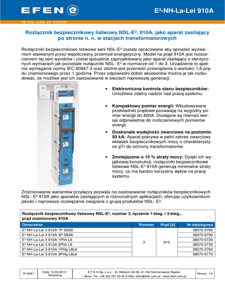 E³-NH-La-Lei 910A IN THE LINE OF POWER Custom solutions NT 1 Rozłącznik bezpiecznikowy listwowy NSL-E³, 910A, jako aparat zasilający po stronie n. n. w stacjach transformatorowych Rozłączniki bezpiecznikowe listwowe serii NSL-E³ zostały opracowane aby sprostać wyzwaniom stawianym przez współczesny przemysł energetyczny. Model na prąd 910A jest rozszerzeniem tej serii wyrobów i został specjalnie zaprojektowany jako aparat zasilający o identycznych wymiarach jak pozostałe rozłączniki NSL- E³ w rozmiarze od 1 do 3. Urządzenie to spełnia wymagania normy IEC 60947-3 oraz zdolne jest przenieść przeciążenia o wartości 1,6 prądu znamionowego przez 1 godzinę. Przez odpowiedni dobór akcesoriów można je tak rozbudować, że możliwe jest ich zastosowanie w sieciach najnowszej generacji. • Elektroniczna kontrola stanu bezpieczników: Umożliwia zdalny nadzór nad pracą systemu. • Kompaktowy pomiar energii: Wbudowywane przekładniki prądowe pozwalają na wygodny pomiar energii do 800A. Dostępne są również wersje odpowiednie do rozliczeniowych pomiarów energii. • Doskonała wydajność zwarciowa na poziomie 50 kA: Aparat pokrywa w pełni zakres zwarciowy wkładek bezpiecznikowych mocy o charakterystyce gTr do ochrony transformatorów. • Zmniejszone o 15 % straty mocy: Dzięki ich wyjątkowej konstrukcji, rozłączniki bezpiecznikowe listwowe NSL-E³ 910A generują minimalne straty mocy, co ma bardzo korzystny wpływ na pracę systemu. Zróżnicowanie wariantów przyłączy pozwala na zastosowanie rozłączników bezpiecznikowych NSL- E³ 910A jako aparatów zasilających w różnorodnych aplikacjach, oferując użytkownikom jakość i najnowsze rozwiązania związane z grupą produktów NSL- E³. Rozłącznik bezpiecznikowy listwowy NSL-E³, rozmiar 3, łączenie 1-bieg. i 3-bieg., prąd znamionowy 910A Oznaczenie E³ NH-La-Lei 3 910A 1P S6S6 E³ NH-La-Lei 3 910A 3P S6S6 E³ NH-La-Lei 3 910A 1Phh L6 E³ NH-La-Lei 3 910A 3Phh L6 E³ NH-La-Lei 3 910A 1PHg L8L6 E³ NH-La-Lei 3 910A 3PHg L8L6 PI-008/1 Data: 15.04.2013 / Marketing Rozmiar 3 Prąd [A] 910 E F E N Sp. z o.o. - Al. Młodych 26-28, 41-106 Siemianowice Śląskie / Biuro: Tel. +48 (32) 201 09 42 E-Mail: [email protected] - www.efen.com.pl Nr katalogowy 38070-0780 38070-0790 38070-0720 38070-0730 38070-0760 38070-0770 Strona: 1/4 E³-NH-La-Lei 910A IN THE LINE OF POWER Custom solutions NT 1 Rysunki wymiarowe Przyłącze kablowe typu S6S6 Przyłącze szynowe tylne typu Phh L6 Przyłącze szynowe rozszerzone Hg L8L6 PI-008/1 Data: 15.04.2013 / Marketing E F E N Sp. z o.o. - Al. Młodych 26-28, 41-106 Siemianowice Śląskie / Biuro: Tel. +48 (32) 201 09 42 E-Mail: [email protected] - www.efen.com.pl Strona: 2/4 E³-NH-La-Lei 910A IN THE LINE OF POWER Custom solutions NT 1 Dane techniczne Dane techniczne rozłączników bezpiecznikowych n. n. (zgodnie z IEC/EN 60 947-3, VDE 0660 część 107) Dotyczy wkładek bezpiecznikowych mocy zgodnie z DIN 73620/1 Rozmiar 3 Rozmiar 3 Rozmiar 3 Jedn. S6S6 Hg L8L6 Phh L6 Ie A 910 910 910 Prąd cieplny umowny łącznika w otwartej przestrzeni Ith A 910 910 910 Napięcie znamionowe łączeniowe Ue V AC 400 AC 400 AC 400 Napięcie znamionowe izolacji Ui V 690 690 690 Uimp kV 12 12 12 kA 50 50 50 AC-22B AC-22B AC-22B Prąd znamionowy łączeniowy 400 V Napięcie znamionowe udarowe wytrzymywane Prąd znamionowy zwarciowy umowny (przy zabezpieczeniu wkładkami bezpiecznikowymi mocy) 400 V Kategoria użytkowania VDE 0660 T107/EN/IEC 60947-3 400 V Trwałość mechaniczna (cykle łączeniowe) Cykle 500 500 500 Trwałość elektryczna (cykle łączeniowe) Cykle 100 100 100 Dopuszczalna temperatura otaczającego powietrza °C -25 do +55 -25 do +55 -25 do +55 Stopień ochrony wg DIN/EN 60529/VDE 0470 T1 IP 20 20 20 Maksymalna strata mocy wkładek bezpiecznikowych Pv W 70 70 70 Całkowita moc strat przy Ith (bez wkładek bezpiecznikowych) Pv W 158 142 194 Stopień zanieczyszczenia - - 3 3 3 Kategoria przepięć - - IV IV IV Hz 50-60 50-60 50-60 kg 9,5 5,0 9,8 Częstotliwość znamionowa Masa bez wkładek bezpiecznikowych PI-008/1 Data: 15.04.2013 / Marketing - E F E N Sp. z o.o. - Al. Młodych 26-28, 41-106 Siemianowice Śląskie / Biuro: Tel. +48 (32) 201 09 42 E-Mail: [email protected] - www.efen.com.pl Strona: 3/4 E³-NH-La-Lei 910A IN THE LINE OF POWER Custom solutions NT 1 Kryteria doboru Rozłączniki bezpiecznikowe wyposażone są we wkładki bezpiecznikowe mocy zgodnie z DIN 43620. Jeżeli stosowane są jako aparaty zasilające w stacjach transformatorowych z reguły wyposażone są we wkładki bezpiecznikowe mocy o charakterystyce gTr zgodnie z VDE 0636/2011. Norma ta jest dostosowana do charakterystyki obciążenia transformatorów oraz do charakterystyk wkładek bezpiecznikowych średniego napięcia HH. Oznacza to, że aparat łączeniowy musi spełniać wysokie wymagania w zakresie odporności termicznej wynikającej z ograniczeń powstałych na skutek kompaktowej budowy. Aby zapewnić właściwą ich pracę, zalecamy aby przy doborze aparatów NSL-E³-910A firmy EFEN posługiwać się poniższą tabelą. Żywotność wkładki bezpiecznikowej n. n., rozmiar 3, 630 kVA Prąd znamionowy Współczynnik przeciążenia Prąd odniesienia Dopuszczalny okres pracy 630kVA (910A) 1 1.1 1.2 1.3 1.4 1.5 1.6 910 A 1000A 1090A 1180A 1270A 1360A 1450A Działanie ciągłe 36 godzin 18 godzin 4 godziny 2 godziny 1.5 godziny 1 godzina PI-008/1 Data: 15.04.2013 / Marketing E F E N Sp. z o.o. - Al. Młodych 26-28, 41-106 Siemianowice Śląskie / Biuro: Tel. +48 (32) 201 09 42 E-Mail: [email protected] - www.efen.com.pl Strona: 4/4