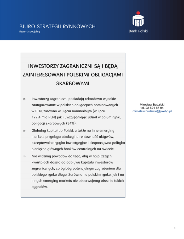 BIURO STRATEGII RYNKOWYCH Raport specjalny INWESTORZY ZAGRANICZNI SĄ I BĘDĄ ZAINTERESOWANI POLSKIMI OBLIGACJAMI SKARBOWYMI • Inwestorzy zagraniczni posiadają rekordowo wysokie zaangażowanie w polskich obligacjach nominowanych w PLN, zarówno w ujęciu nominalnym (w lipcu Mirosław Budzicki tel. 22 521 87 94 [email protected] 177,4 mld PLN) jak i uwzględniając udział w całym rynku obligacji skarbowych (34%); • Globalny kapitał do Polski, a także na inne emerging markets przyciąga atrakcyjna rentowność aktywów, akceptowalne ryzyko inwestycyjne i ekspansywna polityka pieniężna głównych banków centralnych na świecie; • Nie widzimy powodów do tego, aby w najbliższych kwartałach doszło do odpływu kapitału inwestorów zagranicznych, co byłoby potencjalnym zagrożeniem dla polskiego rynku długu. Zarówno na polskim rynku, jak i na innych emerging markets nie obserwujemy obecnie takich sygnałów. 1 BIURO STRATEGII RYNKOWYCH Raport specjalny W dużej mierze dzięki inwestorom zagranicznym MF sprzedaje obligacje po niższym koszcie Na rynku obligacji skarbowych denominowanych w PLN coraz większy udział zdobywają inwestorzy zagraniczni. Przykładowo w lipcu 2012 r. ich zaangażowanie w polskie obligacje skarbowe wyniosło 177,4 mld PLN, co stanowiło 34,2% wszystkich „żyjących” emisji. Dla porównania na koniec 2011 r. udział ten wynosił 30,4%, natomiast w 2010 r. - 26,1%. Oznacza to, że Polska coraz bardziej uzależnia się od finansowania zagranicznego, tym bardziej, że jednocześnie rośnie nominalnie wartość długu publicznego nominowanego w obcych walutach. W latach 2010-2012 w prawie 96% wzrost wartości „żyjących” emisji obligacji skarbowych został sfinansowany na rynku krajowym przez inwestorów zagranicznych. Mimo, że polskie banki posiadają wysoką bieżącą nadpłynność szacowaną na blisko 100 mld PLN (Wykres 1), to jednak nie zwiększały w ostatnich latach wyraźnie swojego zaangażowania (wzrosty widoczne były jedynie przejściowo), preferując bony pieniężne NBP. Warto jednak pamiętać, że w sytuacji silniejszej przeceny będzie to źródło potencjalnego popytu. W latach 2010-2012 w prawie 96% wzrost wartości „żyjących” emisji obligacji skarbowych został sfinansowany na rynku krajowym przez inwestorów zagranicznych. MF nie publikuje informacji nt. struktury nabywców w ramach kategorii inwestorów zagranicznych dla obligacji nominowanych w PLN. Stąd trudno jest ustalić, jaką część zaangażowania stanowi kapitał długoterminowy, a jaką inwestorzy spekulacyjni. Tysiące Wykres 1. Nadpłynność sektora bankowego mierzona wielkością emisji bonów pieniężnych NBP – „żywe” emisje (mld PLN) Wykres 2. Udział inwestorów na polskim rynku OS rośnie podobnie jak na innych rynkach emerging markets (%) 35 140 120 25 100 80 15 60 5 40 20 0 gru-08 mar-04 -5 wrz-09 cze-10 mar-11 gru-11 wrz-12 Źródło: NBP, PKO BP mar-06 mar-08 Indonezja Tajlandia mar-10 Korea Polska mar-12 Malezja Źródło: PKO BP, na podstawie danych MF, Tabela 1 Zmiany zaangażowania inwestorów na rynku obligacji skarbowych w PLN - struktura podmiotowa (mld PLN, wg danych do VII 2012 r.) Data Banki Inw estorzy zagraniczni Zakłady ubezpieczeniow e Fundusze emerytalne Fundusze inw estycyjne Osoby fizyczne Podm ioty niefinansow e Inne podm ioty Razem 2008 2009 2010 2011 2012 21,2 14,9 -1,6 -7,1 -7,9 -19,2 23,3 46,2 27,7 24,9 -0,1 -9,9 5,7 -3,9 0,2 17,7 10,4 5,9 5,2 -1,6 -13,5 2,8 3,4 1,4 1,2 1,9 0,2 -2,4 -1,3 -0,1 1,0 0,2 0,0 -0,1 -2,0 2,6 4,1 6,9 1,5 1,2 11,5 46,0 64,2 23,4 15,9 Źródło: Ministerstwo Finansów, PKO BP 2 BIURO STRATEGII RYNKOWYCH Raport specjalny Polskiemu długowi sprzyja wyższa rentowność i niższe ryzyko W kontekście przyszłych zmian portfeli inwestorów zagranicznych, a w efekcie potencjalnych zmian notowań na polskim rynku długu, kluczowe pozostaje pytanie, jakie czynniki determinowały tak silny wzrost zainteresowania polskim długiem w ostatnich latach? Wskazać można kilka najistotniejszych: - globalny napływ kapitału na rynek obligacji skarbowych EM; Wykres 3. Globalny napływ netto do funduszy dedykowanych emerging markets (mld USD, skumulowane od I 2011 r.) Źródło: EPFR Global, MFW Wykres 4. Zagraniczne bankowe i portfelowe przepływy do EM (% PKB w danym roku) Źródło: Haver Analytics, MFW - relatywnie niskie ryzyko inwestycyjne – od 2009 r. Polsce bliżej do Niemiec niż Włoch czy Hiszpanii. Wzrost premii za ryzyko kredytowe w przypadku Polski determinowany jest zmianami nastrojów w Europie. Dodatkowo na przykładzie Wielkiej Brytanii widać, że niektóre kraje mogą zyskiwać pozostając poza strefą euro, nie będąc obciążonym potencjalnymi zobowiązaniami wynikającymi z zaangazowania w programy wsparcia dla Europy (w podobnej sytuacji są m.in. Dania, Szwecja, czy Norwegia). Wykres 5. Notowania polskich CDS-ów można porównywać do kontraktów wiarygodnych państw strefy euro (pb, 5Y) Wykres 6. CDS 5Y Polski i Wielkiej Brytanii w relacji do CDS Niemiec (krotność, o ile kwotowania są wyższe) 12 600 10 450 8 300 6 4 150 2 0 lip-08 sty-09 lip-09 sty-10 lip-10 sty-11 lip-11 sty-12 lip-12 Polska Włochy Źródło: bloomberg Niemcy WB Czechy Austria Hiszpania 0 lip-08 maj-09 mar-10 PLN vs. GER sty-11 lis-11 UK vs. GER wrz-12 Źródło: PKO BP, na podstawie danych MF 3 BIURO STRATEGII RYNKOWYCH Raport specjalny - podwyższone ryzyko będące w większym stopniu wynikiem materializacji negatywnych scenariuszy w Europie, a w mniejszym ryzykiem specyficznym Polski. Od 2002 r. widać korelację pomiędzy wzrostem kwotowań ASW 10Y, a wzrostem zobowiązań publicznych. Wysoki wzrost polskiego długu publicznego od 2008 r. wynika w dużej mierze z deprecjacji złotego (choć równie ważnym czynnikiem był wzrost obciążeń z tytułu składek przekazywanych do OFE). Z drugiej strony wykres 8 pokazuje, jak destabilizacja systemu finansowego w Europie negatywnie wpływa na polskie