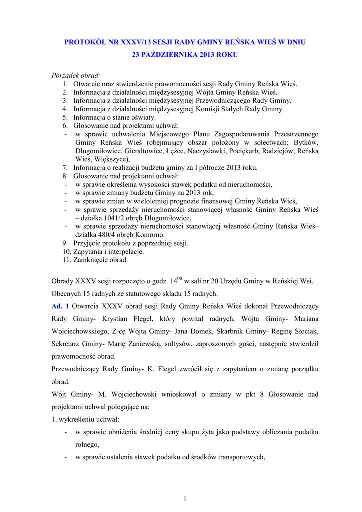 PROTOKÓŁ NR XXXV/13 SESJI RADY GMINY REŃSKA WIEŚ W DNIU 23 PAŹDZIERNIKA 2013 ROKU Porządek obrad: 1. Otwarcie oraz stwierdzenie prawomocności sesji Rady Gminy Reńska Wieś. 2. Informacja z działalności międzysesyjnej Wójta Gminy Reńska Wieś. 3. Informacja z działalności międzysesyjnej Przewodniczącego Rady Gminy. 4. Informacja z działalności międzysesyjnej Komisji Stałych Rady Gminy. 5. Informacja o stanie oświaty. 6. Głosowanie nad projektami uchwał: - w sprawie uchwalenia Miejscowego Planu Zagospodarowania Przestrzennego Gminy Reńska Wieś (obejmujący obszar położony w sołectwach: Bytków, Długomiłowice, Gierałtowice, Łężce, Naczysławki, Pociękarb, Radziejów, Reńska Wieś, Większyce), 7. Informacja o realizacji budżetu gminy za I półrocze 2013 roku. 8. Głosowanie nad projektami uchwał: - w sprawie określenia wysokości stawek podatku od nieruchomości, - w sprawie zmiany budżetu Gminy na 2013 rok, - w sprawie zmian w wieloletniej prognozie finansowej Gminy Reńska Wieś, - w sprawie sprzedaży nieruchomości stanowiącej własność Gminy Reńska Wieś – działka 1041/2 obręb Długomiłowice, - w sprawie sprzedaży nieruchomości stanowiącej własność Gminy Reńska Wieś– działka 480/4 obręb Komorno. 9. Przyjęcie protokołu z poprzedniej sesji. 10. Zapytania i interpelacje. 11. Zamknięcie obrad. Obrady XXXV sesji rozpoczęto o godz. 1400 w sali nr 20 Urzędu Gminy w Reńskiej Wsi. Obecnych 15 radnych ze statutowego składu 15 radnych. Ad. 1 Otwarcia XXXV obrad sesji Rady Gminy Reńska Wieś dokonał Przewodniczący Rady Gminy- Krystian Flegel, który powitał radnych, Wójta Gminy- Mariana Wojciechowskiego, Z-cę Wójta Gminy- Jana Domek, Skarbnik Gminy- Reginę Słociak, Sekretarz Gminy- Marię Zaniewską, sołtysów, zaproszonych gości, następnie stwierdził prawomocność obrad. Przewodniczący Rady Gminy- K. Flegel zwrócił się z zapytaniem o zmianę porządku obrad. Wójt Gminy- M. Wojciechowski wnioskował o zmiany w pkt 8 Głosowanie nad projektami uchwał polegające na: 1. wykreśleniu uchwał: - w sprawie obniżenia średniej ceny skupu żyta jako podstawy obliczania podatku rolnego, - w sprawie ustalenia stawek podatku od środków transportowych, 1 2. wprowadzeniu uchwał: - w sprawie której intencją jest udzielenie pomocy finansowej jednostce samorządu terytorialnego, Wójt- M. Wojciechowski: Powiat będzie składał wniosek o dofinansowanie remontu drogi Mechnica- Walce z Narodowego Programy Przebudowy Dróg Lokalnych. Zwrócił się do gminy o współfinansowanie remontu na odcinku Mechnica – Kamionka do granicy z Gminą w wysokości 10% kwoty po przetargu. Wstępnie mówiłem o tej kwocie na wspólnym posiedzeniu komisji, wniosek został złożony przez Powiat na 562.000 zł w związku z tym 10% to nie będzie 80.000 zł tak jak szacowałem, tylko to będzie maksymalnie 56.000 zł, a być może po przetargu to będzie jeszcze mniej. W uchwale napisaliśmy 60.000 zł, ale to jest orientacyjna kwota. - w sprawie sprzedaży nieruchomości stanowiącej własność Gminy Reńska Wieś– działka 480/4 obręb Komorno. Przewodniczący Rady Gminy- K. Flegel zarządził głosowanie nad zmianą porządku obrad. Do głosowania przystąpiło 15 obecnych radnych. W głosowaniu radni opowiedzieli się za zmianą porządku obrad, 14 radnych głosowało „za”, 1 radny- B. Dembończyk głosował przeciw. Przewodniczący Rady Gminy- K. Flegel przeszedł do realizacji punktu 2 porządku obrad w związku z czym przekazał głos Wójtowi Gminy- Marianowi Wojciechowskiemu. Ad. 2 Wójt- M. Wojciechowski przedstawił Sprawozdanie z pracy Wójta Gminy Reńska Wieś za okres od 29 sierpnia do 23 października 2013 r. stanowiące załącznik do protokołu. Ponadto Wójt- M. Wojciechowski poinformował o tym, iż: Zgodnie z nową ustawą firmy, które odbierają odpady komunalne, właściwie to gmina ma obowiązek, ale ponieważ przystąpiliśmy do Związku Czysty Region ten obowiązek został scedowany na Czysty Region, a Czysty Region zawarł go w specyfikacji przetargowej, mają być utworzone PSZOK-i. Punkt Selektywnej Zbiórki Odpadów Komunalnych w skrócie PSZOK. Takie punkty mają być na ternie gminy, przynajmniej jeden. Ponieważ przetarg został ogłoszony tylko na jeden rok w związku z tym te firmy nie tworzą tych punktów z tego względu, że gdyby je stworzyć w ciągu jednego roku to wtedy za te odpady nie płacilibyśmy po 12,50 zł tylko około o połowę więcej. Utworzenie takiego punktu kalkulowane jest na ok. 300.000 zł. Te 300.000 zł wkalkulowane w cenę odpadów spowodowałoby, że ta cena wzrosłaby mocno, dlatego jest takie rozwiązanie przez najbliższy rok, że będą to takie przewoźne PSZOK-i. One będą w czterech miejscach na 2 terenie Gminy, w Długomiłowicach, Reńskiej Wsi, Większycach i prawdopodobnie w Komornie, przez jeden dzień. Tam będzie można te odpady oddawać, a prawdopodobnie w następnym przetargu, który będzie ogłoszony na 3 lata taki PSZOK będzie budowany. Ad. 3 Sprawozdanie z pracy Przewodniczącego Rady Gminy- K. Flegel w okresie od 29 sierpnia do 23 października 2013 r. zawiera następujące punkty: - 31.VIII- Otwarcie turnieju drużyn młodzieżowych pucharu DFK w piłce nożnej na ORLIKU. - 1.IX- Dożynki Powiatowo– Gminne w Mechnicy. - 8.IX- Festyn w szkole w Reńskiej Wsi. - 9.IX- Spotkanie klubu seniora- radni: Dembończyk, Krybus, Ludwig, Majnusz, Wójt przed spotkaniem z Marszałkiem. - 10.IX- Posiedzenie wspólne Komisji Stałych rady Gminy Reńska Wieś, spotkanie z Marszałkiem dot. działki na poligonie. - 15.IX- Pałac Większyce, prelekcja Zamki Gminy Reńska Wieś oraz konkurs fotograficzny dot. kapliczek w Gminie Reńska Wieś. - 17.IX- Posiedzenie Komisji Rewizyjnej. - 5.X- Spotkanie z parami obchodzącymi jubileusz 50 lat po ślubie. - 15.X- Dzień Edukacji Narodowej w GOK Reńska Wieś, spotkanie z emerytowanymi nauczycielami i dyrektorami sz