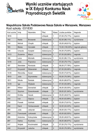Wyniki uczniów startujących w IX Edycji Konkursu Nauk Przyrodniczych Świetlik Niepubliczna Szkoła Podstawowa Nasza Szkoła w Warszawie, Warszawa Kod szkoły: 031830 Kod ucznia Imię Nazwisko 1B16 Płeć Klasa Liczba punktów Nagroda chłopak 1 57,00 (79,17%) dyplom 1A2 Nadia Browarek dziewczyna 1 62,00 (86,11%) wyróżnienie 1A4 Michał Chopik chłopak 1 35,00 (48,61%) dyplom 1B3 Błażej Gorzałek chłopak 1 72,00 (100,00%) nagroda główna 1A6 Urszula Guśpiel dziewczyna 1 54,00 (75,00%) dyplom 1A13 Zuzanna Mazur dziewczyna 1 67,00 (93,06%) nagroda 1B6 Lena Michalik dziewczyna 1 62,00 (86,11%) wyróżnienie 1A16 Julia Popowicz dziewczyna 1 57,00 (79,17%) dyplom 1B7 Stanisław Ronduda chłopak 1 56,00 (77,78%) dyplom 1A17 Krzysztof Sibierański chłopak 1 67,00 (93,06%) nagroda 1A18 Weronika Szost dziewczyna 1 53,00 (73,61%) dyplom 1B10 Julia Szymańska dziewczyna 1 55,00 (76,39%) dyplom 1B11 Nikola Świstak dziewczyna 1 48,00 (66,67%) dyplom 1A19 Iga Wojtasik dziewczyna 1 67,00 (93,06%) nagroda 2B1 Wiktor Domański chłopak 2 36,00 (50,00%) dyplom 2A1 Szymon Dzwonkowski chłopak 2 59,00 (81,94%) wyróżnienie 2A2 Emilka Gacek dziewczyna 2 35,00 (48,61%) dyplom 2A4 Ivar Gąszcz chłopak 2 46,00 (63,89%) dyplom 2A5 Franek Goliński chłopak 2 53,00 (73,61%) dyplom 2A6 Karol Horbaczewski chłopak 2 32,00 (44,44%) dyplom 2B3 Julia Jedynak dziewczyna 2 39,00 (54,17%) dyplom 2B4 Franciszek Jurkowski chłopak 2 45,00 (62,50%) dyplom 2B6 Antonina Kolczyńska dziewczyna 2 35,00 (48,61%) dyplom 2B7 Kalina Kozińska dziewczyna 2 48,00 (66,67%) dyplom 2A7 Wojtek Krochmalski chłopak 2 57,00 (79,17%) wyróżnienie 2A8 Krzysztof Latocha chłopak 2 55,00 (76,39%) wyróżnienie Kod ucznia Imię Nazwisko Płeć Klasa Liczba punktów Nagroda 2B8 Władysław Lizis chłopak 2 59,00 (81,94%) wyróżnienie 2A9 Pola Łazęcka dziewczyna 2 50,00 (69,44%) dyplom 2B10 Jan Michniewski chłopak 2 30,00 (41,67%) dyplom 2A10 Zofia Mielniczek dziewczyna 2 56,00 (77,78%) wyróżnienie 2A11 Karol Molenda chłopak 2 60,00 (83,33%) wyróżnienie 2A12 Maciej Nurkiewicz chłopak 2 60,00 (83,33%) wyróżnienie 2B13 Joanna Rutkowska dziewczyna 2 26,00 (36,11%) dyplom 2A13 Robert Rzepka chłopak 2 48,00 (66,67%) dyplom 2B14 Tymoteusz Sak chłopak 2 27,00 (37,50%) dyplom 2A14 Oliwia Siebierańska dziewczyna 2 39,00 (54,17%) dyplom 2A15 Zofia Sieńczyk dziewczyna 2 50,00 (69,44%) dyplom 2B16 Nadia Świstak dziewczyna 2 54,00 (75,00%) dyplom 2B17 Julianna Włodarczyk dziewczyna 2 30,00 (41,67%) dyplom 2A17 Kazik Ziółkowski chłopak 2 50,00 (69,44%) dyplom 3A5 Piotr Kalbarczyk chłopak 3 84,00 (65,63%) dyplom 3A6 Szymon Kalinowski chłopak 3 95,67 (74,74%) dyplom 3A7 Tomek Łuczyński chłopak 3 80,00 (62,50%) dyplom 3A10 Maja Muchowicz dziewczyna 3 95,33 (74,48%) dyplom 3A12 Emila Socha dziewczyna 3 70,67 (55,21%) dyplom 3A13 Dawid Stężewicz chłopak 3 78,67 (61,46%) dyplom 3A14 Martyna Suder dziewczyna 3 78,67 (61,46%) dyplom 3A16 Magda Wieczorkowska dziewczyna 3 93,33 (72,92%) dyplom 3A17 Zosia Żurawska dziewczyna 3 61,00 (47,66%) dyplom 4A9 dziewczyna 4 88,00 (68,75%) dyplom 4A10 chłopak 4 32,33 (25,26%) dyplom 4A11 chłopak 4 53,33 (41,67%) dyplom 5A8 chłopak 5 86,00 (53,75%) dyplom 5B15 chłopak 5 97,67 (61,04%) dyplom 5B3 chłopak 5 99,00 (61,88%) dyplom 5B7 chłopak 5 51,00 (31,88%) dyplom 5B6 dziewczyna 5 65,33 (40,83%) dyplom 5A1 Ziemowit Bielski chłopak 5 90,67 (56,67%) dyplom 5A3 Alan Fijał chłopak 5 73,33 (45,83%) dyplom Kod ucznia Imię Nazwisko Płeć Klasa Liczba punktów Nagroda 5A5 Melania Kańka dziewczyna 5 112,33 (70,21%) dyplom 5A7 Anna Latocha dziewczyna 5 112,00 (70,00%) dyplom 5A9 Zuzanna Łodyga dziewczyna 5 92,33 (57,71%) dyplom 5A10 Dorota Łuczyńska dziewczyna 5 96,00 (60,00%) dyplom 5A14 Seweryn Sosnowski chłopak 5 66,67 (41,67%) dyplom 6A9 chłopak 6 74,67 (46,67%) dyplom 6A13 dziewczyna 6 128,00 (80,00%) wyróżnienie