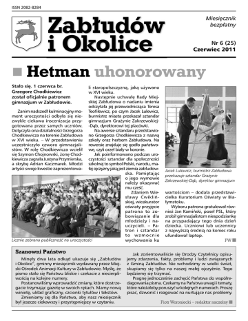 ISSN 2082-8284 Zabłudów i Okolice Miesięcznik bezpłatny Nr 6 (25) Czerwiec 2011 Hetman uhonorowany Stało się. 1 czerwca br. Grzegorz Chodkiewicz został oficjalnie patronem gimnazjum wZabłudowie. li staropolszczyzną, jaką używano wXVI wieku. Następnie uchwałę Rady Miejskiej Zabłudowa onadaniu imienia odczytała jej przewodnicząca Teresa Zanim nadszedł kulminacyjny mo- Teofilewicz, po czym Jacek Lulewicz, ment uroczystości odbyła się nie- burmistrz miasta przekazał sztandar zwykle ciekawa inscenizacja przy- gimnazjum Grażynie Zakrzewskiejgotowana przez samych uczniów. -Dąb, dyrektorowi tej placówki. Dotyczyła ona działalności Grzegorza Na awersie sztandaru przedstawioChodkiewicza na terenie Zabłudowa no Grzegorza Chodkiewicza znazwą wXVI wieku. – Wprzedstawieniu szkoły oraz herbem Zabłudowa. Na uczestniczyło czworo gimnazjali- rewersie znajduje się godło państwostów. Wrolę Chodkiewicza wcielił we, czyli orzeł biały wkoronie. się Szymon Chojnowski, żonę ChodJak poinformowano podczas urokiewicza zagrała Justyna Przymierska, czystości sztandar dla społeczności askrybę Adrian Kaczmarek. Młodzi szkolnej to symbol Polski, narodu, maartyści swoje kwestie zaprezentowa- łej ojczyzny jaką jest ziemia zabłudowska. Pamiętając ojego wymowie należy okazywać mu cześć. Zdaniem Wiesławy Ćwiklińskiej, wicekurator oświaty przyjęcie patrona to zobowiązanie dla młodzieży i nauczycieli. – Patron i sztandar to wzmocnie Licznie zebrana publiczność na uroczystości wychowania ku Szanowni Państwo Minęły dwa lata odkąd ukazuje się „Zabłudów iOkolice”, gminny miesięcznik wydawany przez Miejski Ośrodek Animacji Kultury wZabłudowie. Myślę, że pismo stało się Państwu bliskie iczekacie zniecierpliwością na kolejne numery. Postanowiliśmy wprowadzić zmiany, które dostrzegacie trzymając gazetę wswoich rękach. Mamy nową winietę, układ graficzny, czcionki tytułów itekstów. Zmieniamy się dla Państwa, aby nasz miesięcznik był jeszcze ciekawszy iprzystępniejszy wczytaniu. Jacek Lulewicz, burmistrz Zabłudowa przekazuje sztandar Grażynie Zakrzewskiej-Dąb, dyrektor gimnazjum wartościom – dodała przedstawicielka Kuratorium Oświaty w Białymstoku. Wyboru patrona gratulował również Jan Kamiński, poseł PSL, który zrobił gimnazjalistom niespodziankę na przypadający tego dnia dzień dziecka. Uczniowi lub uczennicy znajwyższą średnią na koniec roku ufundował laptop. PW Jak zorientowaliście się Drodzy Czytelnicy opisujemy zdarzenia, fakty, problemy iludzi związanych zGminą Zabłudów. Nie wchodzimy wwielki świat, skupiamy się tylko na naszej małej ojczyźnie. Tego będziemy się trzymać. Pragnę jednocześnie zachęcić Państwa do współredagowania pisma. Czekamy na Państwa uwagi itematy, które należałoby poruszyć wkolejnych numerach. Proszę pisać, dzwonić ireagować na nurtujące nas problemy. Piotr Woroniecki – redaktor naczelny 2 Zabłudów i Okolice Radni nie próżnują Współpraca zPowiatem Białostockim iZarządem Dróg Wojewódzkich wBiałymstoku zdominowała obrady VII sesji Rady Miejskiej wZabłudowie, które odbyły się 30 maja br. Uchwały podjęte wzakresie upoważnienia Burmistrza do podpisania odpowiednich porozumień zaowocują takimi działaniami jak: – budowa chodnika wzdłuż ul. Mickiewicza wZabłudowie (odcinek od mostu wkierunku Biblioteki), – wzmocnienie nawierzchni odcinka drogi powiatowej poprzez wykonanie warstwy ścieralnej zbetonu asfaltowego na odcinku Folwarki Tylwickie wkierunku Folwark Wielkich. Radni przeciwni byli udzielaniu pomocy finansowej Powiatowi Białostockiemu na dofinansowanie zadania pn. „Przebudowa drogi powiatowej Nr 1440 B na odcinku Zabłudów – Topolany”. Zgodnie zprojektem pomoc finansowa wwysokości 19 000zł zostałaby przeznaczona na sporządzenie dokumentacji projektowej odcinka drogi Zabłudów – Topolany. W dyskusji nad projektem uchwały radni nie umniejszali rangi w/wodcinka drogi wkomunikacji pomiędzy gminami Zabłudów, Michałowo, Gródek. Jednakże udzielenie pomocy finansowej powiatowi białostockiemu zmniejszyłoby pulę środków przeznaczonych na budowę i remonty dróg na terenie gminy, które wymagają natychmiastowej naprawy. Dodatkowo Gminy Zabłudów nie stać na współfinansowanie tego zadania wprzypadku jego późniejszej realizacji. Ponadto w trakcie obrad, Burmistrz poinformował o złożeniu wniosku odofinansowanie ze środków unijnych zadania pn. „Remont świetlicy wiejskiej wPawłach”. Oprócz tematów inwestycyjnych, Rada zajęła się takimi kwestiami jak: wydanie opinii do Regulaminu Organizacyjnego Miejskiego Ośrodka Animacji Kultury oraz zatwierdziła logo Miejskiej Biblioteki Publicznej wZabłudowie. Zatwierdzone zostały sprawozdania samorządowych instytucji kultury za 2010 rok. Uczestnicy sesji zostali poinformowani oopracowywanych przez Regionalną Dyrekcję Ochrony Środowiska (RDOŚ) planach zadań ochronnych dla obszarów NATURA 2000 na obszarze Polski wtym dla Doliny Górnej Narwi. Na terenie Gminy Zabłudów przedmiotem opracowania będą objęte sołectwa: Ciełuszki, Kaniuki iRyboły. Szczegółowe informacje dotyczące opracowania, októrym wyżej mowa dostępne są na stronie internetowej RDOŚ wBiałymstoku. Obecnym na sali obrad sołtysom przekazano komunikat przewodniczącej Rady Miejskiej wZabłudowie informujący omożliwości zgłaszania kandydatów na ławników sadowych, wcelu rozplakatowania na tablicach ogłoszeń wpodległych im sołectwach. Joanna Jakoniuk Sylwetka Grzegorza Chodkiewicza Grzegorz Chodkiewicz urodził się ok. 1529 roku. Uzyskał gruntowne wykształcenie, które pomogło mu w szybkim awansie społeczno-politycznym. W1544 roku został podkomorzym litewskim, zaś dziesięć lat później otrzymał urząd wojewody litewskiego. Następnie po roku był już wojewodą kijowskim. Dzięki rzetelnej pracy idobrym kontaktom zkrólem został w1559 roku m