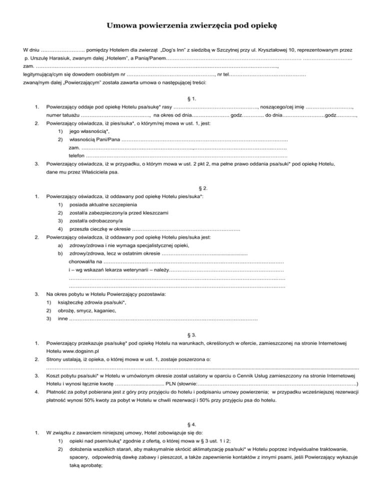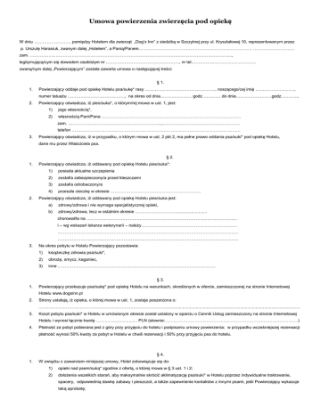 Umowa powierzenia zwierzęcia pod opiekę W dniu ………………….…. pomiędzy Hotelem dla zwierząt „Dog’s Inn” z siedzibą w Szczytnej przy ul. Kryształowej 10, reprezentowanym przez p. Urszulę Harasiuk, zwanym dalej „Hotelem”, a Panią/Panem……………………………………………………………………. ……………………….. zam. …………………………………………………………………………………………………………………………..., legitymującą/cym się dowodem osobistym nr ……………………………………………, nr tel……………………………………… zwaną/nym dalej „Powierzającym” została zawarta umowa o następującej treści: § 1. 1. Powierzający oddaje pod opiekę Hotelu psa/sukę* rasy …………………………………………., noszącego/cej imię ………………………, numer tatuażu …………………………………., na okres od dnia…………………. godz…………. do dnia….…………………godz……..…., 2. Powierzający oświadcza, iż pies/suka*, o którym/rej mowa w ust. 1, jest: 1) jego własnością*, 2) własnością Pani/Pana ……………………………………………………………………………………. zam. ………………………………………………………..,……………………………………………… telefon …………………………………………………………………………………………...…………. 3. Powierzający oświadcza, iż w przypadku, o którym mowa w ust. 2 pkt 2, ma pełne prawo oddania psa/suki* pod opiekę Hotelu, dane mu przez Właściciela psa. § 2. 1. 2. Powierzający oświadcza, iż oddawany pod opiekę Hotelu pies/suka*: 1) posiada aktualne szczepienia 2) został/a zabezpieczony/a przed kleszczami 3) został/a odrobaczony/a 4) przeszła cieczkę w okresie ……………………………………………………… Powierzający oświadcza, iż oddawany pod opiekę Hotelu pies/suka jest: a) b) zdrowy/zdrowa i nie wymaga specjalistycznej opieki, zdrowy/zdrowa, lecz w ostatnim okresie …………………………........................ chorował/ła na …………………………………………………………………………………………… i – wg wskazań lekarza weterynarii – należy…………………………………………………………. ……………………………………………………………………………………………………………… ……………………………………………………………………………………………………………… 3. Na okres pobytu w Hotelu Powierzający pozostawia: 1) książeczkę zdrowia psa/suki*, 2) obrożę, smycz, kaganiec, 3) inne .………………………………………………………………………….…………………… § 3. 1. Powierzający przekazuje psa/sukę* pod opiekę Hotelu na warunkach, określonych w ofercie, zamieszczonej na stronie Internetowej Hotelu www.dogsinn.pl 2. Strony ustalają, iż opieka, o której mowa w ust. 1, zostaje poszerzona o: …………………………………………………………………………….................................................................................................................. 3. Koszt pobytu psa/suki* w Hotelu w umówionym okresie został ustalony w oparciu o Cennik Usług zamieszczony na stronie Internetowej Hotelu i wynosi łącznie kwotę ………….................... PLN (słownie:……..………………………………………………………………………….) 4. Płatność za pobyt pobierana jest z góry przy przyjęciu do hotelu i podpisaniu umowy powierzenia; w przypadku wcześniejszej rezerwacji płatność wynosi 50% kwoty za pobyt w Hotelu w chwili rezerwacji i 50% przy przyjęciu psa do hotelu. § 4. 1. W związku z zawarciem niniejszej umowy, Hotel zobowiązuje się do: 1) opieki nad psem/suką* zgodnie z ofertą, o której mowa w § 3 ust. 1 i 2; 2) dołożenia wszelkich starań, aby maksymalnie skrócić aklimatyzację psa/suki* w Hotelu poprzez indywidualne traktowanie, spacery, odpowiednią dawkę zabawy i pieszczot, a także zapewnienie kontaktów z innymi psami, jeśli Powierzający wykazuje taką aprobatę; 3) przekazywania Powierzającemu okresowych informacji o pozostawionym zwierzęciu – zgodnie z obopólnymi ustaleniami, 4) żywienia psa/suki* zgodnie z ofertą lub według obopólnie ustalonych z Powierzającym zasad, 5) dbania o stan fizyczny i psychiczny powierzonego zwierzęcia, a w razie konieczności – otoczenia go opieką weterynaryjną, powiadamiając niezwłocznie o tym fakcie Powierzającego na podany w Umowie Powierzenia numer telefonu, 6) 2. podawania – jeśli taka konieczność zachodzi - przepisanych przez lekarza weterynarii lekarstw. W związku z zawarciem niniejszej umowy, Powierzający zobowiązuje się do: 1) poinformowania Hotelu o aktualnym stanie zdrowia przekazywanego psa/suki*; 2) poinformowania Hotelu o charakterze przekazywanego psa/suki*, co pozwoli na ograniczenie/uniknięcie ewentualnych konfliktów z ludźmi i innymi zwierzętami, 3) przekazania Hotelowi różnego rodzaju wskazówek, które Powierzający uzna za istotne, 4) uregulowania płatności zgodnie z § 3 ust. 4 do niniejszej umowy bądź indywidualnymi ustaleniami z Hotelem, 5) odebrania psa/suki* z Hotelu w określonym w umowie terminie. § 5. 1. Ustalony w niniejszej umowie termin pobytu psa/suki* w Hotelu może być – za zgodą Hotelu – zmieniony. 2. W przypadku skrócenia terminu pobytu, Powierzający jest zobowiązany zapłacić pełną kwotę, o której mowa w § 3 ust. 3 niniejszej umowy 3. W przypadku wydłużenia – za zgodą Hotelu – terminu pobytu, Powierzający jest zobowiązany do przekazania na konto Hotelu pełnej kwoty za okres przedłużenia pobytu 