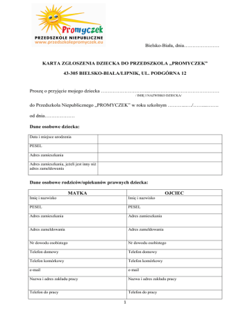 Bielsko-Biała, dnia………………… KARTA ZGŁOSZENIA DZIECKA DO PRZEDSZKOLA „PROMYCZEK” 43-305 BIELSKO-BIAŁA/LIPNIK, UL. PODGÓRNA 12 Proszę o przyjęcie mojego dziecka ………………………..…………………………………… / IMIĘ I NAZWISKO DZIECKA/ do Przedszkola Niepublicznego „PROMYCZEK” w roku szkolnym ………..…./……...……. od dnia……………… Dane osobowe dziecka: Data i miejsce urodzenia PESEL Adres zamieszkania Adres zamieszkania, jeŜeli jest inny niŜ adres zameldowania Dane osobowe rodziców/opiekunów prawnych dziecka: MATKA OJCIEC Imię i nazwisko Imię i nazwisko PESEL PESEL Adres zamieszkania Adres zamieszkania Adres zameldowania Adres zameldowania Nr dowodu osobistego Nr dowodu osobistego Telefon domowy Telefon domowy Telefon komórkowy Telefon komórkowy e-mail e-mail Nazwa i adres zakładu pracy Nazwa i adres zakładu pracy Telefon do pracy Telefon do pracy 1 UPOWAśNIENIE Ja ……………………………..…………legitymujący się dowodem osobistym o serii i numerze ……………………..upowaŜniam do przyprowadzania i odbierania mojego dziecka z przedszkola osoby wymienione poniŜej: Imię i nazwisko Adres zamieszkania Seria i nr dowodu osobistego Telefon kontaktowy *Oświadczamy, Ŝe bierzemy pełną odpowiedzialność za bezpieczeństwo dziecka od momentu odebrania go z przedszkola przez pełnoletnią osobę wskazaną powyŜej. ………………………………. ……………………………………………. Miejscowość i data Podpisy Rodziców/ Opiekunów prawnych • WyraŜam/y zgodę na zbieranie, przetwarzanie i wykorzystywanie w celach związanych z przyjęciem i pobytem w Przedszkolu Niepublicznym „Promyczek” naszego dziecka, danych osobowych naszych i dziecka oraz upowaŜnionych do odbioru dziecka osób, przez Przedszkole Niepubliczne „Promyczek” zgodnie z ustawą z dnia 29 sierpnia 1997r. o ochronie danych osobowych. WyraŜam zgodę/ nie wyraŜam zgody* • WyraŜam zgodę na publikację zdjęć dziecka z pobytu, uroczystości i imprez przedszkolnych na stronie internetowej przedszkola www.przedszkolepromyczek.eu oraz w innych materiałach promujących przedszkole. WyraŜam zgodę / nie wyraŜam zgody* …………………………………………… Podpisy Rodziców/ Opiekunów prawnych *) Niepotrzebne skreślić 2 DODATKOWE INFORMACJE O DZIECKU Dane dotyczące dziecka: • czy dziecko uczęszczało juŜ do przedszkola?................................................................... • przebyte choroby zakaźne/stan zdrowia……………………...………………………..... …………………………………………………………………………………………... • alergie pokarmowe/uczulenia…………………………………………………………… …………………………………………………………………………………………... • czy dziecko sygnalizuje potrzeby fizjologiczne?.............................................................. …………………………………………………………………………………………... • czy dziecko śpi w ciągu dnia? /proszę podać godziny/..................................................... • czy dziecko ma szczególne uzdolnienia? /jakie/………………………………………... …………………………………………………………………………………………... • jak dziecko zachowuje się w kontaktach z rówieśnikami?............................................... …………………………………………………………………………………………... • orientacyjne godziny pobytu dziecka w przedszkolu – od………….….do………....... • czy dziecko będzie korzystało z dodatkowych odpłatnych zajęć prowadzonych w przedszkolu? /jeśli tak, to z jakich/………………………………………………..... …………………………………………………………………………………………... • inne informacje dotyczące dziecka, o których Rodzice chcieliby poinformować……… ………………………………………………………………………………………...… ………………………………………………………………………………………….. ………………………………………………………………………………………….. Dane dotyczące rodzeństwa (proszę wpisać imię i rok urodzenia) ………………………………………………………………………………………………… ………………………………………………………………………………………………… ………………………………………………………………………………………………… 3