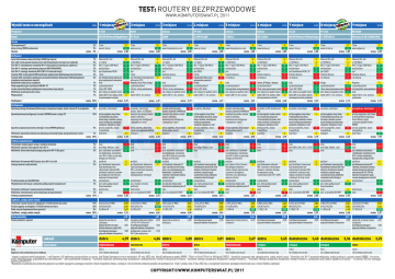 TEST: ROUTERY BEZPRZEWODOWE WWW.KOMPUTERSWIAT.PL'2011 Wyniki testu w szczegółach waga 1 miejsce ocena 2 miejsce ocena ocena 4 miejsce ocena 5 miejsce ocena 6 miejsce ocena 7 miejsce ocena 8 miejsce DIR-655 Wireless N Gigabit Router RT-N13U Serwis Okres gwarancji* 3% Adres strony WWW producenta 2% Serwissuma 5% 2 lata 4 2 lata 4 2 lata 4 2 lata 4 2 lata 4 2 lata 4 2 lata 4 2 lata 4 2 lata 4 www.d-link.pl 6 www.asus.pl 6 www.linksysbycisco.com 6 www.tp-link.pl 6 www.linksysbycisco.com 6 www.edimax.pl 6 www.d-link.pl 6 www.tp-link.pl 6 www.netgear.pl 6 ocena 4,80 ocena 4,80 ocena 4,80 ocena 4,80 ocena 4,80 ocena 4,80 ocena 4,80 ocena 4,80 ocena 4,80 Konfiguracja Instrukcja obsługi (drukowana)/informacja o domyślnym loginie, haśle i adresie IP na urządzeniu po polsku, mierna/jest Pozostałe możliwości zaawansowanej konfiguracji Możliwość zainstalowania alternatywnego oprogramowania Funkcje zaawansowane brak 1 jest (High, Medium, Low) 5 jest, możliwość uruchomie5 nia dodatkowej, niezależnej sieci Wi-Fi tylko na potrzeby dostępu do internetu 2% jest/brak 4 2% jest (możliwość utworzenia 4 listy dozwolonych lub zabronionych adresów URL, możliwość ustalenia czasowego dostępu do internetu dla wybranych komputerów) 2% jest/jest/jest 6 1% jest, tylko podłączonych 5 bezprzewodowo 2% bardzo duże 5 1% brak 1 suma 15% ocena 3,60 Szybkość, zasięg i pobór energii Zmierzony transfer danych w odległości 1/15/30 metrów od rutera Poziom sygnału w odległości 1/15/30 metrów od rutera Pobór energii (kopiowanie/bezczynność) Szybkość, zasięg i pobór energii 15% 5,04/3,22/2,67 MB/s 10% 63%/56%/33% 5% 5,8 W/6,4 W suma 30% ocena Możliwość filtrowania MAC/izolacji sieci Wi-Fi od LAN Funkcja kontroli rodzicielskiej Przekierowanie portów/DMZ/QoS Wyświetlanie informacji o aktualnie podłączonych komputerach Ocena pośrednia Punkty dodatnie i ujemne 1% 1% 3% 2 Edimax D-Link E2000 TL-WR1043ND E1000 v2 BR-6428nS DIR-600 Wireless N 150 Home Router TL-WR740N v1 4 4 5 6 6 5 4 Ethernet (RJ-45) 4 (1 Gb/s) 802.11 a/b/g/n (300 Mb/s) jest/jest/jest jest brak/nie dotyczy nie dotyczy 4 6 6 6 6 1 1 6 6 1 1 3 brak są (jest/jest/jest) 3/brak, anteny wbudowane jest, otwory na spodzie rutera kabel LAN (1,5 m), zasilacz 1 6 1 6 3 ocena 4,37 100% po polsku, mierna (po polsku, dobra, na CD)/jest brak/jest (po polsku, bardzo łatwy w obsłudze, automatycznie konfiguruje5 i zabezpiecza4 ruter) 4 ocena 3,73 po polsku, mierna (po polsku, wzorowa, do pobrania z WWW)/brak brak/jest (po polsku, bardzo łatwy w obsłudze, automatycznie konfiguruje i zabezpiecza6 ruter) 1 1 1 1,5 Ethernet (RJ-45) 4 (1 Gb/s) 802.11 b/g/n (300 Mb/s) jest/jest/jest jest (QSS) 1/brak brak/brak/jest (tylko proste udostępnianie zawartości) Bridge są (jest/jest/jest) 3/jest (RP-SMA) jest, otwory na spodzie rutera kabel LAN (1,1 m), zasilacz 4 6 5 6 6 3 2 Ethernet (RJ-45) 4 (100 Mb/s) 802.11 b/g/n (300 Mb/s) jest/jest/jest jest brak/nie dotyczy nie dotyczy 3 6 6 6 3 brak są (jest/jest/jest) brak danych/brak, anteny wbudowane jest, otwory na spodzie rutera kabel LAN (1,5 m), zasilacz ocena 4,27 brak 1 brak 1 jest, możliwość uruchomie5 nia dodatkowej, niezależnej sieci Wi-Fi tylko na potrzeby dostępu do internetu jest/jest 6 jest/jest 6 jest (możliwość utworzenia 3 jest (możliwość stworzenia 10 5 listy blokowanych adresów reguł i określenia w nich kompuURL z określonymi słowami, terów, czasu obowiązywania oraz reguły czasowe blokowanych: 4 adresów URL, obowiązywania restrykcji) 4 adresów z określonymi słowami, aplikacji i portów) jest/jest/jest 6 jest/jest/jest 6 jest, również w formie 6 jest, tylko tych, którym został 5 graficznej automatycznie przydzielony adres IP bardzo duże 5 duże 4 jest, na przykład DD-WRT 6 jest, na przykład DD-WRT 6 ocena 2,73 ocena 3,73 brak brak brak 3,51 5,43/3,23/3,21 MB/s 4,01 86%/63%/41% 3,87 5,2 W/5,9 W 3,74 ocena 4,10 wyłącznik we wtyczce +0,01 menedżer pobierania plików zasilającej z HTTP, FTP i BitTorrent 11 aplikacja SharePort do współ+0,01 do konfiguracji wymagane dzielenie dowolnych urządzeń USB połączenie kablowe z komputerem do konfiguracji wymagane -0,05 konfigurator ustawia sieć połączenie kablowe z komputerem Wi-Fi jako wyłączoną po polsku, dobra/jest brak jest (High, Middle, Low) brak jest/jest jest (możliwość utworzenia listy 8 dozwolonych adresów URL i/lub adresów z określonymi słowami, możliwość ustalenia reguły czasowej dla tej listy, dodatkowe ustawienia kontroli dostępu) jest/jest/brak jest, tylko podłączonych bezprzewodowo duże jest, na przykład DD-WRT ocena 4 4 4 5 6 6 1 1 Ethernet (RJ-45) 4 (100 Mb/s) 802.11 b/g/n (300 Mb/s) jest/jest/jest jest brak/nie dotyczy nie dotyczy 4 4 5 6 6 1 1 1 6 1 6 3 Station, AP Bridge 3, Repeater 6 są (jest/jest/jest) 6 2/brak, anteny przymocowane na stałe 1 jest, otwory na spodzie rutera 6 kabel LAN (1 m), zasilacz, kołki 3 do zamocowania na ścianie ocena 3,23 ocena 3,40 po polsku na CD, dostateczna/ 3 jest Sposób pierwszej konfiguracji: kreator WWW/kreator z płyty CD 10% jest (po angielsku, dosyć łatwy 4 5 5 jest (po angielsku, dosyć łatwy 4 5 jest (po angielsku, trudny w obsłu- 4 w obsłudze)/jest (po polsku, w obsłudze)/jest (po polsku, bardzo dze, ustawia tylko połączenie bardzo łatwy w obsłudze, automałatwy w obsłudze, automatycznie z internetem)/jest (po polsku, dość tycznie konfiguruje podstawowe konfiguruje podstawowe trudny w obsłudze, automatycznie ustawienia i zabezpiecza4 ruter) ustawienia i zabezpiecza4 ruter) konfiguruje i zabezpiecza ruter) Sposób zarządzania (prostota obsługi): strona WWW/aplikacja 5% jest (po angielsku, dosyć 2 jest (po angielsku, dosyć łatwa, 3 jest (po angielsku, dosyć trudna)/ 4 jest (po angielsku, dosyć 2 jest (po angielsku, dosyć trudna)/ 4 jest (po polsku, dosyć 4 trudna)/brak z graficznymi wyjaśnieniami)/brak jest (po polsku, prosta 7) trudna)/brak jest (po polsku, prosta 7) trudna)/brak Możliwość 