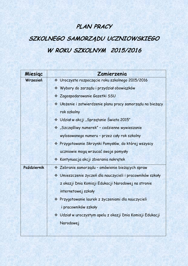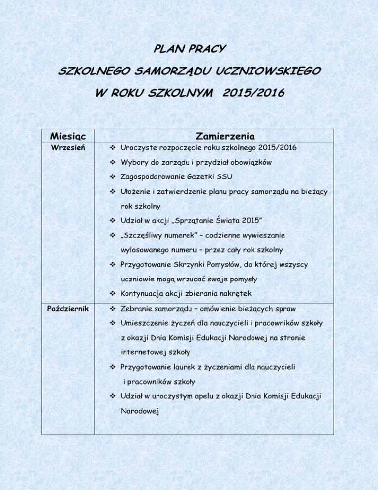 PLAN PRACY SZKOLNEGO SAMORZĄDU UCZNIOWSKIEGO W ROKU SZKOLNYM 2015/2016 Miesiąc Wrzesień Zamierzenia Uroczyste rozpoczęcie roku szkolnego 2015/2016 Wybory do zarządu i przydział obowiązków Zagospodarowanie Gazetki SSU Ułożenie i zatwierdzenie planu pracy samorządu na bieżący rok szkolny Udział w akcji „Sprzątanie Świata 2015” „Szczęśliwy numerek” – codzienne wywieszanie wylosowanego numeru – przez cały rok szkolny Przygotowanie Skrzynki Pomysłów, do której wszyscy uczniowie mogą wrzucać swoje pomysły Kontynuacja akcji zbierania nakrętek Październik Zebranie samorządu – omówienie bieżących spraw Umieszczenie życzeń dla nauczycieli i pracowników szkoły z okazji Dnia Komisji Edukacji Narodowej na stronie internetowej szkoły Przygotowanie laurek z życzeniami dla nauczycieli i pracowników szkoły Udział w uroczystym apelu z okazji Dnia Komisji Edukacji Narodowej Listopad „Narodowe Święto Niepodległości” – pomoc w przeprowadzeniu apelu Udział w akcji UNICEF „MALI uczniowie idą do szkoły” Organizacja dyskoteki andrzejkowej Obchody Ogólnopolskiego Dnia Praw Dziecka Rozpoczęcie akcji „Góra Grosza” Grudzień Pomoc w przygotowaniu Zawodów Mikołajkowych Pokaz Talentów Akcja „Góra Grosza” Dzień Eksperymentów i Doświadczeń Uczniowskich Rozprowadzenie kartek świątecznych i kalendarzy na rzecz osób niepełnosprawnych Złożenie życzeń świątecznych pracownikom szkoły i uczniom na stronie internetowej szkoły POCZTA ŚWIĄTECZNA – przekazanie życzeń od uczniów dla uczniów i pracowników szkoły Styczeń NOC KINA dla klas szóstych Konkurs na największego i najładniejszego bałwana Przygotowanie wystawy książek (akcja UNICEF – MALI uczniowie idą do szkoły) Podsumowanie akcji „Góra grosza” Luty Walentynki – poczta Amora Festiwal „Piosenek o miłości” Licytacja książek (akcja MALI uczniowie idą do szkoły) Podsumowanie pracy w I semestrze Marzec Organizacja pierwszego dnia wiosny – zamiana ról i gra w kolory Umieszczenie życzeń z okazji Dnia Kobiet na stronie internetowej szkoły Zbiórka karmy dla schroniska dla zwierząt Życzenia z okazji Świąt Wielkanocnych na stronie internetowej szkoły Kwiecień Pierwszy kwietnia na wesoło – pokaz kabaretów Konkurs fotograficzny z okazji Dnia Ziemi Zbiórka książek do biblioteki szkolnej Kino szkolne Maj Apel w rocznicę Konstytucji 3 Maja – pomoc w przygotowaniu apelu Portret mojej mamy - konkurs Umieszczenie życzeń z okazji Dnia Matki na stronie internetowej szkoły Czerwiec Podsumowanie całorocznej zbiórki nakrętek i baterii Zakończenie roku szkolnego i pożegnanie absolwentów – apel Podsumowanie pracy SSU w roku szkolnym 2015/2016, wyciągnięcie wniosków do realizacji na kolejny rok szkolny CAŁY ROK SZKOLNY: Losowanie „Szczęśliwego numerka”, Zbiórka nakrętek, Zbiórka baterii – klasy IV-VI, Zebrania samorządu oraz samorządów klasowych (raz w tygodniu – środa o godzinie 10.30), Umieszczanie sprawozdań i relacji z działalności SU na stronie internetowej szkoły, Aktualizowanie gazetki ściennej, Realizowanie pomysłów zgłoszonych przez uczniów, Włączanie się do nowych akcji zapoczątkowanych w trakcie trwania roku szkolnego Plan pracy SU został opracowany podczas zebrania przez zarząd oraz samorządy klasowe przy pomocy opiekuna samorządu.
