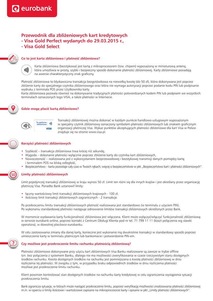 Przewodnik dla zbliżeniowych kart kredytowych - Visa Gold Perfect wydanych do 29.03.2015 r., - Visa Gold Select Co to jest karta zbliżeniowa i płatność zbliżeniowa? Karta zbliżeniowa (bezstykowa) jest kartą z mikroprocesorem (tzw. chipem) wyposażoną w miniaturową antenę, która umożliwia w prosty, szybki i bezpieczny sposób dokonanie płatności zbliżeniowej. Karty zbliżeniowe posiadają na awersie charakterystyczny znak graficzny. Płatność zbliżeniowa to błyskawiczna transakcja bezgotówkowa na niewielką kwotę (do 50 zł), która dokonywana jest poprzez zbliżenie karty do specjalnego czytnika zbliżeniowego oraz która nie wymaga autoryzacji poprzez podanie kodu PIN lub podpisanie wydruku z terminala POS przez Użytkownika karty. Karta zbliżeniowa pozwala również na dokonywanie tradycyjnych płatności potwierdzanych kodem PIN lub podpisem we wszystkich terminalach oznaczonych logo VISA, a także płatności w Internecie. Gdzie mogę płacić kartą zbliżeniowo? Transakcji zbliżeniowej można dokonać w każdym punkcie handlowo-usługowym wyposażonym w specjalny czytnik zbliżeniowy oznaczony symbolem płatności zbliżeniowych lub znakiem graficznym organizacji płatniczej Visa. Wykaz punktów akceptujących płatności zbliżeniowe dla kart Visa w Polsce znajduje się na stronie www.visa.pl. Korzyści płatności zbliżeniowych • • • • Szybkość – transakcja zbliżeniowa trwa krócej niż sekundę, Wygoda – dokonanie płatności wyłącznie poprzez zbliżenie karty do czytnika kart zbliżeniowych, Nowoczesność – realizowana jest z wykorzystaniem bezprzewodowej i bezstykowej transmisji danych pomiędzy kartą i terminalem POS na bliską odległość, Bezpieczeństwo – karta pozostaje cały czas w Twoich rękach; więcej o bezpieczeństwie w pkt „Bezpieczeństwo kart i płatności zbliżeniowych”. Limity płatności zbliżeniowych Limit pojedynczej transakcji zbliżeniowej w kraju wynosi 50 zł. Limit ten różni się dla innych krajów i jest określany przez organizację płatniczą Visa. Ponadto Bank ustanowił limity: • łączny wartościowy limit transakcji zbliżeniowych krajowych - 100 zł, • ilościowy limit transakcji zbliżeniowych zagranicznych - 2 transakcje. Po przekroczeniu limitu transakcji zbliżeniowych płatność realizowana jest standardowo (w terminalu z użyciem PIN). Po wykonaniu standardowej płatności następuje odnowienie limitów transakcji zbliżeniowych określonych przez Bank. W momencie wydawania karty funkcjonalność zbliżeniowa jest włączona. Klient może wyłączyć/włączyć funkcjonalność zbliżeniową: w serwisie eurobank online, poprzez kontakt z Centrum Obsługi Klienta pod nr tel. 71 799 11 11 (koszt połączenia wg stawki operatora), w dowolnej placówce eurobanku. W celu zastosowania zmiany dla danej karty, konieczne jest wykonanie nią dwukrotnie transakcji w standardowy sposób poprzez umieszczenie karty w terminalu płatniczym lub bankomacie i potwierdzenie PIN-em. Czy możliwe jest przekroczenie limitu rachunku płatnością zbliżeniową? Płatności zbliżeniowe dokonywane przy użyciu kart zbliżeniowych Visa Banku realizowane są zawsze w trybie offline tzn. bez połączenia z systemem Banku, dlatego nie ma możliwości zweryfikowania w czasie rzeczywistym stanu dostępnych środków rachunku. Kwota dostępnych środków na rachunku jest pomniejszana o kwotę płatności zbliżeniowej w dniu rozliczenia tej płatności. W związku z tym, w przypadku braku odpowiednich środków w dniu rozliczenia płatności możliwe jest przekroczenie limitu rachunku. Klient powinien kontrolować stan dostępnych środków na rachunku karty kredytowej w celu ograniczenia wystąpienia sytuacji przekroczenia limitu. Bank ogranicza sytuacje, w których może nastąpić przekroczenie limitu, poprzez weryfikację możliwości zrealizowania płatności zbliżeniowej m.in. w oparciu o limity ilościowe i wartościowe zapisane na mikroprocesorze karty i opisane w pkt „Limity płatności zbliżeniowych”. Bezpieczeństwo kart i płatności zbliżeniowych Karty zbliżeniowe chronione są poprzez zastosowanie najnowszych technik szyfrowania i rozwiązań technologicznych takich samych jak w przypadku standardowych kart z mikroprocesorem. Dzięki temu: • • • • • nie jest możliwe skopiowanie karty - podczas płatności zbliżeniowej karta znajduje się cały czas w Twoich rękach, nie jest możliwe odczytanie zbliżeniowo danych osobowych i danych karty, które pozwoliłyby na dokonanie nieuprawnionych transakcji, nie jest możliwe przypadkowe ani podwójne dokonanie płatności zbliżeniowej - kwota za zakup jest pobierana tylko jeden raz, nawet jeśli karta została kilkukrotnie zbliżona do czytnika zbliżeniowego, nie jest możliwe dokonanie transakcji powyżej limitów ustanowionych dla płatności zbliżeniowych - transakcje te ograniczone są limitami bezpieczeństwa zapisanymi na chipie (pkt „Limity dla płatności zbliżeniowych”), nie jest możliwe dokonanie transakcji zbliżeniowej otrzymaną kartą bez wcześniejszego dokonania transakcji standardowej (stykowej) z potwierdzeniem PIN. Ponadto transakcje zbliżeniowe, tak jak i transakcje standardowe (w terminalu z użyciem PIN) są monitorowane przez systemy bezpieczeństwa Banku, które reagują w przypadku zidentyfikowania nietypowej bądź podejrzanej aktywności na karcie. Jak aktywować kartę zbliżeniową? Karty zbliżeniowe w momencie wydania są nieaktywne. Aktywacja karty może być realizowana w jednym z poniższych kanałów: w serwisie eurobank online w dowolnej placówce eurobanku dzwoniąc do Centrum Obsługi Klienta na numer 19 000 (koszt połączenia wg stawki operatora). Pierwsza transakcja dokonywana kartą zbliżeniową powinna być zrealizowana jako standardowa transakcja w terminalu POS (stykowa z użyciem PIN) lub w bankomacie, wówczas dopiero nastąpi aktywacja funkcjonalności zbliżeniowej. W przy