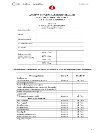 ANKIETA DOTYCZĄCA MIKROINSTALACJI PANELI FOTOWOLTAICZNYCH DLA GMINY RADYMNO ANKIETA GOSPODARSTWA DOMOWEGO (dane dotyczą 2015 roku) Imię i Nazwisko: Adres: Adres inwestycji: Nr telefonu, e-mail: Nr działki: Zainteresowanie zestawem o mocy [proszę zaznaczyć X] 1 kW, 1 faza 2 kW, 1 faza 3 kW, 1 fazy 3 kW, 3 fazy I. Charakterystyka obiektów budowlanych wchodzących w skład gospodarstwa domowego Wyszczególnienie Rok budowy Posiadany tytuł prawny do obiektu (1) Technologia budowy (2) Powierzchnia ogrzewana w [m2] Powierzchnia południowej ekspozycji dachu dla instalacji wykorzystującej energię słońca w [m2] Rodzaj pokrycia dachowego (3) Liczba osób Wykorzystanie gazu z butli Rodzaj ogrzewania Piec - drewno Piec - węgiel Kocioł węglowy Kocioł gazowy Kocioł olejowy Kocioł pelet Instalacja solarna c.w.u. Bojler elektryczny c.w.u. Inny, wskazać jaki …………………………. Obiekt A Obiekt B* tak / nie tak / nie tak / nie tak / nie tak / nie tak / nie tak / nie tak / nie tak / nie tak / nie tak / nie tak / nie tak / nie tak / nie tak / nie tak / nie tak / nie tak / nie tak / nie tak / nie 1 tytuł prawny do władania nieruchomością jest niezbędny do uzyskania przyłącza mikroinstalacji do sieci (najczęściej spotykanymi tytułami do władania nieruchomością są: prawo własności, prawo użytkowania wieczystego, użytkowanie, dzierżawa, najem lub samoistne posiadanie), (2) technologia budowy – cegła, pustak (3) rodzaj pokrycia dachowego – eternit, blacha, itp. * Np. budynek garażu (1) II. Wykaz energochłonnych urządzeń elektrycznych w gospodarstwach domowych [kW] Rodzaj urządzenie Lodówka Zamrażalka Pralka Zmywarka Kuchenka elektryczna Kuchenka mikrofalowa Piekarnik elektryczny Prodiż Okap kuchenny Podgrzewacz wody (np. bojler) Moc [kW] Rodzaj urządzenia Żelazko Odkurzacz Silniki Hydrofor Czajnik elektryczny Grzejnik elektryczny Suma żarówek Moc [kW] Łączna moc wszystkich urządzeń: ………………………. kW III. Zużycie energii elektrycznej w gospodarstwie domowym na podstawie rachunków za energię – 2015 r. Zużycie w okresach rozliczeniowych(1) w 2015 r. Wyszczególnienie Zużycie rzeczywiste [kWh] Zużycie szacowane [kWh] Styczeń Luty Marzec Kwiecień Maj Czerwiec Lipiec Sierpień Wrzesień Październik Listopad Grudzień Razem w roku Moc umowna (przyłączeniowa)(2) ……………….. kW zużycie podać z podziałem na poszczególne okresy rozliczeniowe (miesięczne, dwumiesięczne lub kwartalne) (1) 2 Moc umowna wynika z podpisanej umowy z operatorem systemu dystrybucyjnego oraz jest wyrażana w „kW”. Często występuje w fakturach za energię pod pozycją „moc umowna” lub w pozycji „ilość” przy opłacie sieciowej stałej lub opłacie przejściowej – patrz załącznik. (2) Oświadczenie: Zgodnie z art. 23 ust. 1 pkt. 1 ustawy z dnia 29 sierpnia 1997r o ochronie danych osobowych (Dz. U. z 2014r poz. 1182, z późn. zm.) wyrażam zgodę na przetwarzanie danych osobowych zawartych w ankiecie w celu uzyskania dofinansowania na budowę mikroinstalacji prosumenckich. Data: ……………………………… ………………………………………………….. (podpis) Zgodnie z art. 24 ust. 1 ustawy z dnia 29 sierpnia 1997r o ochronie danych osobowych (Dz. U. z 2014r z późn. zm.) informuje się, że: 1. Administratorem Państwa danych osobowych jest Gmina Radymno 2. Państwa dane osobowe przetwarzane będą w celu uzyskania dofinansowania na budowę mikroinstalacji prosumenckich. 3. Posiadają Państwo prawo dostępu do treści swoich danych oraz ich poprawiania. 4. Podanie danych osobowych jest dobrowolne i determinuje możliwość uzyskania dofinansowania na budowę mikroinstalacji prosumenckich. Przykładowy rachunek za energię elektryczną Objaśnienia: 1 – Moc umowna [kW] 2 – Zużycie rzeczywiste „R” [kWh] 3 – Zużycie szacowane „S” [kWh] UWAGI: Proszę dołączyć zdjęcie południowej strony dachu. 3