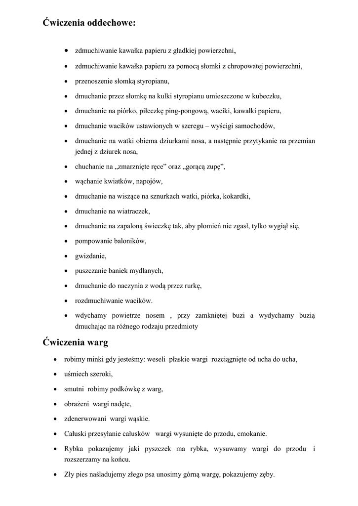 Ćwiczenia oddechowe: zdmuchiwanie kawałka papieru z gładkiej powierzchni, zdmuchiwanie kawałka papieru za pomocą słomki z chropowatej powierzchni, przenoszenie słomką styropianu, dmuchanie przez słomkę na kulki styropianu umieszczone w kubeczku, dmuchanie na piórko, piłeczkę ping-pongową, waciki, kawałki papieru, dmuchanie wacików ustawionych w szeregu – wyścigi samochodów, dmuchanie na watki obiema dziurkami nosa, a następnie przytykanie na przemian jednej z dziurek nosa, chuchanie na „zmarznięte ręce” oraz „gorącą zupę”, wąchanie kwiatków, napojów, dmuchanie na wiszące na sznurkach watki, piórka, kokardki, dmuchanie na wiatraczek, dmuchanie na zapaloną świeczkę tak, aby płomień nie zgasł, tylko wygiął się, pompowanie baloników, gwizdanie, puszczanie baniek mydlanych, dmuchanie do naczynia z wodą przez rurkę, rozdmuchiwanie wacików. wdychamy powietrze nosem , przy zamkniętej buzi a wydychamy buzią dmuchając na różnego rodzaju przedmioty Ćwiczenia warg robimy minki gdy jesteśmy: weseli płaskie wargi rozciągnięte od ucha do ucha, uśmiech szeroki, smutni robimy podkówkę z warg, obrażeni wargi nadęte, zdenerwowani wargi wąskie. Całuski przesyłanie całusków wargi wysunięte do przodu, cmokanie. Rybka pokazujemy jaki pyszczek ma rybka, wysuwamy wargi do przodu i rozszerzamy na końcu. Zły pies naśladujemy złego psa unosimy górną wargę, pokazujemy zęby. warczenie psa. Gorąca zupa pokazanie jak chłodzimy wargami zupę. Ćwiczenia języka Łyżeczka unoszenie przodów i boków języka, Łopatka wysuwanie płaskiego i szerokiego języka, itp. Koniki czubek języka uderza o podniebienie i opada na dół. Raz konik idzie wolno, to biegnie, parska, śmieje się iha ha Śniadanko misia miś starannie oblizuje wargi przy otwartych ustach wargi smarujemy miodem, czekoladą, bitą śmietaną. Ssanie cukierków. Żabka dziecko ma z talerzyka zebrać płatki kukurydziane posługując się tylko czubkiem języka. „Mały ptaszek uczy się śpiewać” – powtarzanie sylab szeptem, a następnie głośno: la, la, la, trla, lo, lo, lo, trlo, lu, lu, lu, trlu, le, le, le, trle, ly, ly, ly, trly, li, li, li, trli. yciągnąć długi język - taki jak ma żaba, wąż. Masażysta czubek języka będzie masował delikatnie podniebienie (wcześniej trzeba dziecku wytłumaczyć i pokazać gdzie jest podniebienie), dotyka dziąseł na górze i dole, masuje wargi, język masuje od środka policzki (raz prawe, lewe), próbuje rysować kreseczki, kółeczka. Wyrazy dźwiękonaśladowcze – naśladowanie odgłosów zaczynając od szeptu: gra na trąbce – tra ta ta, tru tu tu, tre te te, ( bardzo ważne by język nie wyuwał się na zewnątrz jamy ustnej, mówimy delikatnie zaciskając usta) groźny pies – wrr, wrr, wrr, traktor – tur tur tur, tyr tyr tyr, pyr pyr pyr, fruwające ptaki – fru, fru, fru, ćwierkające wróble – ćwir, ćwir, ćwir, świnka – chrum, chrum, zatrzymanie konia – pr, pr, śpioch – chr, chr, chr, dzwonek – dryń, dryń, szorowanie zębów – szuru, szuru, zapalanie światła – pstryk, pękający balonik – trach, wrona – kra, kra, samochód – brum, brum. wąż- sssssssssssss (zęby zaciśnięte, usta ułożone w uśmiech) Różnicowanie głosek "s", "z". Do wykorzystania potrzebny jest obrazek przedstawiający muchę i węża. Uwagę dziecka koncentrujemy na dźwiękach wydawanych przez węża (sssssssssssss) i muchę (zzzzzzzzz). Ćwiczenia podniebienia Zabawa języczek wędrowniczek: Chory Tomek który bardzo źle się czuł i zachorował. Chłopiec był kapryśny, nie chciał jeść, był senny i bardzo kaszlał (naśladowanie ziewania przy nisko opuszczonej szczęce dolnej, kaszel z językiem daleko wysuniętym do przodu). Mamusia wezwała pogotowie (eo, eo, au, au,). Przyjechała pani doktor i zaleciła Tomkowi płukanie gardła, połykanie pastylek, picie syropu (naśladowanie tych czynności) oraz inhalacje (zaciskanie na przemian dziurki nosa i oddychanie wolno). Chłopiec bardzo zmęczony, ziewa i zasypia. Podczas spania chrapie (na wdechu i wydechu) itd. Nadmuchiwanie baloników. Puszczanie baniek mydlanych kto więcej puści baniek?, komu uda się zrobić największą? Echo powtarzanie sylab: ka, ko, ke, ku, ak, ok., oke, uku, oko, ga, go, ge, gu, aga, ogo, ege, ugu Ćwiczenia szczęki dolnej Naśladowanie otwierania szeroko buzi jak podczas ziewania. Wąchanie kwiatów duży wdech nosem i wydech ustami z jednoczesnym wymawianiem głoski aa (jako zachwyt), oo (zdziwienie). Chwytanie górnej wargi dolnymi zębami. Opuszczanie i unoszenia dolnej szczęki. Wymawianie szerokiego a i przechodzenie do wymawiania a połączonego z głoską s. Zabawa w "Misie", które budzą się na wiosnę. Proponujemy pozycję leżącą: Misie śpią, oddychają nosem. Misie budzą się, ziewają. Misie wdychają powietrze ustami, zamykają usta i mruczą - mmm, mm, m.