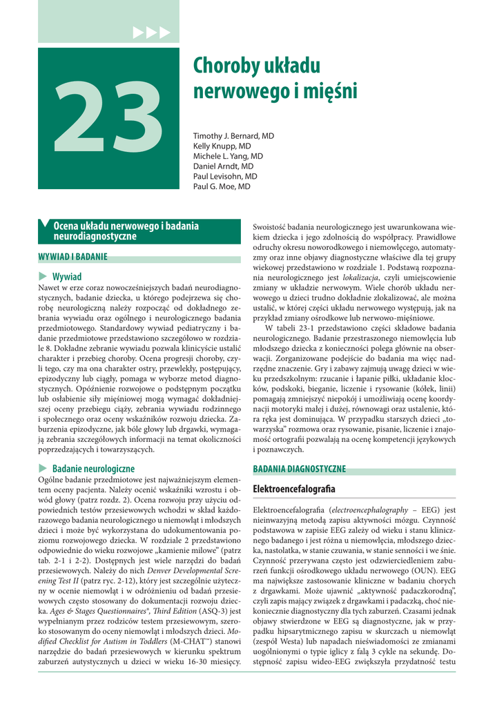 23 Choroby układu nerwowego i mięśni Timothy J. Bernard, MD Kelly Knupp, MD Michele L. Yang, MD Daniel Arndt, MD Paul Levisohn, MD Paul G. Moe, MD Ocena układu nerwowego i badania neurodiagnostyczne Nawet w erze coraz nowocześniejszych badań neurodiagnostycznych, badanie dziecka, u którego podejrzewa się chorobę neurologiczną należy rozpocząć od dokładnego zebrania wywiadu oraz ogólnego i neurologicznego badania przedmiotowego. Standardowy wywiad pediatryczny i badanie przedmiotowe przedstawiono szczegółowo w rozdziale 8. Dokładne zebranie wywiadu pozwala klinicyście ustalić charakter i przebieg choroby. Ocena progresji choroby, czyli tego, czy ma ona charakter ostry, przewlekły, postępujący, epizodyczny lub ciągły, pomaga w wyborze metod diagnostycznych. Opóźnienie rozwojowe o podstępnym początku lub osłabienie siły mięśniowej mogą wymagać dokładniejszej oceny przebiegu ciąży, zebrania wywiadu rodzinnego i społecznego oraz oceny wskaźników rozwoju dziecka. Zaburzenia epizodyczne, jak bóle głowy lub drgawki, wymagają zebrania szczegółowych informacji na temat okoliczności poprzedzających i towarzyszących. Swoistość badania neurologicznego jest uwarunkowana wiekiem dziecka i jego zdolnością do współpracy. Prawidłowe odruchy okresu noworodkowego i niemowlęcego, automatyzmy oraz inne objawy diagnostyczne właściwe dla tej grupy wiekowej przedstawiono w rozdziale 1. Podstawą rozpoznania neurologicznego jest lokalizacja, czyli umiejscowienie zmiany w układzie nerwowym. Wiele chorób układu nerwowego u dzieci trudno dokładnie zlokalizować, ale można ustalić, w której części układu nerwowego występują, jak na przykład zmiany ośrodkowe lub nerwowo-mięśniowe. W tabeli 23-1 przedstawiono części składowe badania neurologicznego. Badanie przestraszonego niemowlęcia lub młodszego dziecka z konieczności polega głównie na obserwacji. Zorganizowane podejście do badania ma więc nadrzędne znaczenie. Gry i zabawy zajmują uwagę dzieci w wieku przedszkolnym: rzucanie i łapanie piłki, układanie klocków, podskoki, bieganie, liczenie i rysowanie (kółek, linii) pomagają zmniejszyć niepokój i umożliwiają ocenę koordynacji motoryki małej i dużej, równowagi oraz ustalenie, która ręka jest dominująca. W przypadku starszych dzieci „towarzyska” rozmowa oraz rysowanie, pisanie, liczenie i znajomość ortografii pozwalają na ocenę kompetencji językowych i poznawczych. Badanie neurologiczne BADANIA DIAGNOSTYCZNE WYWIAD I BADANIE Wywiad Ogólne badanie przedmiotowe jest najważniejszym elementem oceny pacjenta. Należy ocenić wskaźniki wzrostu i obwód głowy (patrz rozdz. 2). Ocena rozwoju przy użyciu odpowiednich testów przesiewowych wchodzi w skład każdorazowego badania neurologicznego u niemowląt i młodszych dzieci i może być wykorzystana do udokumentowania poziomu rozwojowego dziecka. W rozdziale 2 przedstawiono odpowiednie do wieku rozwojowe „kamienie milowe” (patrz tab. 2-1 i 2-2). Dostępnych jest wiele narzędzi do badań przesiewowych. Należy do nich Denver Developmental Screening Test II (patrz ryc. 2-12), który jest szczególnie użyteczny w ocenie niemowląt i w odróżnieniu od badań przesiewowych często stosowany do dokumentacji rozwoju dziecka. Ages & Stages Questionnaires®, Third Edition (ASQ-3) jest wypełnianym przez rodziców testem przesiewowym, szeroko stosowanym do oceny niemowląt i młodszych dzieci. Modified Checklist for Autism in Toddlers (M-CHAT™) stanowi narzędzie do badań przesiewowych w kierunku spektrum zaburzeń autystycznych u dzieci w wieku 16-30 miesięcy. Elektroencefalografia Elektroencefalografia (electroencephalography – EEG) jest nieinwazyjną metodą zapisu aktywności mózgu. Czynność podstawowa w zapisie EEG zależy od wieku i stanu klinicznego badanego i jest różna u niemowlęcia, młodszego dziecka, nastolatka, w stanie czuwania, w stanie senności i we śnie. Czynność przerywana często jest odzwierciedleniem zaburzeń funkcji ośrodkowego układu nerwowego (OUN). EEG ma największe zastosowanie kliniczne w badaniu chorych z drgawkami. Może ujawnić „aktywność padaczkorodną”, czyli zapis mający związek z drgawkami i padaczką, choć niekoniecznie diagnostyczny dla tych zaburzeń. Czasami jednak objawy stwierdzone w EEG są diagnostyczne, jak w przypadku hipsarytmicznego zapisu w skurczach u niemowląt (zespół Westa) lub napadach nieświadomości ze zmianami uogólnionymi o typie iglicy z falą 3 cykle na sekundę. Dostępność zapisu wideo-EEG zwiększyła przydatność testu CHOROBY UKŁADU NERWOWEGO I MIĘŚNI 717 Tabela 23-1. Badanie neurologiczne u dzieci powyżej 1. roku życia Kategoria Czynność Ocena Stan umysłowy Stan świadomości; orientacja, język, ocena rozwoju funkcji korowych (pytania dostosowane do wieku); poziom aktywności; afekt Drogi korowe i podkorowe Nerwy czaszkowe NC I: często pomijany (węch) NC II: źrenice (odruch na światło), wzrok (ostrość), pole widzenia, dno oka NC III, IV, VI: mięśnie zewnątrzgałkowe, źrenice, zbieżność (zez?) NC V: czucie na twarzy (część górna, środkowa, dolna; V1, V2, V3); funkcje motoryczne – ruchy boczne żuchwy, otwieranie, zamykanie ust oporowane NC VII: część górna – zamykanie powieki, marszczenie brwi; dolna – krzywienie ust, pokazywanie zębów NC VIII: szeptu z odległości 3-6 m od każdego ucha. Test z kamertonem NC IX, X: czucie? Ruchomość podniebienia lub języka (krztuszenie się – często pomijane) NC XI: obracanie głowy w lewo i w prawo; zgięcie oporowane NC XII: wysuwanie języka, wypychanie językiem policzka. Oporowanie ruchów w lewo i w prawo kciukiem badającego Funkcje motoryczne Napięcie mięśniowe: tułów (niemowlęta) – w ułożeniu na brzuchu i na grzbiecie; manipulacja rozluźnionymi kończynami; podtrzymywanie pod pachami Siła: proksymalna/dystalna – obręcz barkowa odwodzenie, chwytanie; podnoszen