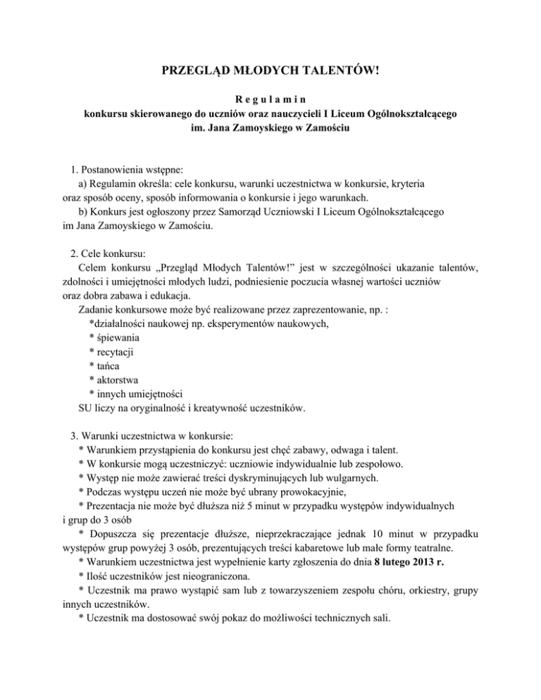 PRZEGLĄD MŁODYCH TALENTÓW! Regulamin konkursu skierowanego do uczniów oraz nauczycieli I Liceum Ogólnokształcącego im. Jana Zamoyskiego w Zamościu 1. Postanowienia wstępne: a) Regulamin określa: cele konkursu, warunki uczestnictwa w konkursie, kryteria oraz sposób oceny, sposób informowania o konkursie i jego warunkach. b) Konkurs jest ogłoszony przez Samorząd Uczniowski I Liceum Ogólnokształcącego im Jana Zamoyskiego w Zamościu. 2. Cele konkursu: Celem konkursu „Przegląd Młodych Talentów!” jest w szczególności ukazanie talentów, zdolności i umiejętności młodych ludzi, podniesienie poczucia własnej wartości uczniów oraz dobra zabawa i edukacja. Zadanie konkursowe może być realizowane przez zaprezentowanie, np. : *działalności naukowej np. eksperymentów naukowych, * śpiewania * recytacji * tańca * aktorstwa * innych umiejętności SU liczy na oryginalność i kreatywność uczestników. 3. Warunki uczestnictwa w konkursie: * Warunkiem przystąpienia do konkursu jest chęć zabawy, odwaga i talent. * W konkursie mogą uczestniczyć: uczniowie indywidualnie lub zespołowo. * Występ nie może zawierać treści dyskryminujących lub wulgarnych. * Podczas występu uczeń nie może być ubrany prowokacyjnie, * Prezentacja nie może być dłuższa niż 5 minut w przypadku występów indywidualnych i grup do 3 osób * Dopuszcza się prezentacje dłuższe, nieprzekraczające jednak 10 minut w przypadku występów grup powyżej 3 osób, prezentujących treści kabaretowe lub małe formy teatralne. * Warunkiem uczestnictwa jest wypełnienie karty zgłoszenia do dnia 8 lutego 2013 r. * Ilość uczestników jest nieograniczona. * Uczestnik ma prawo wystąpić sam lub z towarzyszeniem zespołu chóru, orkiestry, grupy innych uczestników. * Uczestnik ma dostosować swój pokaz do możliwości technicznych sali. * Organizator zapewnia sprzęt nagłaśniający i oświetleniowy, mikrofony, odtwarzacz CD, rzutnik multimedialny; (potrzeby w tym zakresie należy wpisać w karcie zgłoszeń). * Wszystkie pozostałe rekwizyty potrzebne uczestnikom do występu zapewnia sobie sam wykonawca. 4. Zasady zgłaszania uczestników: a) Karty zgłoszeniowe będą dostępne stronie internetowej szkoły - http://1lo.com.pl/ b) Karty zgłoszeniowe należy przekazać do przewodniczącego SU Konrada Kuczyńskiego ( Kl. II b ) c) Zgłoszenia uczniów w terminie do 8 lutego 2013r. 5. Sposób i kryteria oceny uczestników w konkursie: a) Prezentacje (występy) oceniane będą przez Komisję Konkursową w mieszanym nauczycielsko-uczniowskim składzie, która wyłoni trzech laureatów. Komisja Konkursowa oceni: * Oryginalność * Ogólne wrażenie artystyczne b) Podczas Konkursu społeczność liceum w tajnym głosowaniu przyzna Nagrodę Publiczności. c) Laureaci konkursu otrzymają nagrodę, zaś wszyscy uczestnicy dyplomy uczestnictwa. 6. Informacje o konkursie a) Informacja o konkursie oraz Regulamin zostaną umieszczone na tablicy SU, na stronie internetowej szkoły oraz zostaną podane do wiadomości uczniów na godzinach z wychowawcą. b) Dodatkowe informacje można uzyskać u przewodniczącego SU Konrada Kuczyńskiego (Kl. II b) 7. Postanowienia końcowe a) Gala konkursu odbędzie się 1 marca 2013r. w auli szkoły. b) Kolejność występów finałowych zostanie wylosowana przez uczestników. c) Informacja o kolejności występów zostanie podana do wiadomości godzinę przed planowanym rozpoczęciem finału konkursu. WSZYSTKICH SERDECZNIE ZACHĘCAMY DO UDZIAŁU I GWARANTUJEMY CIEKAWE DOZNANIA I UDANĄ ZABAWĘ! SAMORZĄD UCZNIOWSKI